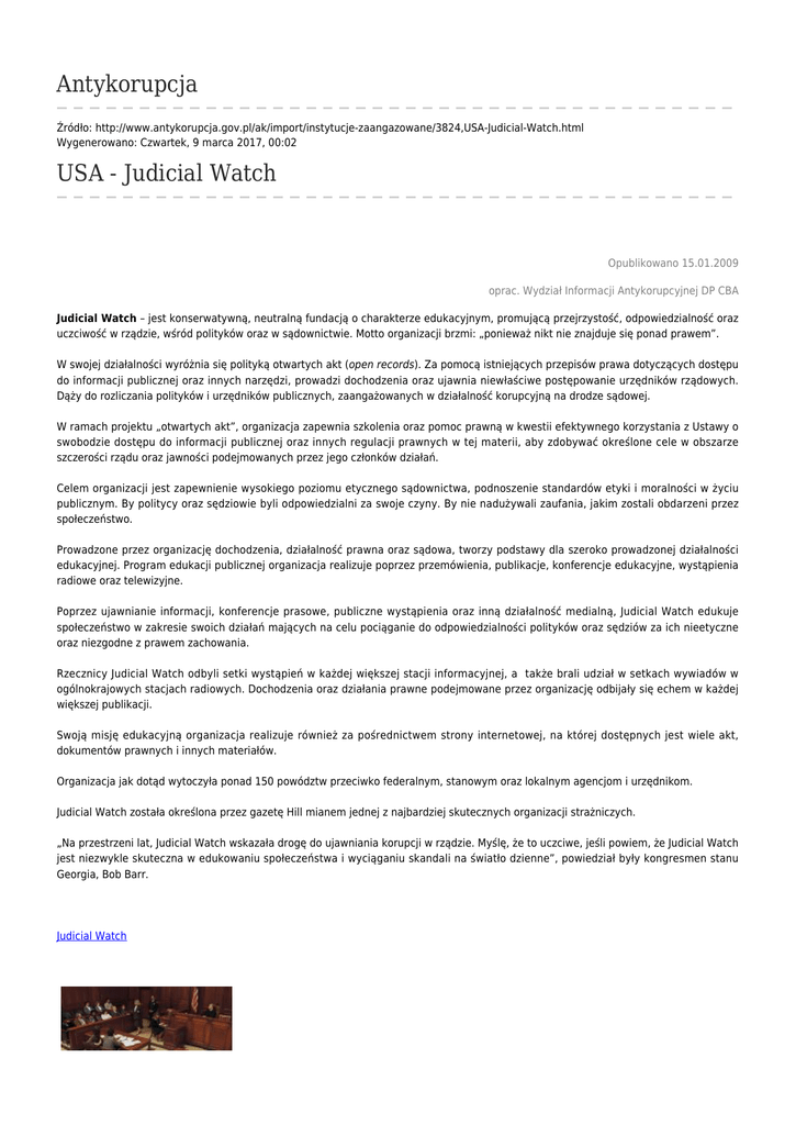 Antykorupcja Źródło: http://www.antykorupcja.gov.pl/ak/import/instytucje-zaangazowane/3824,USA-Judicial-Watch.html Wygenerowano: Czwartek, 9 marca 2017, 00:02 USA - Judicial Watch Opublikowano 15.01.2009 oprac. Wydział Informacji Antykorupcyjnej DP CBA Judicial Watch – jest konserwatywną, neutralną fundacją o charakterze edukacyjnym, promującą przejrzystość, odpowiedzialność oraz uczciwość w rządzie, wśród polityków oraz w sądownictwie. Motto organizacji brzmi: „ponieważ nikt nie znajduje się ponad prawem”. W swojej działalności wyróżnia się polityką otwartych akt (open records). Za pomocą istniejących przepisów prawa dotyczących dostępu do informacji publicznej oraz innych narzędzi, prowadzi dochodzenia oraz ujawnia niewłaściwe postępowanie urzędników rządowych. Dąży do rozliczania polityków i urzędników publicznych, zaangażowanych w działalność korupcyjną na drodze sądowej. W ramach projektu „otwartych akt”, organizacja zapewnia szkolenia oraz pomoc prawną w kwestii efektywnego korzystania z Ustawy o swobodzie dostępu do informacji publicznej oraz innych regulacji prawnych w tej materii, aby zdobywać określone cele w obszarze szczerości rządu oraz jawności podejmowanych przez jego członków działań. Celem organizacji jest zapewnienie wysokiego poziomu etycznego sądownictwa, podnoszenie standardów etyki i moralności w życiu publicznym. By politycy oraz sędziowie byli odpowiedzialni za swoje czyny. By nie nadużywali zaufania, jakim zostali obdarzeni przez społeczeństwo. Prowadzone przez organizację dochodzenia, działalność prawna oraz sądowa, tworzy podstawy dla szeroko prowadzonej działalności edukacyjnej. Program edukacji publicznej organizacja realizuje poprzez przemówienia, publikacje, konferencje edukacyjne, wystąpienia radiowe oraz telewizyjne. Poprzez ujawnianie informacji, konferencje prasowe, publiczne wystąpienia oraz inną działalność medialną, Judicial Watch edukuje społeczeństwo w zakresie swoich działań mających na celu pociąganie do odpowiedzialności polityków oraz sędziów za ich nieetyczne oraz niezgodne z prawem zachowania. Rzecznicy Judicial Watch odbyli setki wystąpień w każdej większej stacji informacyjnej, a także brali udział w setkach wywiadów w ogólnokrajowych stacjach radiowych. Dochodzenia oraz działania prawne podejmowane przez organizację odbijały się echem w każdej większej publikacji. Swoją misję edukacyjną organizacja realizuje również za pośrednictwem strony internetowej, na której dostępnych jest wiele akt, dokumentów prawnych i innych materiałów. Organizacja jak dotąd wytoczyła ponad 150 powództw przeciwko federalnym, stanowym oraz lokalnym agencjom i urzędnikom. Judicial Watch została określona przez gazetę Hill mianem jednej z najbardziej skutecznych organizacji strażniczych. „Na przestrzeni lat, Judicial Watch wskazała drogę do ujawniania korupcji w rządzie. Myślę, że to uczciwe, jeśli powiem, że Judicial Watch jest niezwykle skuteczna w edukowaniu społeczeństwa i wyciąganiu skandali na światło dzienne”, powiedział były kongresmen stanu Georgia, Bob Barr. Judicial Watch Drukuj Generuj PDF Powiadom znajomego Wstecz Ocena: 0/5 (0) liczba wejść: 405 instytucje zaangażowane, Judicial Watch, organizacja strażnicza, Stany Zjednoczone