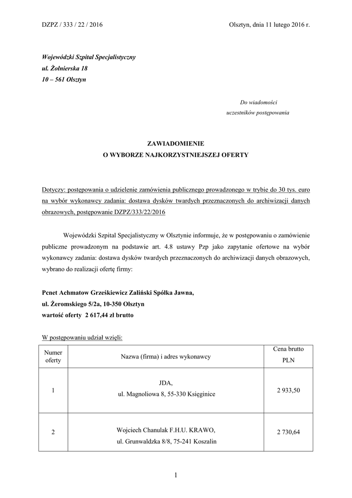 DZPZ / 333 / 22 / 2016 Olsztyn, dnia 11 lutego 2016 r. Wojewódzki Szpital Specjalistyczny ul. Żołnierska 18 10 – 561 Olsztyn Do wiadomości uczestników postępowania ZAWIADOMIENIE O WYBORZE NAJKORZYSTNIEJSZEJ OFERTY Dotyczy: postępowania o udzielenie zamówienia publicznego prowadzonego w trybie do 30 tys. euro na wybór wykonawcy zadania: dostawa dysków twardych przeznaczonych do archiwizacji danych obrazowych, postępowanie DZPZ/333/22/2016 Wojewódzki Szpital Specjalistyczny w Olsztynie informuje, że w postępowaniu o zamówienie publiczne prowadzonym na podstawie art. 4.8 ustawy Pzp jako zapytanie ofertowe na wybór wykonawcy zadania: dostawa dysków twardych przeznaczonych do archiwizacji danych obrazowych, wybrano do realizacji ofertę firmy: Pcnet Achmatow Grześkiewicz Zaliński Spółka Jawna, ul. Żeromskiego 5/2a, 10-350 Olsztyn wartość oferty 2 617,44 zł brutto W postępowaniu udział wzięli: Numer oferty Cena brutto Nazwa (firma) i adres wykonawcy PLN JDA, 1 ul. Magnoliowa 8, 55-330 Księginice 2 933,50 2 Wojciech Chanulak F.H.U. KRAWO, 2 730,64 ul. Grunwaldzka 8/8, 75-241 Koszalin 1 DZPZ / 333 / 22 / 2016 Olsztyn, dnia 11 lutego 2016 r. PHU Ingwar, 3 2 637,12 ul. Pana Tadeusza 20A/35, 10-461 Olsztyn Pcnet Achmatow Grześkiewicz Zaliński Spółka Jawna, 4 ul. Żeromskiego 5/2a, 10-350 Olsztyn 2 617,44 Uzasadnienie wyboru: Wybrana oferta w najwyższym stopniu wypełniła wymagania określone przez Zamawiającego w Zaproszeniu do złożenia oferty cenowej. Oferty odrzucone: 1. Oferta firmy JDA z Księginic. Treść oferty nie spełnia wymogów określonych w Zaproszeniu do złożenia oferty cenowej. Wykonawca nie dostarczył oświadczeń/dokumentów określonych w punktach V 4. i V 5. – katalogu / ulotki lub folderu zawierającego dokładne opisy zaoferowanego asortymentu w języku polskim, z zaznaczeniem której pozycji opisy dotyczą, (jeżeli katalog lub ulotka jest w języku obcym wymagane jest tłumaczenie na język polski); oświadczenia, że oferowany przedmiot zamówienia dopuszczony jest do obrotu i używania, posiada znak CE na potwierdzenie, że spełnia wszystkie stosowne wymagania prawne obowiązujące w UE m.in. wymagania dotyczące bezpieczeństwa, ochrony zdrowia czy środowiska naturalnego, oraz że oferowany asortyment jest dopuszczony do obrotu i stosowania na terenie Polski na podstawie świadectw: certyfikat wydany przez jednostkę notyfikowaną w UE (z aktualną datą ważności oraz identyfikujący producenta i typ wyrobu) lub deklaracja zgodności z wymogami dyrektyw Unii Europejskiej. W związku z powyższym, Zamawiający uznał ofertę firmy JDA za niezgodną z warunkami określonymi w Zaproszeniu do złożenia oferty cenowej. 2. Oferta firmy PHU Ingwar z Olsztyna. Treść oferty nie spełnia wymogów określonych w Zaproszeniu do złożenia oferty cenowej. Wykonawca nie dostarczył oświadczeń/dokumentów określonych w punktach V 4. i V 5. – katalogu / ulotki lub folderu zawierającego dokładne opisy zaoferowanego asortymentu w języku polskim, z zaznaczeniem której pozycji opisy dotyczą, (jeżeli katalog lub ulotka jest w języku obcym wymagane jest tłumaczenie na język polski); oświadczenia, że oferowany przedmiot zamówienia dopuszczony jest do obrotu i używania, posiada znak CE na potwierdzenie, że spełnia wszystkie stosowne wymagania prawne obowiązujące w UE m.in. wymagania dotyczące bezpieczeństwa, ochrony zdrowia czy środowiska naturalnego, oraz że oferowany asortyment jest dopuszczony do obrotu i 2 DZPZ / 333 / 22 / 2016 Olsztyn, dnia 11 lutego 2016 r. stosowania na terenie Polski na podstawie świadectw: certyfikat wydany przez jednostkę notyfikowaną w UE (z aktualną datą ważności oraz identyfikujący producenta i typ wyrobu) lub deklaracja zgodności z wymogami dyrektyw Unii Europejskiej. W związku z powyższym, Zamawiający uznał ofertę firmy PHU Ingwar za niezgodną z warunkami określonymi w Zaproszeniu do złożenia oferty cenowej. Podpisanie umowy: Umowa w sprawie zamówienia publicznego zostanie jednostronnie podpisana (3 egz.) i wysłana pocztą. DYREKTOR WOJEWÓDZKIEGO SZPITALA SPECJALISTYCZNEGO W OLSZTYNIE Irena Kierzkowska (Podpis osoby uprawnionej) 3