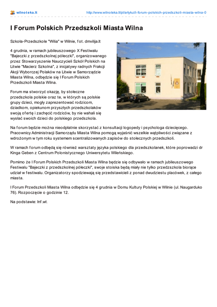 wilno t e ka.lt http://www.wilno teka.lt/pl/artykul/i-fo rum-po lskich-przedszko li-miasta-wilna-0 I Forum Polskich Przedszkoli Miasta Wilna Szkoła-Przedszkole "Wilia" w Wilnie, f ot. dmvilija.lt 4 grudnia, w ramach jubileuszowego X Festiwalu "Bajeczki z przedszkolnej półeczki", organizowanego przez Stowarzyszenie Nauczycieli Szkół Polskich na Litwie "Macierz Szkolna", z inicjatywy radnych Frakcji Akcji Wyborczej Polaków na Litwie w Samorządzie Miasta Wilna, odbędzie się I Forum Polskich Przedszkoli Miasta Wilna. Forum ma stworzyć okazję, by stołeczne przedszkola polskie oraz te, w których są polskie grupy dzieci, mogły zaprezentować rodzicom, dziadkom, opiekunom przyszłych przedszkolaków swoją of ertę i zachęcić rodziców, by nie wahali się wysłać swoich dzieci do polskiego przedszkola. Na f orum będzie można nieodpłatnie skorzystać z konsultacji logopedy i psychologa dziecięcego. Pracownicy Administracji Samorządu Miasta Wilna pomogą wyjaśnić wszelkie wątpliwości związane z wdrożonym w tym roku systemem scentralizowanych zapisów do stołecznych przedszkoli. W ramach f orum odbędą się również warsztaty języka polskiego dla przedszkolanek, które poprowadzi dr Kinga Geben z Centrum Polonistycznego Uniwersytetu Wileńskiego. Pomimo że I Forum Polskich Przedszkoli Miasta Wilna będzie się odbywało w ramach jubileuszowego Festiwalu "Bajeczki z przedszkolnej półeczki", swoje stoiska będą miały nie tylko przedzszkola biorące udział w f estiwalu. Organizatorzy spodziewają się przedstawicieli z ponad dwudziestu placówek, z całego miasta. I Forum Przedszkoli Miasta Wilna odbędzie się 4 grudnia w Domu Kultury Polskiej w Wilnie (ul. Naugarduko 76). Rozpoczęcie o godzinie 12. Na podstawie: Inf .wł.