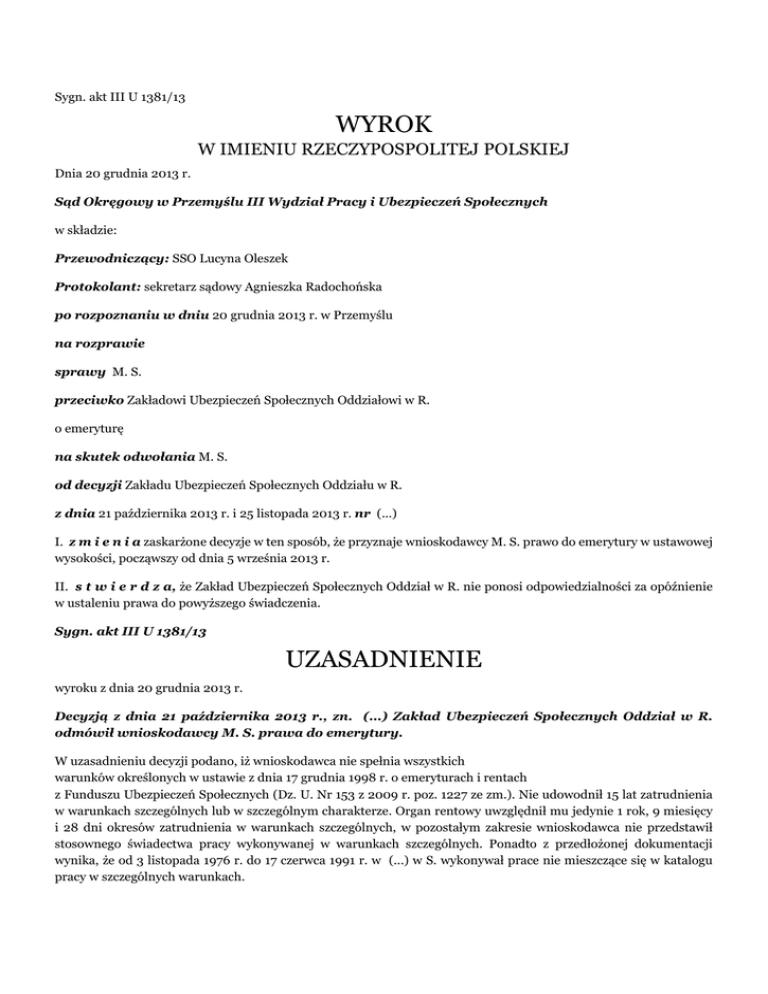 Sygn. akt III U 1381/13 WYROK W IMIENIU RZECZYPOSPOLITEJ POLSKIEJ Dnia 20 grudnia 2013 r. Sąd Okręgowy w Przemyślu III Wydział Pracy i Ubezpieczeń Społecznych w składzie: Przewodniczący: SSO Lucyna Oleszek Protokolant: sekretarz sądowy Agnieszka Radochońska po rozpoznaniu w dniu 20 grudnia 2013 r. w Przemyślu na rozprawie sprawy M. S. przeciwko Zakładowi Ubezpieczeń Społecznych Oddziałowi w R. o emeryturę na skutek odwołania M. S. od decyzji Zakładu Ubezpieczeń Społecznych Oddziału w R. z dnia 21 października 2013 r. i 25 listopada 2013 r. nr (...) I. z m i e n i a zaskarżone decyzje w ten sposób, że przyznaje wnioskodawcy M. S. prawo do emerytury w ustawowej wysokości, począwszy od dnia 5 września 2013 r. II. s t w i e r d z a, że Zakład Ubezpieczeń Społecznych Oddział w R. nie ponosi odpowiedzialności za opóźnienie w ustaleniu prawa do powyższego świadczenia. Sygn. akt III U 1381/13 UZASADNIENIE wyroku z dnia 20 grudnia 2013 r. Decyzją z dnia 21 października 2013 r., zn. (...) Zakład Ubezpieczeń Społecznych Oddział w R. odmówił wnioskodawcy M. S. prawa do emerytury. W uzasadnieniu decyzji podano, iż wnioskodawca nie spełnia wszystkich warunków określonych w ustawie z dnia 17 grudnia 1998 r. o emeryturach i rentach z Funduszu Ubezpieczeń Społecznych (Dz. U. Nr 153 z 2009 r. poz. 1227 ze zm.). Nie udowodnił 15 lat zatrudnienia w warunkach szczególnych lub w szczególnym charakterze. Organ rentowy uwzględnił mu jedynie 1 rok, 9 miesięcy i 28 dni okresów zatrudnienia w warunkach szczególnych, w pozostałym zakresie wnioskodawca nie przedstawił stosownego świadectwa pracy wykonywanej w warunkach szczególnych. Ponadto z przedłożonej dokumentacji wynika, że od 3 listopada 1976 r. do 17 czerwca 1991 r. w (...) w S. wykonywał prace nie mieszczące się w katalogu pracy w szczególnych warunkach. Kolejną decyzją z dnia 25 listopada 2013 r. organ rentowy ponownie odmówił wnioskodawcy prawa do emerytury. Organ rentowy wprawdzie uwzględnił wnioskodawcy dalszy okres zatrudnienia w warunkach szczególnych, łącznie w wymiarze 10 lat, 8 miesięcy i 6 dni. Natomiast nadal pominięto okres zatrudnienia w (...) w S. od 30 lipca 1979 r. do 8 września 1985 r. (6 lat, 1 miesiąc i 10 dni) ponieważ z przedstawionej dokumentacji nie wynika, że pracował wówczas jako kierowca samochodu ciężarowego powyżej 3,5 tony lub autobusu. W tym czasie miał wprawdzie powierzone stanowisko kierowcy, ale w warsztacie mechanicznym, ponadto był oddelegowany do prac polowych. Wnioskodawca M. S. złożył odwołania od obu decyzji, domagając się ich zmiany. Na uzasadnienie podał, że decyzje są dla niego krzywdzące. W czasie zatrudnienia w (...) w S. do czasu objęcia stanowiska operatora sieczkarni pracował wyłącznej jako kierowca samochodu ciężarowego oraz tzw. osinobusa. W odpowiedzi na odwołania organ rentowy wniósł o ich oddalenie z przyczyn, które stanowiły o wydaniu zaskarżonych decyzji. Ponownie stwierdzono, że wnioskodawca nie spełnia warunków do nabycia emerytury określonych w art. 184 ust. 1 w zw. z art. 27 i art. 32 ustawy z dnia 17 grudnia 1998 r. o emeryturach i rentach z Funduszu Ubezpieczeń Społecznych (Dz. U. Nr 153 z 2009 r., poz. 1227 ze zm.) oraz w zw. z § 2 rozporządzenia Rady Ministrów z dnia 7 lutego 1983 r. w sprawie wieku emerytalnego dla pracowników zatrudnianych w szczególnych warunkach lub w szczególnym charakterze. Podniesiono, że spośród ustawowych warunków wnioskodawca wykazał 25-letni staż ubezpieczeniowy oraz nie przystąpił do otwartego funduszu emerytalnego. Natomiast na dzień złożenia wniosku emerytalnego nie udowodnił 15 lat pracy w warunkach szczególnych. Okresów zatrudnienia w latach od 1979 r. do 1985 r. nie potwierdził właściwym świadectwem wykonywania pracy w szczególnych warunkach. Organ rentowy wskazał, że okresy pracy wykonywanej w warunkach szczególnych może potwierdzić jedynie zakład pracy, ewentualnie jego następca, na podstawie posiadanej dokumentacji i w ściśle określonej formie, zgodnie z § 2 ust. 2 powołanego rozporządzenia. Wnioskodawca przedstawił jedynie świadectwa pracy na potwierdzenie, że pracował na stanowisku kierowcy w warsztatach naprawczym i mechanicznym, poza tym był oddelegowywany do prac polowych. Brak podstaw do stwierdzenia, że we wskazanym okresie pracował jako kierowca samochodu ciężarowego powyżej 3.5 tony. Sąd Okręgowy w Przemyślu, III Wydział Pracy i Ubezpieczeń Społecznych ustalił następujący stan faktyczny: Wnioskodawca M. S. urodzony (...), w dniu 3 września 2013 r. wystąpił z wnioskiem o emeryturę, oświadczając że nie jest członkiem otwartego funduszu emerytalnego. Na potwierdzenie okresów ubezpieczenia oraz charakteru zatrudnienia przedłożył świadectwa pracy. W świadectwie z dnia 17 czerwca 1983 r. wraz z duplikatem z dnia 30 lipca 2013 r. wskazano, że wnioskodawca w okresie od 1 września 1969 r. do 30 września 1972 r. pracował w Państwowej (...) Oddział w P. jako uczeń praktycznej nauki zawodu, a następnie jako kierowca samochodu ciężarowego. W świadectwie wykonywania prac w szczególnych warunkach z dnia 30 lipca 2013 r. Wskazano ponadto, że w czasie tego zatrudnienia od 4 lipca do 30 września 1972 r. (2 miesiące, 26 dni) wnioskodawca wykonywał pracę na stanowisku kierowcy samochodu ciężarowego o dopuszczalnym ciężarze całkowitym powyżej 3,5 tony. W kolejnym świadectwie pracy z dnia 17 października 1974 r. wskazano, że w okresie od 1 października 1972 r. do 28 października 1974 r. (2 lata i 27 dni) wnioskodawca pracował w M. (...) w S. na stanowisku traktorzysty. Ponownie jako traktorzysta był zatrudniony od 2 grudnia 1974 r. do 30 czerwca 1976 r. (1 rok, 6 miesięcy i 28 dni) w (...) - w Zakładzie (...). W (...) Skarbu Państwa w S. pracował też od 3 listopada 1976 r. do 13 marca 1995 r. jako kierowca, operator sieczkarni i brygadzista oborowy. W