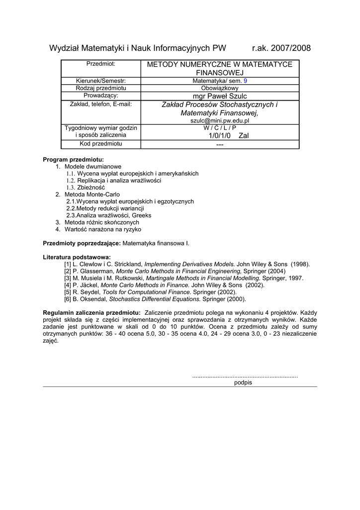 Wydział Matematyki i Nauk Informacyjnych PW r.ak. 2007/2008 Przedmiot: METODY NUMERYCZNE W MATEMATYCE FINANSOWEJ Kierunek/Semestr: Rodzaj przedmiotu Prowadzący: Zakład, telefon, E-mail: Matematyka/ sem. 9 Obowiązkowy mgr Paweł Szulc Zakład Procesów Stochastycznych i Matematyki Finansowej, Tygodniowy wymiar godzin i sposób zaliczenia Kod przedmiotu [email protected] W/Ć/L/P 1/0/1/0 --- Zal Program przedmiotu: 1. Modele dwumianowe 1.1. Wycena wypłat europejskich i amerykańskich 1.2. Replikacja i analiza wrażliwości 1.3. Zbieżność 2. Metoda Monte-Carlo 2.1.Wycena wypłat europejskich i egzotycznych 2.2.Metody redukcji wariancji 2.3.Analiza wrażliwości, Greeks 3. Metoda różnic skończonych 4. Wartość narażona na ryzyko Przedmioty poprzedzające: Matematyka finansowa I. Literatura podstawowa: [1] L. Clewlow i C. Strickland, Implementing Derivatives Models. John Wiley & Sons (1998). [2] P. Glasserman, Monte Carlo Methods in Financial Engineering, Springer (2004) [3] M. Musiela i M. Rutkowski, Martingale Methods in Financial Modelling. Springer, 1997. [4] P. Jäckel, Monte Carlo Methods in Finance. John Wiley & Sons (2002). [5] R. Seydel, Tools for Computational Finance. Springer (2002). [6] B. Oksendal, Stochastics Differential Equations. Springer (2000). Regulamin zaliczenia przedmiotu: Zaliczenie przedmiotu polega na wykonaniu 4 projektów. Każdy projekt składa się z części implementacyjnej oraz sprawozdania z otrzymanych wyników. Każde zadanie jest punktowane w skali od 0 do 10 punktów. Ocena z przedmiotu zależy od sumy otrzymanych punktów: 36 - 40 ocena 5.0, 30 - 35 ocena 4.0, 24 - 29 ocena 3.0, 0 - 23 niezaliczenie zajęć. ............................................................... podpis