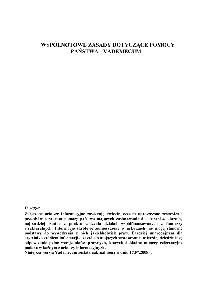 VADEMECUM - Wspólnotowe zasady dotyczące pomocy publicznej