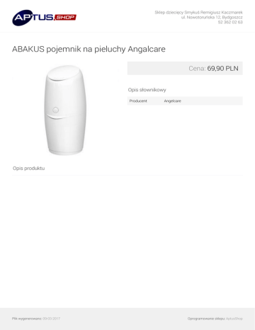 Sklep dziecięcy Smykuś Remigiusz Kaczmarek ul. Nowotoruńska 12, Bydgoszcz 52 362 02 63 ABAKUS pojemnik na pieluchy Angalcare Cena: 69,90 PLN Opis słownikowy Producent Angelcare Opis produktu Plik wygenerowano: 09-03-2017 Powered by TCPDF (www.tcpdf.org) Oprogramowanie sklepu: AptusShop