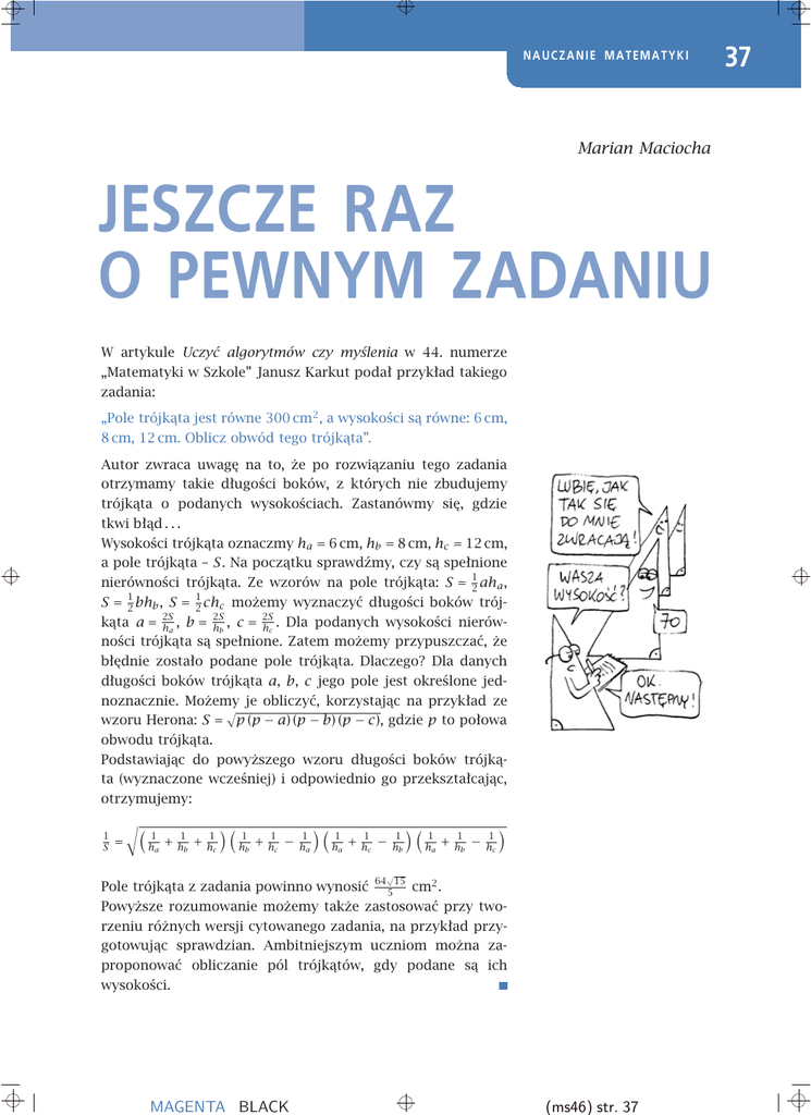 NAUCZANIE MATEMATYKI Marian Maciocha JESZCZE RAZ O PEWNYM ZADANIU W artykule Uczyć algorytmów czy myślenia w 44. numerze „Matematyki w Szkole” Janusz Karkut podał przykład takiego zadania: „Pole trójkąta jest równe 300 cm2 , a wysokości są równe: 6 cm, 8 cm, 12 cm. Oblicz obwód tego trójkąta”. Autor zwraca uwagę na to, że po rozwiązaniu tego zadania otrzymamy takie długości boków, z których nie zbudujemy trójkąta o podanych wysokościach. Zastanówmy się, gdzie tkwi błąd . . . Wysokości trójkąta oznaczmy ha = 6 cm, hb = 8 cm, hc = 12 cm, a pole trójkąta – S. Na początku sprawdźmy, czy są spełnione nierówności trójkąta. Ze wzorów na pole trójkąta: S = 12 aha , S = 12 bhb , S = 12 chc możemy wyznaczyć długości boków trój, b = 2S , c = 2S . Dla podanych wysokości nierówkąta a = 2S ha hb hc ności trójkąta są spełnione. Zatem możemy przypuszczać, że błędnie zostało podane pole trójkąta. Dlaczego? Dla danych długości boków trójkąta a, b, c jego pole jest określone jednoznacznie. Możemy je obliczyć, korzystając na przykład ze wzoru Herona: S = p (p − a) (p − b) (p − c), gdzie p to połowa obwodu trójkąta. Podstawiając do powyższego wzoru długości boków trójkąta (wyznaczone wcześniej) i odpowiednio go przekształcając, otrzymujemy: 1 S = 1 ha + 1 hb + 1 hc 1 hb + 1 hc − 1 ha 1 ha + 1 hc − 1 hb 1 ha + 1 hb − 1 hc √ Pole trójkąta z zadania powinno wynosić 64 5 15 cm2 . Powyższe rozumowanie możemy także zastosować przy tworzeniu różnych wersji cytowanego zadania, na przykład przygotowując sprawdzian. Ambitniejszym uczniom można zaproponować obliczanie pól trójkątów, gdy podane są ich wysokości. MAGENTA BLACK (ms46) str. 37 37
