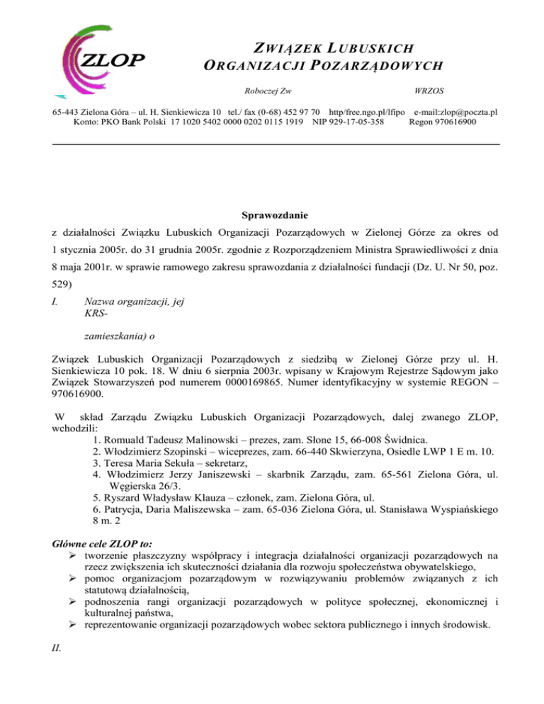 Z WIĄZEK L UBUSKICH O RGANIZACJI P OZARZĄDOWYCH Członek Wspólnoty Roboczej Związków Organizacji Socjalnych – WRZOS 65-443 Zielona Góra – ul. H. Sienkiewicza 10 tel./ fax (0-68) 452 97 70 http/free.ngo.pl/lfipo e-mail:[email protected] Konto: PKO Bank Polski 17 1020 5402 0000 0202 0115 1919 NIP 929-17-05-358 Regon 970616900 ORGANIZACJA POŻYTKU PUBLICZNEGO KRS NR 0000169865 Sprawozdanie z działalności Związku Lubuskich Organizacji Pozarządowych w Zielonej Górze za okres od 1 stycznia 2005r. do 31 grudnia 2005r. zgodnie z Rozporządzeniem Ministra Sprawiedliwości z dnia 8 maja 2001r. w sprawie ramowego zakresu sprawozdania z działalności fundacji (Dz. U. Nr 50, poz. 529) I. Nazwa organizacji, jej siedziba i adres, data wpisu w Krajowym Rejestrze Sądowym i numer KRS-u wraz ze statystycznym numerem identyfikacyjnym w systemie REGON, dane dotyczące członków zarządu (imię i nazwisko według ostatniego wpisu w rejestrze sądowym i adres zamieszkania) oraz określenie celów statutowych. Związek Lubuskich Organizacji Pozarządowych z siedzibą w Zielonej Górze przy ul. H. Sienkiewicza 10 pok. 18. W dniu 6 sierpnia 2003r. wpisany w Krajowym Rejestrze Sądowym jako Związek Stowarzyszeń pod numerem 0000169865. Numer identyfikacyjny w systemie REGON – 970616900. W skład Zarządu Związku Lubuskich Organizacji Pozarządowych, dalej zwanego ZLOP, wchodzili: 1. Romuald Tadeusz Malinowski – prezes, zam. Słone 15, 66-008 Świdnica. 2. Włodzimierz Szopinski – wiceprezes, zam. 66-440 Skwierzyna, Osiedle LWP 1 E m. 10. 3. Teresa Maria Sekuła – sekretarz, 4. Włodzimierz Jerzy Janiszewski – skarbnik Zarządu, zam. 65-561 Zielona Góra, ul. Węgierska 26/3. 5. Ryszard Władysław Klauza – członek, zam. Zielona Góra, ul. 6. Patrycja, Daria Maliszewska – zam. 65-036 Zielona Góra, ul. Stanisława Wyspiańskiego 8 m. 2 Główne cele ZLOP to: tworzenie płaszczyzny współpracy i integracja działalności organizacji pozarządowych na rzecz zwiększenia ich skuteczności działania dla rozwoju społeczeństwa obywatelskiego, pomoc organizacjom pozarządowym w rozwiązywaniu problemów związanych z ich statutową działalnością, podnoszenia rangi organizacji pozarządowych w polityce społecznej, ekonomicznej i kulturalnej państwa, reprezentowanie organizacji pozarządowych wobec sektora publicznego i innych środowisk. II. Zasady, formy i zakres działalności statutowej z podaniem realizacji celów statutowych, a także opis głównych zdarzeń prawnych w jej działalności o skutkach finansowych. ZLOP realizował swoje cele statutowe głównie poprzez: propagowanie celów statutowych organizacji pozarządowych w społeczeństwie, wspomaganie lokalnych i regionalnych ruchów pozarządowych, inicjowanie i opiniowanie prac legislacyjnych dotyczących organizacji pozarządowych i wszelkich działań obywatelskich oraz uczestniczenie w tych pracach, współpraca z administracją państwową i samorządową oraz innymi związkami organizacji, a także z przedstawicielami biznesu w kraju i za granicą, działalność na rzecz ochrony prawnej i finansowej członków ZLOP, występowanie z wnioskami do właściwych organów państwowych i samorządowych, gromadzenie i udostępnianie informacji oraz prowadzenie banku informacji, powoływanie komisji problemowych, prowadzenie działalności promocyjnej i szkoleniowej, zabieganie o środki finansowe i materialne, członkostwo i współpracę z podobnymi organizacjami i ruchami krajowymi i zagranicznymi, podejmowanie innych działań zmierzających do realizacji celów statutowych ZLOP, współpraca z mediami oraz prowadzenie wydawnictw i ich redakcji, organizowanie spotkań, prelekcji, wystaw i innych podobnych przedsięwzięć, promocja i organizację wolontariatu. OPIS PROWADZONYCH DZIAŁAŃ MERYTORYCZNYCH – według przedmiotu działalności statutowej organizacji pożytku publicznego 1. Propagowanie celów statutowych organizacji pozarządowych w społeczeństwie: 2. Wspomaganie lokalnych i regionalnych ruchów pozarządowych: 3. Inicjowanie i opiniowanie prac legislacyjnych dotyczących organizacji: pozarządowych i wszelkich działań obywatelskich oraz uczestniczenie w tych pracach: 4. Współpraca z administracją państwową i samorządową oraz innymi związkami organizacji, a także z przedstawicielami biznesu w kraju i zagranicą: Przy wsparciu Urzędu Marszałkowskiego zrealizowano projekty: a) „Wspieranie organizacji pozarządowych i grup samopomocowych – profesjonalizacja kadr pracujących w obszarze uzależnień”: - w ramach promocji projektu wydano cztery wkładki tematyczne do czasopisma „Nasz Wybór” , w których m. in. wskazano na zasady współpracy organizacji pozarządowych z administracją publiczną; omówiono tematykę ograniczania ryzyka uzależnienia dziecka; opisano działalność świetlicy socjoterapeutycznej – jako jednej z form działań stowarzyszeń. - w porozumieniu ze Starostami sporządzono listę stowarzyszeń i fundacji zarejestrowanym w Krajowym Rejestrze Sądowym oraz wpisanych do rejestru w Starostwie Powiatowym zajmujących się problematyką społeczną, w tym uzależnieniami, - prezes ZLOP uczestniczył w posiedzeniu Konwentu Starostów Lubuskich w Centrum Promocji i Szkolenia Województwa Lubuskiego w Przełazach, na którym m. in. zaprezentowano działalność Związku Lubuskich Organizacji Pozarządowych w 2 Kontekście wspierania i wyzwalania inicjatyw społecznych w powiatach oraz możliwość tworzenia reprezentacji powiatowych organizacji pozarządowych jako partnerów władz samorządowych, - utworzono grupę inicjatywną, której zadaniem było opracowanie koncepcji utworzenia systemu współpracy organizacji pozarządowych w powiatach i województwach. Nad tymi działaniami uzyskano zgodę Marszałka Województwa Lubuskiego na objęcie honorowego patronatu, - w 13 powiatach województwa lubuskiego zorganizowano Powiatowe Fora Organizacji Pozarządowych (