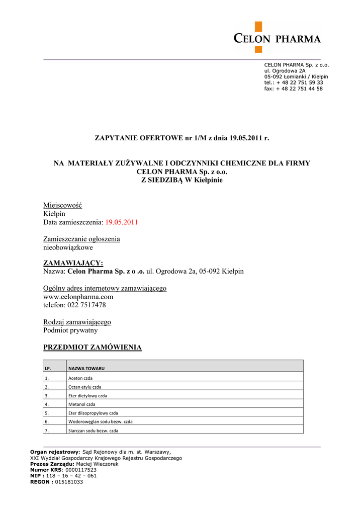 CELON PHARMA Sp. z o.o. ul. Ogrodowa 2A 05-092 Łomianki / Kiełpin tel.: + 48 22 751 59 33 fax: + 48 22 751 44 58 ZAPYTANIE OFERTOWE nr 1/M z dnia 19.05.2011 r. NA MATERIAŁY ZUŻYWALNE I ODCZYNNIKI CHEMICZNE DLA FIRMY CELON PHARMA Sp. z o.o. Z SIEDZIBĄ W Kiełpinie Miejscowość Kiełpin Data zamieszczenia: 19.05.2011 Zamieszczanie ogłoszenia nieobowiązkowe ZAMAWIAJĄCY: Nazwa: Celon Pharma Sp. z o .o. ul. Ogrodowa 2a, 05-092 Kiełpin Ogólny adres internetowy zamawiającego www.celonpharma.com telefon: 022 7517478 Rodzaj zamawiającego Podmiot prywatny PRZEDMIOT ZAMÓWIENIA LP. NAZWA TOWARU 1. Aceton czda 2. Octan etylu czda 3. Eter dietylowy czda 4. Metanol czda 5. Eter diizopropylowy czda 6. Wodorowęglan sodu bezw. czda 7. Siarczan sodu bezw. czda Organ rejestrowy: Sąd Rejonowy dla m. st. Warszawy, XXI Wydział Gospodarczy Krajowego Rejestru Gospodarczego Prezes Zarządu: Maciej Wieczorek Numer KRS: 0000117523 NIP : 118 – 16 – 42 – 061 REGON : 015181033 CELON PHARMA Sp. z o.o. ul. Ogrodowa 2A 05-092 Łomianki / Kiełpin tel.: + 48 22 751 59 33 fax: + 48 22 751 44 58 8. Difosforu pentatlenek czda 9. 4-Nitrobenzoic acid, 98% 10. 11. 12. 4-Methoxyphenyl isothiocyanate 97% eter dietylowy Petroleum Benzin 13. 14. Etylowy alkohol 96% Diwodorofosforan potasu 15. Siarczan cynku odważka analityczna 0.1 M 16. alkohol etylowy bezwodny 17. smar silikonowy do próżni 18. Mucasol 5l 19. Heptano-1-sulfonic acid sodium salt 20. Tlenek magnezu 21. Chlorek magnezu 22. N,N-Dimethylacetamide 23. Heksan do HPLC 99% 24. Anti-Rabbit IgG (whole molecule)–Peroxidase antibody produced in goat 25. Anti-Goat IgG (whole molecule)–Peroxidase antibody produced in rabbit 26. Anti-Mouse IgG (whole molecule)–Peroxidase antibody produced in rabbit 27. Serum, RT-100ml 28. propanol czysty 29. 30. Kolba stożkowa do zestawu filtracyjnego o pj. 1L Lejek do zestawu do filtracji do filtrów fi=25mm o pojemności 30ml, średnica zewnętrzna dolnej części lejka wynosi 40mm 31. Pipety pasteura 32. Pipety pasteura 33. System do filtracji Stericup 34. BD Falcon Pipety serologiczne 5ml 35. BD Falcon Pipety serologiczne 10ml 36. BD Falcon Pipety serologiczne 25ml 37. BD Falcon Butelki do hodowli 25cm2 38. BD Falcon Butelki do hodowli 75cm2 39. BD Falcon Płytki 96dołkowe, bezbarwne 40. BD Falcon Płytki 6dołkowe 41. BD Falcon Płytki 96dołkowe, czarne z przezroczystym dnem 42. BD Falcon Płytki 96dołkowe, białe z przezroczystym dnem 43. BD Falcon Falkony 15ml 44. BD Falcon Falkony 50ml 45. Axygen Końcówki do pipet, sterylne 200 μl Organ rejestrowy: Sąd Rejonowy dla m. st. Warszawy, XXI Wydział Gospodarczy Krajowego Rejestru Gospodarczego Prezes Zarządu: Maciej Wieczorek Numer KRS: 0000117523 NIP : 118 – 16 – 42 – 061 REGON : 015181033 CELON PHARMA Sp. z o.o. ul. Ogrodowa 2A 05-092 Łomianki / Kiełpin tel.: + 48 22 751 59 33 fax: + 48 22 751 44 58 46. Axygen Końcówki do pipet, sterylne 1000 μl 47. Axygen Eppendorfy 1,5 ml 48. Axygen Eppendorfy 0,5 ml 49. propanol czysty · Czy dopuszcza się złożenie oferty częściowej tak · Czy dopuszcza się złożenie oferty wariantowej nie · Orientacyjny termin rozpoczęcia zakupów Rozpoczęcie 25-05-2011 · Orientacyjny termin zakończenia zakupów Zakończenie 25-05-2011 PROCEDURA · Tryb udzielenia zamówienia Zapytanie ofertowe · Kryteria oceny ofert cena 25% jakość 50% termin dostawy 25% dodatkową specyfikację można uzyskać pod adresem: ul. Celon Pharma Sp. z o .o. ul. Mokra 41a, 05-092 Kiełpin osoby kontaktowe: Paulina Jasińska · Termin składania ofert do dnia 23-05-2011 r. Organ rejestrowy: Sąd Rejonowy dla m. st. Warszawy, XXI Wydział Gospodarczy Krajowego Rejestru Gospodarczego Prezes Zarządu: Maciej Wieczorek Numer KRS: 0000117523 NIP : 118 – 16 – 42 – 061 REGON : 015181033