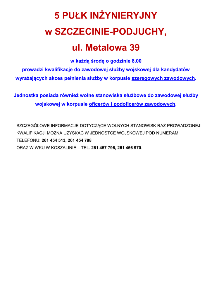 5 PUŁK INŻYNIERYJNY w SZCZECINIE-PODJUCHY, ul. Metalowa 39 w każdą środę o godzinie 8.00 prowadzi kwalifikacje do zawodowej służby wojskowej dla kandydatów wyrażających akces pełnienia służby w korpusie szeregowych zawodowych. Jednostka posiada również wolne stanowiska służbowe do zawodowej służby wojskowej w korpusie oficerów i podoficerów zawodowych. SZCZEGÓŁOWE INFORMACJE DOTYCZĄCE WOLNYCH STANOWISK RAZ PROWADZONEJ KWALIFIKACJI MOŻNA UZYSKAĆ W JEDNOSTCE WOJSKOWEJ POD NUMERAMI TELEFONU: 261 454 513, 261 454 788 ORAZ W WKU W KOSZALINIE – TEL. 261 457 796, 261 456 970.