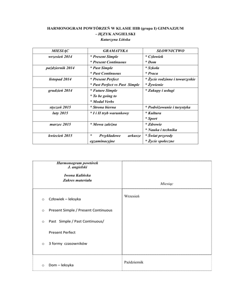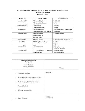 HARMONOGRAM POWTÓRZEŃ W KLASIE IIIB (grupa I) GIMNAZJUM - JĘZYK ANGIELSKI Katarzyna Lińska MIESIĄC wrzesień 2014 SŁOWNICTWO GRAMATYKA * Present Simple * Present Continuous * Człowiek * Dom * Past Simple * Past Continuous * Szkoła * Praca listopad 2014 * Present Perfect * Past Perfect vs Past Simple * Życie rodzinne i towarzyskie * Żywienie grudzień 2014 * Future Simple * To be going to * Modal Verbs * Zakupy i usługi styczeń 2015 * Strona bierna * Podróżowanie i turystyka * I i II tryb warunkowy * Kultura * Sport * Mowa zależna * Zdrowie * Nauka i technika październik 2014 luty 2015 marzec 2015 kwiecień 2015 * Przykładowe egzaminacyjne arkusze * Świat przyrody * Życie społeczne Harmonogram powtórek J. angielski Iwona Kalińska Zakres materiału o Człowiek – leksyka o Present Simple / Present Continuous o Past Simple / Past Continuous/ Miesiąc Wrzesień Present Perfect o 3 formy czasowników o Dom – leksyka Październik o Szkoła – leksyka o Utrwalenie podstawowych czasów gramatycznych o Praca – leksyka o Życie rodzinne i towarzyskie – leksyka o Past Perfect o be going to / will o Żywienie – leksyka o Zakupy i usługi – leksyka o Czasowniki modalne o Podróżowanie i turystyka – leksyka o Strona bierna o Kultura – leksyka o Sport – leksyka o Mowa zależna o Zdrowie – leksyka o Nauka i technika – leksyka Listopad Grudzień Styczeń Luty Marzec o I / II tryb warunkowy o Świat przyrody – leksyka o Życie społeczne – leksyka Kwiecień