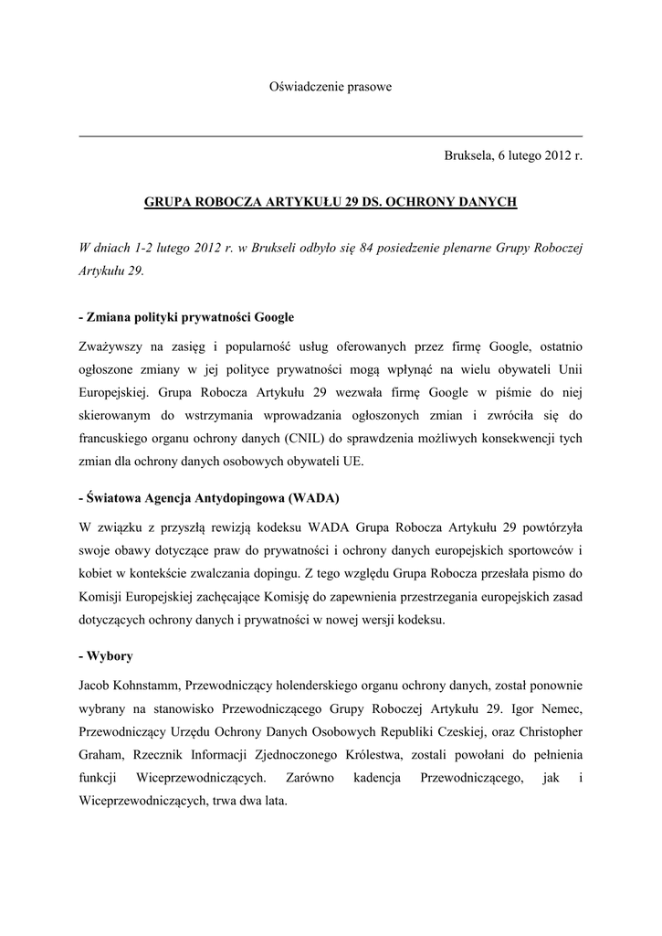 Oświadczenie prasowe Bruksela, 6 lutego 2012 r. GRUPA ROBOCZA ARTYKUŁU 29 DS. OCHRONY DANYCH W dniach 1-2 lutego 2012 r. w Brukseli odbyło się 84 posiedzenie plenarne Grupy Roboczej Artykułu 29. - Zmiana polityki prywatności Google Zważywszy na zasięg i popularność usług oferowanych przez firmę Google, ostatnio ogłoszone zmiany w jej polityce prywatności mogą wpłynąć na wielu obywateli Unii Europejskiej. Grupa Robocza Artykułu 29 wezwała firmę Google w piśmie do niej skierowanym do wstrzymania wprowadzania ogłoszonych zmian i zwróciła się do francuskiego organu ochrony danych (CNIL) do sprawdzenia możliwych konsekwencji tych zmian dla ochrony danych osobowych obywateli UE. - Światowa Agencja Antydopingowa (WADA) W związku z przyszłą rewizją kodeksu WADA Grupa Robocza Artykułu 29 powtórzyła swoje obawy dotyczące praw do prywatności i ochrony danych europejskich sportowców i kobiet w kontekście zwalczania dopingu. Z tego względu Grupa Robocza przesłała pismo do Komisji Europejskiej zachęcające Komisję do zapewnienia przestrzegania europejskich zasad dotyczących ochrony danych i prywatności w nowej wersji kodeksu. - Wybory Jacob Kohnstamm, Przewodniczący holenderskiego organu ochrony danych, został ponownie wybrany na stanowisko Przewodniczącego Grupy Roboczej Artykułu 29. Igor Nemec, Przewodniczący Urzędu Ochrony Danych Osobowych Republiki Czeskiej, oraz Christopher Graham, Rzecznik Informacji Zjednoczonego Królestwa, zostali powołani do pełnienia funkcji Wiceprzewodniczących. Zarówno Wiceprzewodniczących, trwa dwa lata. kadencja Przewodniczącego, jak i - Spotkanie z przedstawicielami Federalnej Komisji Handlu (FTC) oraz Organizacji Współpracy Gospodarczej i Rozwoju (OECD) Grupa Robocza spotkała się z Davidem Vladeck, Dyrektorem Biura Ochrony Konsumentów, oraz Stacy Feuer, Zastępcą Dyrektora ds. Międzynarodowej Ochrony Konsumentów w Urzędzie Spraw Międzynarodowych w FTC. Pan Vladeck poinformował o wydarzeniach dotyczących ochrony danych i prywatności w Stanach Zjednoczonych oraz o ostatnich działaniach wdrażających FTC w tym obszarze. Grupa Robocza oraz pan Vladeck omówili kwestie istotne dla wszystkich zainteresowanych oraz zobowiązali się do kontynuowania bliskiej współpracy w celu zapewnienia jak największej zbieżności podejść po obu stronach Atlantyku. Grupa Robocza spotkała się także z Michaelem Donohue, starszym specjalistą ds. polityki w zakresie bezpieczeństwa informacji i prywatności w OECD. Pan Donohue przedstawił informacje na temat trwającego przeglądu wytycznych OECD dotyczących prywatności, istniejących już od 1980 roku. Informacje ogólne Grupa Robocza Artykułu 29 ds. ochrony osób fizycznych w zakresie przetwarzania danych osobowych to niezależny organ doradczy w sprawach ochrony danych i prywatności, powołany na mocy artykułu 29 Dyrektywy o ochronie danych 95/46/WE. W skład tego organu wchodzą przedstawiciele krajowych organów ochrony danych z państw członkowskich UE, Europejskiego Inspektora Ochrony Danych oraz Komisji Europejskiej. Jego zadania opisane zostały w artykule 30 Dyrektywy 95/46/WE i artykule 15 Dyrektywy 2002/58/WE. Do kompetencji Grupy Roboczej Artykułu 29 należy badanie kwestii dotyczących zastosowania dyrektyw o ochronie danych w celu przyczynienia się do jednolitego stosowania dyrektyw. Grupa Robocza realizuje to zadanie wydając rekomendacje, opinie i dokumenty robocze. http://ec.europa.eu/justice/data-protection/article-29/index_en.htm