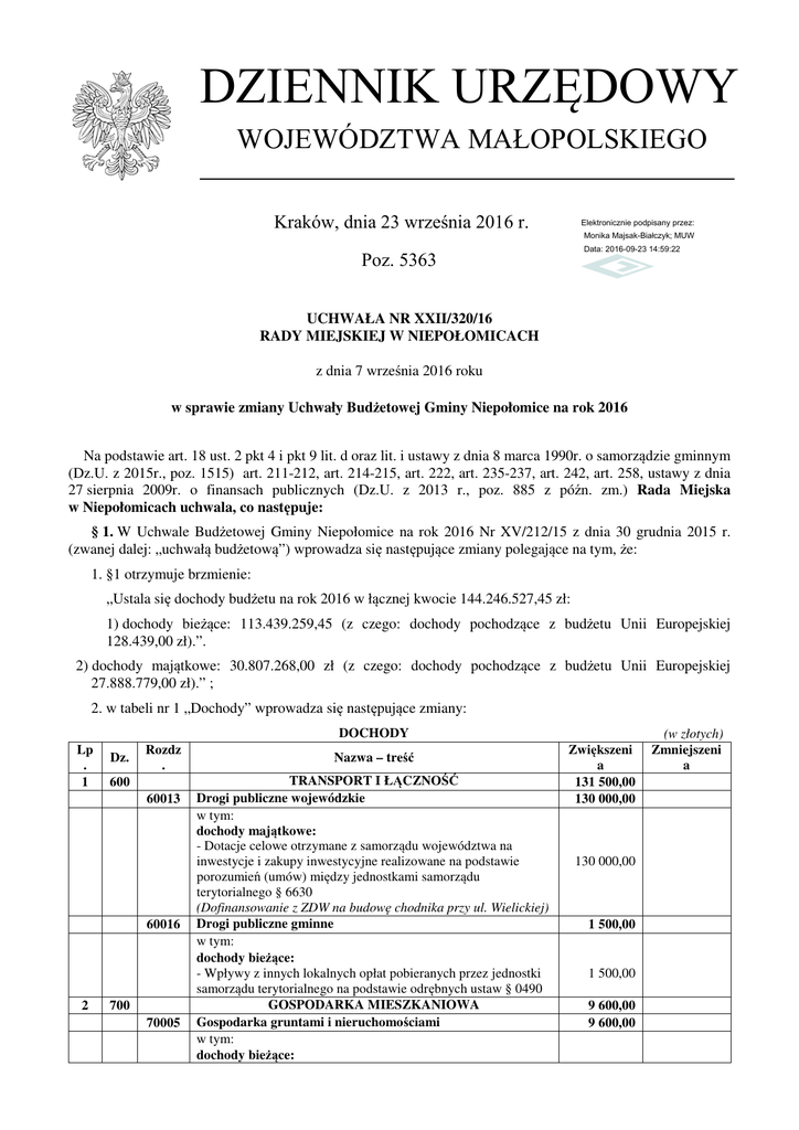 DZIENNIK URZĘDOWY WOJEWÓDZTWA MAŁOPOLSKIEGO Kraków, dnia 23 września 2016 r. Elektronicznie podpisany przez: Monika Majsak-Białczyk; MUW Data: 2016-09-23 14:59:22 Poz. 5363 UCHWAŁA NR XXII/320/16 RADY MIEJSKIEJ W NIEPOŁOMICACH z dnia 7 września 2016 roku w sprawie zmiany Uchwały Budżetowej Gminy Niepołomice na rok 2016 Na podstawie art. 18 ust. 2 pkt 4 i pkt 9 lit. d oraz lit. i ustawy z dnia 8 marca 1990r. o samorządzie gminnym (Dz.U. z 2015r., poz. 1515) art. 211-212, art. 214-215, art. 222, art. 235-237, art. 242, art. 258, ustawy z dnia 27 sierpnia 2009r. o finansach publicznych (Dz.U. z 2013 r., poz. 885 z późn. zm.) Rada Miejska w Niepołomicach uchwala, co następuje: § 1. W Uchwale Budżetowej Gminy Niepołomice na rok 2016 Nr XV/212/15 z dnia 30 grudnia 2015 r. (zwanej dalej: „uchwałą budżetową”) wprowadza się następujące zmiany polegające na tym, że: 1. §1 otrzymuje brzmienie: „Ustala się dochody budżetu na rok 2016 w łącznej kwocie 144.246.527,45 zł: 1) dochody bieżące: 113.439.259,45 (z czego: dochody pochodzące z budżetu Unii Europejskiej 128.439,00 zł).”. 2) dochody majątkowe: 30.807.268,00 zł (z czego: dochody pochodzące z budżetu Unii Europejskiej 27.888.779,00 zł).” ; 2. w tabeli nr 1 „Dochody” wprowadza się następujące zmiany: DOCHODY Lp . 1 Dz. Rozdz . 600 60013 60016 2 700 70005 Nazwa – treść TRANSPORT I ŁĄCZNOŚĆ Drogi publiczne wojewódzkie w tym: dochody majątkowe: - Dotacje celowe otrzymane z samorządu województwa na inwestycje i zakupy inwestycyjne realizowane na podstawie porozumień (umów) między jednostkami samorządu terytorialnego § 6630 (Dofinansowanie z ZDW na budowę chodnika przy ul. Wielickiej) Drogi publiczne gminne w tym: dochody bieżące: - Wpływy z innych lokalnych opłat pobieranych przez jednostki samorządu terytorialnego na podstawie odrębnych ustaw § 0490 GOSPODARKA MIESZKANIOWA Gospodarka gruntami i nieruchomościami w tym: dochody bieżące: Zwiększeni a 131 500,00 130 000,00 130 000,00 1 500,00 1 500,00 9 600,00 9 600,00 (w złotych) Zmniejszeni a Dziennik Urzędowy Województwa Małopolskiego –2– - Wpływy z opłat za trwały zarząd, użytkowanie i służebności § 0470 - Wpływy z różnych opłat § 0690 - Wpływy z pozostałych odsetek § 0920 3 710 71004 4 750 75023 5 752 75212 6 756 75615 75621 7 801 80101 80104 80106 DZIAŁALNOŚĆ USŁUGOWA Plany zagospodarowania przestrzennego w tym: dochody bieżące: - Wpływy z innych lokalnych opłat pobieranych przez jednostki samorządu terytorialnego na podstawie odrębnych ustaw § 0490 ADMINISTRACJA PUBLICZNA Urzędy gmin (miast i miast na prawach powiatu) w tym: dochody bieżące: - Wpływy z różnych opłat § 0690 - Wpływy z otrzymanych spadków, zapisów i darowizn w postaci pieniężnej § 0960 - Wpływy z różnych dochodów § 0970 OBRONA NARODOWA Pozostałe wydatki obronne w tym: dochody bieżące: - Wpływy z różnych dochodów § 0970 DOCHODY OD OSÓB PRAWNYCH, OD OSÓB FIZYCZNYCH I OD INNYCH JEDNOSTEK NIEPOSIADAJĄCYCH OSOBOWOŚCI PRAWNEJ ORAZ WYDATKI ZWIĄZANE Z ICH POBOREM Wpływy z podatku rolnego, podatku leśnego, podatku od czynności cywilnoprawnych, podatków i opłat lokalnych od osób prawnych i innych jednostek organizacyjnych w tym: dochody bieżące: - Wpływy z podatku od środków transportowych §0340 - Wpływy z podatku od czynności cywilnoprawnych § 0500 Udziały gmin w podatkach stanowiących dochód budżetu państwa w tym: dochody bieżące: - Wpływy z podatku dochodowego od osób prawnych § 0020 OŚWIATA I WYCHOWANIE Szkoły podstawowe w tym: dochody bieżące: - Wpływy z różnych opłat § 0690 - Wpływy z usług § 0830 - Wpływy z otrzymanych spadków, zapisów i darowizn § 0960 - Wpływy z różnych dochodów § 0970 Przedszkola w tym: dochody bieżące: - Wpływy z usług § 0830 - Wpływy z pozostałych odsetek § 0920 Inne formy wychowania pozaszkolnego w tym: dochody bieżące: Poz. 5363 5 000,00 3 100,00 1 500,00 42 000,00 42 000,00 42 000,00 10 600,00 10 600,00 2 500,00 100,00 8 000,00 2 200,00 2 200,00 2 200,00 1 007 000,00 17 800,00 7 000,00 17 800,00 17 800,00 7 000,00 1 000 000,0 0 1 000 000,0 0 34 560,00 7 160,00 110,00 5 000,00 500,00 1 550,00 4 200,00 4 000,00 200,00 13 000,00 Dziennik Urzędowy Województwa Małopolskiego 80130 80140 8 852 85202 85212 85216 85219 9 900 90019 90095 10 921 92195 –3– - Wpływy z opłat za korzystanie z wyżywienia w jednostkach realizujących zadania z zakresu wychowania przedszkolnego § 0670 Szkoły zawodowe w tym: dochody bieżące: - Wpływy z usług § 0830 Centra kształcenia ustawicznego i praktycznego oraz ośrodki dokształcania zawodowego w tym: dochody bieżące: - Wpływy z usług § 0830 POMOC SPOŁECZNA Domy pomocy społecznej w tym: dochody majątkowe: - Dotacje celowe w ramach programów finansowanych z udziałem środków europejskich oraz środków, o których mowa w art.5 ust.1 pkt. 3 oraz ust. 3 pkt 5 i 6 ustawy, lub płatności w ramach budżetu środków europejskich, z wyłączeniem dochodów klasyfikowanych w paragrafie 625 § 6207 (Płatność końcowa projektu „Budowa Domu Spokojnej Starości w Staniątkach”) Świadczenia rodzinne, świadczenie z funduszu alimentacyjnego oraz składki na ubezpieczenia emerytalne i rentowe z ubezpieczenia społecznego w tym: dochody bieżące: - Wpływy z różnych opłat § 0690 - Wpływy z pozostałych odsetek § 0920 - Wpływy z różnych dochodów § 0970 Zasiłki stałe w tym: dochody bieżące: - Wpływy z różnych dochodów § 0970 Ośrodki pomocy społecznej w tym: dochody bieżące: - Wpływy z różnych opłat § 0690 GOSPODARKA KOMUNALNA I OCHRONA ŚRODOWISKA Wpływy i wydatki związane z gromadzeniem środków z opłat i kar za korzystanie ze środowiska w tym: dochody bieżące: - Wpływy z tytułu grzywien, mandatów i innych kar pieniężnych od osób fizycznych § 0570 Pozostała działalność w tym: dochody bieżące: - Wpływy z róż