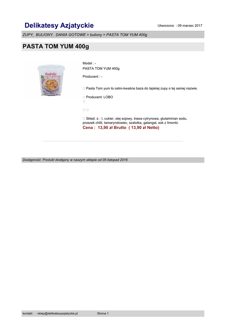 Delikatesy Azjatyckie Utworzono : 09 marzec 2017 ZUPY, BULIONY, DANIA GOTOWE > buliony > PASTA TOM YUM 400g PASTA TOM YUM 400g Model : PASTA TOM YUM 400g Producent : Pasta Tom yum to ostro-kwaśna baza do tajskiej zupy o tej samej nazwie. Producent: LOBO � Skład: s�l, cukier, olej sojowy, trawa cytrynowa, glutaminian sodu, proszek chilli, tamaryndowiec, szalotka, galangal, sok z limonki. Cena : 13,90 zł Brutto ( 13,90 zł Netto) Dostępność: Produkt dostępny w naszym sklepie od 05 listopad 2016 kontakt : - [email protected] Strona 1