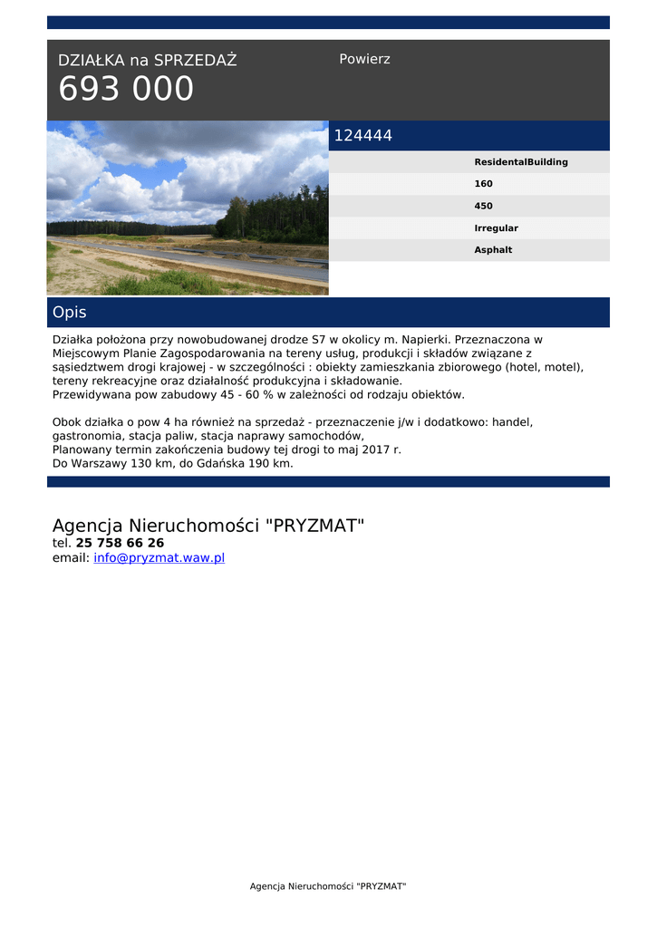 DZIAŁKA na SPRZEDAŻ Powierz 693 000 124444 ResidentalBuilding 160 450 Irregular Asphalt Opis Działka położona przy nowobudowanej drodze S7 w okolicy m. Napierki. Przeznaczona w Miejscowym Planie Zagospodarowania na tereny usług, produkcji i składów związane z sąsiedztwem drogi krajowej - w szczególności : obiekty zamieszkania zbiorowego (hotel, motel), tereny rekreacyjne oraz działalność produkcyjna i składowanie. Przewidywana pow zabudowy 45 - 60 % w zależności od rodzaju obiektów. Obok działka o pow 4 ha również na sprzedaż - przeznaczenie j/w i dodatkowo: handel, gastronomia, stacja paliw, stacja naprawy samochodów, Planowany termin zakończenia budowy tej drogi to maj 2017 r. Do Warszawy 130 km, do Gdańska 190 km. Agencja Nieruchomości "PRYZMAT" tel. 25 758 66 26 email: [email protected] Agencja Nieruchomości "PRYZMAT" Powered by TCPDF (www.tcpdf.org)
