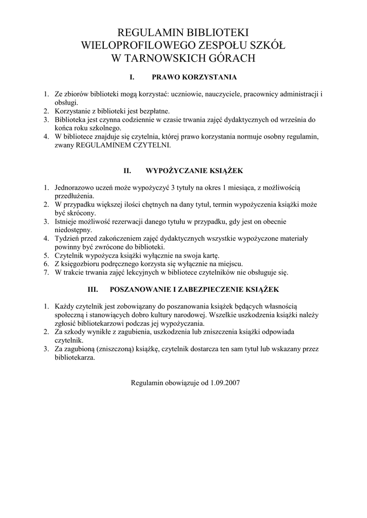 REGULAMIN BIBLIOTEKI WIELOPROFILOWEGO ZESPOŁU SZKÓŁ W TARNOWSKICH GÓRACH I. PRAWO KORZYSTANIA 1. Ze zbiorów biblioteki mogą korzystać: uczniowie, nauczyciele, pracownicy administracji i obsługi. 2. Korzystanie z biblioteki jest bezpłatne. 3. Biblioteka jest czynna codziennie w czasie trwania zajęć dydaktycznych od września do końca roku szkolnego. 4. W bibliotece znajduje się czytelnia, której prawo korzystania normuje osobny regulamin, zwany REGULAMINEM CZYTELNI. II. WYPOŻYCZANIE KSIĄŻEK 1. Jednorazowo uczeń może wypożyczyć 3 tytuły na okres 1 miesiąca, z możliwością przedłużenia. 2. W przypadku większej ilości chętnych na dany tytuł, termin wypożyczenia książki może być skrócony. 3. Istnieje możliwość rezerwacji danego tytułu w przypadku, gdy jest on obecnie niedostępny. 4. Tydzień przed zakończeniem zajęć dydaktycznych wszystkie wypożyczone materiały powinny być zwrócone do biblioteki. 5. Czytelnik wypożycza książki wyłącznie na swoja kartę. 6. Z księgozbioru podręcznego korzysta się wyłącznie na miejscu. 7. W trakcie trwania zajęć lekcyjnych w bibliotece czytelników nie obsługuje się. III. POSZANOWANIE I ZABEZPIECZENIE KSIĄŻEK 1. Każdy czytelnik jest zobowiązany do poszanowania książek będących własnością społeczną i stanowiących dobro kultury narodowej. Wszelkie uszkodzenia książki należy zgłosić bibliotekarzowi podczas jej wypożyczania. 2. Za szkody wynikłe z zagubienia, uszkodzenia lub zniszczenia książki odpowiada czytelnik. 3. Za zagubioną (zniszczoną) książkę, czytelnik dostarcza ten sam tytuł lub wskazany przez bibliotekarza. Regulamin obowiązuje od 1.09.2007 REGULAMIN CZYTELNI 1. Z czytelni może korzystać każdy po wcześniejszym okazaniu dokumentu tożsamości i wpisaniu się do zeszytu odwiedzin. 2. W czytelni użytkownik może korzystać z całości księgozbioru biblioteki. 3. W czytelni obowiązuje cisza, aby umożliwić pracę innym użytkownikom. 4. W czytelni obowiązuje zakaz spożywania posiłków i picia napojów. 5. Materiały biblioteczne podaje bibliotekarz. 6. Po skończonej pracy czytelnik porządkuje stanowisko pracy i zwraca bibliotekarzowi materiały, z których korzystał. Regulamin obowiązuje od 1.09.2007. Regulamin Szkolnego Centrum Informacji 1. Szkolne Centrum Informacji ma za zadanie ułatwić dostęp do informacji oraz rozwinąć umiejętność korzystania z komputera i sieci Internet. 2. Korzystanie ze Szkolnego Centrum Informacji jest bezpłatne. 3. Szkolne Centrum Informacji czynne jest w godzinach pracy biblioteki szkolnej. 4. Z usług świadczonych przez Centrum może korzystać każda osoba, która zapozna się niniejszym regulaminem oraz wyjaśnieniami pracowników biblioteki na temat warunków obsługi technicznej sprzętu. 5. W przypadku potrzeby skorzystania z drukarki, stacji dysków, nagrywarki DVD osoba jest zobowiązana do uzgodnienia i ustalenia tych działań z obsługą Centrum. 6. Osoby korzystające z wyposażenia Centrum zobowiązane są: - wpisać swoje imię i nazwisko oraz cel wizyty do zeszytu odwiedzin, co oznacza zapoznanie się z regulaminem - dbać o sprzęt komputerowy i biurowy - zachować ciszę i spokój 7. Użytkownikowi korzystającemu ze sprzętu komputerowego zabrania się: - instalowania jakiegokolwiek oprogramowania bez zgody pracowników - korzystania z komunikatorów, czatów, gier, stron o treściach pornograficznych, erotycznych i rasistowskich oraz innych powszechnie uznawanych za szkodliwe społecznie - korzystania z Centrum podczas zajęć lekcyjnych odbywających się w bibliotece 8. Użytkownik zobowiązany jest do niezwłocznego powiadomienia o wystąpieniu zakłóceń pracy komputera lub innych usterek technicznych. 9. Użytkownik ponosi odpowiedzialność materialną za szkody powstałe z jego winy. 10. W przypadku dużego zainteresowania korzystaniem ze sprzętu Centrum, wyznaczone zostaną ramy czasowe dostępu do sprzętu przez jedną osobę . 11. Z jednego stanowiska pracy może korzystać w danej chwili tylko jedna osoba. 12. W pracowni przy stanowiskach komputerowych (podobnie jak w czytelni biblioteki) obowiązuje zakaz spożywania posiłków i picia napojów. 13. Obsługa Centrum nie ponosi odpowiedzialności za szkody wynikłe w skutek wadliwego działania komputera. 14. Pracownik Centrum może odmówić dostępu do komputera, jeżeli uzna, że użytkownik wykonuje czynności niepożądane, nawet jeśli nie są one ujęte w niniejszym regulaminie. 15. Niezastosowanie się do powyższych punktów regulaminu może skutkować zakazem korzystania z Centrum. Przepisy regulaminu dotyczą wszystkich osób korzystających. Regulamin obowiązuje od 1.09.2007.