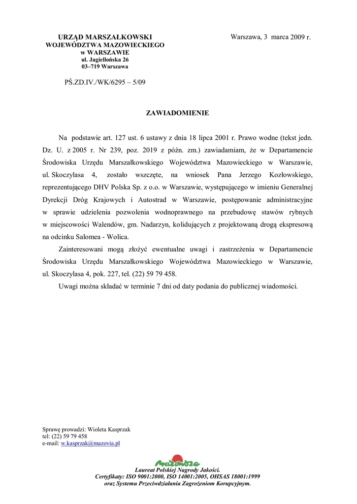Warszawa, 3 marca 2009 r. URZĄD MARSZAŁKOWSKI WOJEWÓDZTWA MAZOWIECKIEGO w WARSZAWIE ul. Jagiellońska 26 03–719 Warszawa PŚ.ZD.IV./WK/6295 – 5/09 ZAWIADOMIENIE Na podstawie art. 127 ust. 6 ustawy z dnia 18 lipca 2001 r. Prawo wodne (tekst jedn. Dz. U. z 2005 r. Nr 239, poz. 2019 z późn. zm.) zawiadamiam, że w Departamencie Środowiska Urzędu Marszałkowskiego Województwa Mazowieckiego w Warszawie, ul. Skoczylasa 4, zostało wszczęte, na wniosek Pana Jerzego Kozłowskiego, reprezentującego DHV Polska Sp. z o.o. w Warszawie, występującego w imieniu Generalnej Dyrekcji Dróg Krajowych i Autostrad w Warszawie, postępowanie administracyjne w sprawie udzielenia pozwolenia wodnoprawnego na przebudowę stawów rybnych w miejscowości Walendów, gm. Nadarzyn, kolidujących z projektowaną drogą ekspresową na odcinku Salomea - Wolica. Zainteresowani mogą złożyć ewentualne uwagi i zastrzeżenia w Departamencie Środowiska Urzędu Marszałkowskiego Województwa Mazowieckiego w Warszawie, ul. Skoczylasa 4, pok. 227, tel. (22) 59 79 458. Uwagi można składać w terminie 7 dni od daty podania do publicznej wiadomości. Sprawę prowadzi: Wioleta Kasprzak tel: (22) 59 79 458 e-mail: [email protected] Laureat Polskiej Nagrody Jakości. Certyfikaty: ISO 9001:2000, ISO 14001:2005, OHSAS 18001:1999 oraz Systemu Przeciwdziałania Zagrożeniom Korupcyjnym.