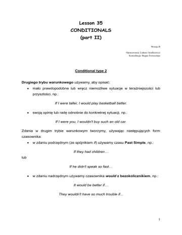Lesson 35 CONDITIONALS (part II) Wersja B Opracowanie: Łukasz Aniśkiewicz Konsultacja: Bogna Ferensztajn Conditional type 2 Drugiego trybu warunkowego używamy, aby opisać: mało prawdopodobne lub wręcz niemożliwe sytuacje w teraźniejszości lub przyszłości, np.: If I were taller, I would play basketball better. swoją opinię lub radę odnośnie do konkretnej sytuacji, np.: If I were you, I wouldn't buy such an old car. Zdania w drugim trybie warunkowym tworzymy, używając następujących form czasownika: w zdaniu podrzędnym (ze spójnikiem if) używamy czasu Past Simple, np.: If they had children… lub If he didn't speak so fast… w zdaniu nadrzędnym używamy czasownika would z bezokolicznikiem, np.: It would be better if… They wouldn't have so much trouble if... 1 Uwaga! Korzystając z czasownika to be, możemy we wszystkich osobach zastosować formę were. 1. Czasowniki z nawiasów wpisz w poprawnej formie w drugim trybie warunkowym. 1. If I __________ (go out) more often I __________ (have) more friends. 2. He __________ (not be) so miserable if he __________ (find) a new girlfriend. 3. We __________ (can) go to see the tower if we __________ (have) more time. 4. If you __________ (not be) my friend, I __________ (not help) you. 2. Napisz zdania w drugim trybie warunkowym na podstawie podanych informacji. 0. I don’t watch this show, because it’s boring. I would watch this show if it wasn’t so boring. 1. They spend too much so they haven't got any money. ____________________ 2. I don’t have much free time so I don't play video games often. ____________________ 3. We don't visit them because they live so far away. ____________________ 4. You can’t have your own bedroom because the flat is really small. ____________________ 5. You can't go on a trip because it is raining. ____________________ 3. Napisz rady do podanych sytuacji, używając wyrażenia If I were … 0. You should read that book. If I were you I would read that book. 1. He shouldn't be so rude to us. ____________________ 2. You shouldn't quit your job. ____________________ 3. He should find another flat. ____________________ 4. They should try to save some money. ____________________ 4. Czasowniki z nawiasów wpisz w poprawnej formie w pierwszym lub drugim trybie warunkowym. 1. If anyone __________ (ask) for me, I __________ (be) at the garage, OK? 2. If I __________ (be) a millionaire, I __________ (go) on a cruise around the world. 3. It's a pity he couldn't come to our party. He __________ (have) a great time if he __________ (be) here with us now. 4. I think you need to study more. You __________ (not get) a place at a good college if your exam results __________ (not be) good enough. 2