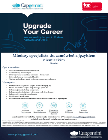 Młodszy specjalista ds. zamówień z językiem niemieckim (Kraków) Opis stanowiska: Składanie i monitorowanie zamówień Administracja bazy danych Utrzymywanie kontaktu z klientami i dostawcami Odpowiadanie na zapytania klientów Nadzór nad dokumentacją związaną z procesem zakupów Wymagania: Bardzo dobra znajomość języka niemieckiego (C1) Dobra znajomość języka angielskiego (min. B1) Dobra znajomość obsługi komputera Dobra organizacja i zdyscyplinowane podejście do pracy Dobre umiejetnosci komunikacyjne Umiejętności analityczne Wcześniejsze doświadczenie lub studia kierunkowe nie są wymagane Jeżeli zainteresowała Cię nasza oferta, prześlij swoje CV na adres [email protected]. w tytule wiadomości podając nazwę targów pracy. Prosimy o dopisanie następującej klauzuli: „Wyrażam zgodę na przetwarzanie przez Capgemini Polska Sp. z o.o. danych osobowych zawartych w mojej ofercie pracy na potrzeby procesów rekrutacji prowadzonych obecnie i w przyszłości zgodnie z przepisami ustawy z dnia 29 sierpnia 1997r. o ochronie danych osobowych (Dz. U. 2002, Nr 101, poz. 926 ze zm.) Zezwalam również Capgemini Polska Sp z o.o. na przetwarzanie moich danych osobowych poza Europejskim Obszarem Gospodarczym, w tym przez jednostki w Indiach oraz klientów Capgemini obejmujących wewnętrzne oraz zewnętrzne obszary EEA.”