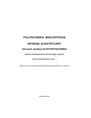 POLITECHNIKA BIAŁOSTOCKA WYDZIAŁ ELEKTRYCZNY kierunek studiów ELEKTROTECHNIKA studia niestacjonarne pierwszego stopnia karty przedmiotów sem. I Załącznik do uchwały Rady Wydziału Elektrycznego 42/2016 z 25.05.2016 Białystok 2016 intentionally left blank =wybierz kierunek studiów= Elektrotechnika Elektronika i telekomunikacja Ekoenergetyka =wybierz stopień studiów= pierwszy stopień, stacjonarne drugi stopień, stacjonarne pierwszy stopień, niestacjonarne drugi stopień, niestacjonarne =wybierz specjalność= Przedmiot wspólny Automatyka przemysłowa i technika mikroprocesorowa Elektroenergetyka i technika świetlna InŜynieria elektryczna Teleinformatyka i technika bezprzewodowa Optoelektronika i aparatura elektroniczna Aparatura elektroniczna Telekomunikacja Odnawialne źródła energii w budownictwie Odnawialne źródła i przetwarzanie energii elektrycznej Maszyny i urządzenia energetyczne =wybierz rodzaj przedmiotu= obowiązkowy do wyboru =wybierz Katedrę/Jednostkę= Katedra Automatyki i Elektroniki Katedra Elektroenergetyki, Fotoniki i Techniki Świetlnej Katedra Elektrotechniki Teoretycznej i Metrologii Katedra Energoelektroniki i Napędów Elektrycznych Katedra Telekomunikacji i Aparatury Elektronicznej WBiIŚ Katedra PBiOB WI Katedra Matematyki WM Katedra Budowy i Eksploatacji Maszyn WZ Katedra Ekonomii i Nauk Społecznych WZ Katedra Zarzadzania Produkcją Studium Języków Obcych Wydział Elektryczny Studium Wychowania Fizycznego i Sportu © L.G.-J.W. =ustaw datę= 15-mar-2016 Załącznik nr 2 do Pisma okólnego nr 417/2015 Wydział Elektryczny Nazwa programu kształcenia (kierunku) Elektrotechnika Poziom i forma studiów Specjalność: Przedmiot wspólny ŚcieŜka dyplomowania: Nazwa przedmiotu: Matematyka 1 Kod przedmiotu: Rodzaj przedmiotu: Liczba godzin w semestrze: obowiązkowy W - 20 Semestr: 1 C- 40 L- pierwszy stopień, niestacjonarne EZ1D100 001 Punkty ECTS P- 8 Ps- Przedmioty wprowadzające S- Zapoznanie studentów z podstawowymi pojęciami i aparatem matematycznym stosowanym w zagadnieniach technicznych w zakresie algebry liniowej, geometrii analitycznej, rachunku róŜniczkowego funkcji jednej zmiennej. Wyćwiczenie podstawowych technik rozwiązywania układów równań liniowych z wykorzystaniem ZałoŜenia rachunku macierzowego i wyznaczników oraz umiejętności posługiwania się rachunkiem róŜniczkowym i i cele przedmiotu: całkowym w analizie funkcji rzeczywistych. Nauka logicznego myślenia przy formułowaniu problemów i ich rozwiązywaniu. Wskazanie roli matematyki w tzw. zastosowaniach praktycznych. Forma zaliczenia Wykład - egzamin pisemny i ustny; ćwiczenia -kolokwia i kartkówki; Treści programowe: Metody dydaktyczne Algebra liniowa: liczby zespolone, macierz, wyznaczniki, układy równań liniowych, wartości i wektory własne. Elementy geometrii analitycznej. Rachunek róŜniczkowy i całkowy funkcji jednej zmiennej: podstawowe własności funkcji, pochodna i jej zastosowania, całka i jej zastosowania. Elementy logiki i teorii zbiorów. Wykład informacyjny, ćwiczenia rachunkowe Efekty kształcenia Po zaliczeniu przedmiotu student Odniesienie do kierunkowych efektów kształcenia EK1 definiuje i interpretuje podstawowe pojęcia w zakresie algebry liniowej (liczby zespolone, macierze, wyznaczniki, układy równań liniowych), geometrii analitycznej (prosta i płaszczyzna w przestrzeni), rachunku róŜniczkowego (pochodna funkcji), rachunku całkowego (całka oznaczona i nieoznaczona funkcji jednej zmiennej) EL1_W01, EL1_U09 EK2 wykonuje działania na liczbach zespolonych i macierzach, rozwiązuje układy równań liniowych, wyznacza wartości i wektory własne EL1_W01, EL1_U09 EK3 wyznacza równania prostych i płaszczyzn w przestrzeni i opisuje ich wzajemne połoŜenie EL1_W01, EL1_U09 EK4 oblicza pochodne i stosuje je do badania przebiegu zmienności funkcji EL1_W01, EL1_U09 EK5 oblicza całki i wykorzystuje je w praktyce EL1_W01, EL1_U09 EK6 EK7 EK8 Nr efektu kształcenia Forma zajęć, na której zachodzi weryfikacja Metoda weryfikacji efektu kształcenia EK1 Egzamin pisemny i ustny W EK2 Egzamin pisemny, kolokwium W, C EK3 Egzamin pisemny, kolokwium W, C EK4 Egzamin pisemny, kolokwium W, C EK5 Egzamin pisemny, kolokwium W, C EK6 EK7 Bilans nakładu pracy studenta (w godzinach) EK8 Wskaźniki ilościowe Literatura podstawowa: Literatura uzupełniająca: Udział w wykładach Udział w ćwiczeniach audytoryjnych Przygotowanie do ćwiczeń audytoryjnych Udział w konsultacjach związanych z wykładem Przygotowanie się do zaliczenia ćwiczeń Przygotowanie się do egzaminu i obecność na nim Opracowanie i wykonywanie zadań domowych 18+2 RAZEM: 20 40 40 10 20 20 50 200 ECTS Nakład pracy studenta związany z zajęciami wymagającymi bezpośredniego udziału nauczyciela: 72 2,5 Nakład pracy studenta związany z zajęciami o charakterze praktycznym: 0 0 1. Jurlewicz T., Skoczylas Z.: Algebra i geometria analityczna, Definicje, twierdzenia i wzory, GiS, Wrocław, 2011 2. Jurlewicz T., Skoczylas Z.: Algebra i geometria analityczna, Przykłady i zadania, GiS, Wrocław, 2011 3. Gewert M., Skoczylas Z.: Analiza Matematyczna I, Definicje, twierdzenia i wzory, GiS, Wrocław, 2011 4. Gewert M., Skoczylas Z.: Analiza Matematyczna I, Przykłady i zadania, GiS, Wrocław, 2011 5. ZaporoŜec G.I.: Metody rozwiązywania zadań z analizy matematycznej, WNT, Warszawa, 1976. 1. Decewicz G., śakowski W.: Matematyka, cz. I, WNT, Warszawa, 2009 2. Kołodziej M., śakowski W.: Matematyka, cz. II, WNT, Warszawa, 2003 3. Leksiński W., śakowski W.: Matematyka, cz. IV, WNT, Warszawa, 2002 4. Krysicki W., Włodarski L.: Analiza matematyczna w zadaniach, cz. I, PWN, Warszawa, 2008 5. Siewierski L.: Ćwiczenia z analizy matematycznej z zastosowaniami, cz. I, PWN, Warszawa, 1982 Jednostka realizująca: WI Katedra Matematyki Data opracowania programu: 20-kwi-2016 Program opracował(a): dr Marek Kępczyk Załącznik nr 2 do Pisma okólnego nr 417/2015 Wydzi