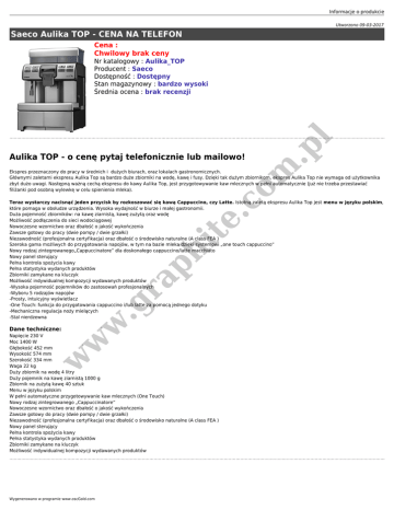 Informacje o produkcie Utworzono 09-03-2017 Saeco Aulika TOP - CENA NA TELEFON Cena : Chwilowy brak ceny m Aulika TOP - o cenę pytaj telefonicznie lub mailowo! .p l Nr katalogowy : Aulika_TOP Producent : Saeco Dostępność : Dostępny Stan magazynowy : bardzo wysoki Średnia ocena : brak recenzji e. co Ekspres przeznaczony do pracy w średnich i dużych biurach, oraz lokalach gastronomicznych. Głównymi zaletami ekspresu Aulika Top są bardzo duże zbiorniki na wodę, kawę i fusy. Dzięki tak dużym zbiornikom, ekspres Aulika Top nie wymaga od użytkownika zbyt dużo uwagi. Następną ważną cechą ekspresu do kawy Aulika Top, jest przygotowywanie kaw mlecznych w pełni automatycznie (już nie trzeba przestawiać filiżanki pod osobną wylewkę w celu spienienia mleka). Dane techniczne: w .g ra ph it Teraz wystarczy nacisnąć jeden przycisk by rozkoszować się kawą Cappuccino, czy Latte. Istotną zaletą ekspresu Aulika Top jest menu w języku polskim, które pomaga w obsłudze urządzenia. Wysoka wydajność w biurze i małej gastronomii. Duża pojemność zbiorników: na kawę ziarnistą, kawę zużytą oraz wodę Możliwość podłączenia do sieci wodociągowej Nowoczesne wzornictwo oraz dbałość o jakość wykończenia Zawsze gotowy do pracy (dwie pompy / dwie grzałki) Niezawodność (profesjonalna certyfikacja) oraz dbałość o środowisko naturalne (A class FEA ) Szeroka gama możliwych do przygotowania napojów, w tym na bazie mleka dzięki systemowi „one touch cappuccino” Nowy rodzaj zintegrowanego„Cappuccinatore” dla doskonałego cappuccino/latte macchiato Nowy panel sterujący Pełna kontrola spożycia kawy Pełna statystyka wydanych produktów Zbiorniki zamykane na kluczyk Możliwość indywidualnej kompozycji wydawanych produktów -Wysoka pojemność pojemników do zastosowań profesjonalnych -Wyboru 5 rodzajów napojów -Prosty, intuicyjny wyświetlacz -One Touch: funkcja do przygotowania cappuccino i/lub latte za pomocą jednego dotyku -Mechaniczna regulacja noży mielących -Stal nierdzewna w w Napięcie 230 V Moc 1400 W Głębokość 452 mm Wysokość 574 mm Szerokość 334 mm Waga 22 kg Duży zbiornik na wodę 4 litry Duży pojemnik na kawę ziarnistą 1000 g Zbiornik na zużytą kawę 40 sztuk Menu w języku polskim W pełni automatyczne przygotowywanie kaw mlecznych (One Touch) Nowy rodzaj zintegrowanego „Cappuccinatore” Nowoczesne wzornictwo oraz dbałość o jakość wykończenia Zawsze gotowy do pracy (dwie pompy / dwie grzałki) Niezawodność (profesjonalna certyfikacja) oraz dbałość o środowisko naturalne (A class FEA ) Nowy panel sterujący Pełna kontrola spożycia kawy Pełna statystyka wydanych produktów Zbiorniki zamykane na kluczyk Możliwość indywidualnej kompozycji wydawanych produktów Wygenerowano w programie www.oscGold.com
