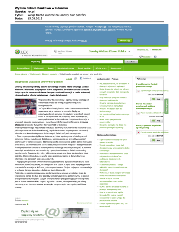 Wy¿sza Szko³a Bankowa w Gdañsku Gazeta: lex.pl Tytu³: Wci¹¿ trzeba uwa¿aæ na umowy biur podró¿y Data: 15.08.2013 Nasze serwisy używają plików cookies. Klikając "Akceptuję" lub korzystając dalej z serwisu, wyrażają Państwo zgodę na politykę prywatności i cookies Wolters Kluwer Polska. Akceptuję Więcej informacji znajdą Państwo tutaj. Zarejestruj się! | Zaloguj się Newsletter | Wyszukaj: Strona główna Wiadomości Prawo Baza teleadresowa Pasaż handlowy Oferty pracy Społeczność Strona główna > Wiadomości > Eksperci o prawie > Wciąż trzeba uważać na umowy biur podróży Podziel się ▼ AAA Wciąż trzeba uważać na umowy biur podróży Aktualności - Prawo MS jeszcze nie wie, co z wpisami w Umowy z biurami podróży często zawierają kruczki, które umykają uwadze dawnych rejestrach sądowych klientów. Nie warto podpisywać ich w pośpiechu, bo niekorzystne klauzule Rosja straszy, że więcej nie odroczy dotyczą m.in. czasu na złożenie i rozpatrzenie reklamacji, a także informacji nowych przepisów dot. transportu niezgodnych z ofertą katalogową - twierdzi ekspert. towarów Polecamy: Z problematyki funkcji procesu karnego Z problematyki funkcji procesu karnego cena już od:149 zł Rząd redukuje program na rzecz fot. Thinkstock Większość biur to pośrednicy i agenci, którzy uciekają od równego traktowania odpowiedzialności za ofertę przygotowaną przez Czwarta transza deregulacji we touroperatorów. wrześniu trafi do konsultacji - Często klienci mają bardzo mało czasu na wypełnienie i Włochy: nie będzie łaski dla zapoznanie się z zapisami w umowie. Będąc w Berlusconiego przedwyjazdowej gorączce nie czytamy wszystkich klauzul, Już za rok możliwy koniec roamingu które w danej umowie się znajdują. Biura wykorzystują w UE naszą opieszałość w tym zakresie i często umieszczają w Nowe znaki specjalnie dla umowach klauzule niedozwolone - mówi Agencji Informacyjnej Newseria dr Jacek rowerzystów Olszewski z Katedry Turystyki i Rekreacji WSB w Gdańsku. Rzecznik: pieniądze na dzieci nie Według Olszewskiego najczęstsze nadużycia ze strony biur podróży to skracanie czasu, powinny podlegać egzekucji Prawo finansów publicznych sektora samorządowego Prawo finansów publicznych sektora samorządowego cena już od:49 zł Pozycja prawna wspólnika spółki jawnej jaki turysta ma na złożenie reklamacji, wydłużanie czasu rozpatrywania reklamacji klientów oraz kwestie dotyczące dodatkowych świadczeń podczas wyjazdu. - Biura często przekazują błędne informacje, które są niezgodne z katalogowymi: Pozycja prawna wspólnika spółki jawnej Najpopularniejsze położenie hotelu, świadczenia dodatkowe, ubezpieczenia np. przy aktywnościach Sądy wojskowe osądzą nie tylko sportowych w trakcie wyjazdu. Zdarza się często przenoszenie godzin odlotu lub wylotu sprawy z wojska przez biura, co automatycznie skraca czas pobytu w danym miejscu - dodaje Olszewski. Wyrok rozwodowy może być Przed podpisaniem umowy z biurem podróży należy ją uważnie przeczytać, a pomocne dowodem przy unieważnieniu ślubu może być wcześniejsze zapoznanie się z przepisami ustawy o świadczeniu usług kościelnego turystycznych. Dowiemy się z niej, jakie mamy prawa oraz jakie są obowiązki biura Prokuratura konsekwentnie: straż podróży. Olszewski dodaje, że warto także przeczytać opinie o danym biurze w miejska nie może karać na internecie i na portalach społecznościowych. podstawie stacjonarnych - Najlepszym sposobem wyboru kierunku jest rozmowa z pracownikiem biura, który fotoradarów może nam polecić wycieczkę, w której sam brał udział. Często biura wysyłają swoich Służebność przesyłu - czego pracowników w miejsca, które są potem sprzedawane. To jest najlepsza rekomendacja właściciel nieruchomości może się w wyborze danego kierunku - dodaje dr Jacek Olszewski. domagać? Podkreśla, że często niedozwolone postanowienia w umowie wynikają z tego, że Wchodzą w życie przepisy chroniące większość z ponad 3,5 tys. biur podróży funkcjonujących na polskim rynku to agenci osoby niezadłużone i wierzycieli oraz pośrednicy turystyczni. Dużych touroperatorów przygotowujących własną ofertę Weszła w życie ustawa jest w Polsce zaledwie kilku. Agenci zgodnie z ustawą nie odpowiadają za ofertę wprowadzająca nowy urlop tworzoną przez touroperatorów, w związku z czym często tworzą nieprawidłowe rodzicielski umowy. UOKiK: parafia z Kietrza ukarana za praktyki monopolistyczne Upał w orzecznictwie sądów Uchwała SN: można zwolnić nauczyciela w czasie urlopu dla 15.08.13 poratowania zdrowia Źródło: Newseria Skomentowano 0 razy Powrót na górę Kredyt hipoteczny spłaci ten, kto go zaciągnął Ś rednia ocena artykułu (oddanych głosów: 0) cena już od:119 zł Wy¿sza Szko³a Bankowa w Gdañsku Gazeta: lex.pl Tytu³: Wci¹¿ trzeba uwa¿aæ na umowy biur podró¿y Data: 15.08.2013 Imię i nazwisko Email Treść komentarza 5 6 O nas O firmie Kontakt Serwisy ABC ABC.com.pl Akty prawne Oświata Dyrektor Szkoły Kadry BHP Podatki Doradca Podatkowy Budownictwo Środowisko Zdrowie Księgarnia internetowa Profinfo.pl Polityka prywatności Zarządzanie cookies Regulamin Serwisy prawnicze LEX LEX.pl Akty prawne Serwis samorządowy Kancelaria Portal dla studenta Mediacje Zastepstwo.pl Narzędzia Software Kancelaria Prawna Kancelaria Notarialna Kleos - mobilne zarządzanie biurem LEX Baza Dokumentów Reklama Księgarnia Profinfo.pl Mapa strony Helpdesk Produkty on-line LEX Omega LEX Sigma LEX Gamma LEX dla Samorządu Teryt. LEX Zamówienia Publiczne LEX Administracja Skarbowa LEX dla Banków LEX dla Sędziego i Prokuratora Czasopisma on-line Informator Prawno-Gospodarczy Prawo i Zdrowie LEX Szkolnictwo Wyższe i Nauka E-Dyrektor Szkoły LEX Touch LEX Windykacje LEX Miejscowe Plany Zagospodarowania Przestrzennego LEX TEST Vademecum Głównego Księgowego Vademecum Głównego Księgow