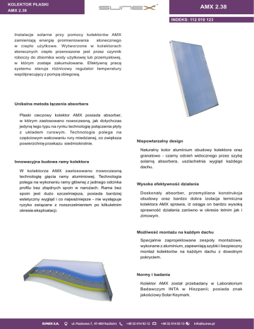 KOLEKTOR PŁASKI AMX 2.38 AMX 2.38 INDEKS: 112 010 123 Instalacje solarne przy pomocy kolektorów AMX zamieniają energię promieniowania słonecznego w ciepło użytkowe. Wytworzone w kolektorach słonecznych ciepło przenoszone jest przez czynnik roboczy do zbiornika wody użytkowej lub przemysłowej, w którym zostaje zakumulowane. Efektywną pracą systemu steruje różnicowy regulator temperatury współpracujący z pompą obiegową. Unikalna metoda łączenia absorbera Płaski cieczowy kolektor AMX posiada absorber, w którym zastosowano nowoczesną, jak dotychczas jedyną tego typu na rynku technologię połączenia płyty z układem rurowym. Technologia polega na częściowym walcowaniu rury miedzianej, co zwiększa powierzchnię przekazu siedmiokrotnie. Innowacyjna budowa ramy kolektora W kolektorze AMX zastosowano nowoczesną technologię gięcia ramy aluminiowej. Technologia polega na wykonaniu ramy głównej z jednego odcinka profilu bez zbędnych spoin w narożach. Rama bez spoin jest dużo szczelniejsza, posiada bardziej estetyczny wygląd i co najważniejsze - nie występuje ryzyko związane z rozszczelnieniem po kilkuletnim okresie eksploatacji. Niepowtarzalny design Naturalny kolor aluminium obudowy kolektora oraz granatowo - czarny odcień widocznego przez szybę solarną absorbera, uszlachetnia wygląd każdego dachu. Wysoka efektywność działania Doskonały absorber, przemyślana konstrukcja obudowy oraz bardzo dobra izolacja termiczna kolektora AMX sprawia, iż osiąga on bardzo wysoką sprawność działania zarówno w okresie letnim jak i zimowym. Możliwość montażu na każdym dachu Specjalnie zaprojektowane zespoły montażowe, wykonane z aluminium, zapewniają szybki i bezpieczny montaż kolektorów na każdym dachu z dowolnym pokryciem. Normy i badania Kolektor AMX został przebadany w Laboratorium Badawczym INTA w Hiszpanii; posiada znak jakościowy Solar Keymark. KOLEKTOR PŁASKI AMX 2.38 AMX 2.38 Podstawowe dane techniczne: Typ: Kolektor cieczowy płaski AMX 2.38 Zastosowanie: Wspomaganie przygotowania c.w.u. Wspomaganie ogrzewania podłogowego Wspomaganie ogrzewania basenów Wymiary: Długość Szerokość Wysokość Ciężar Powierzchnie: Powierzchnia brutto Powierzchnia otworu Powierzchnia absorbera Rama: Materiał ramy Materiał uszczelniający Dno kolektora: Materiał gr. Absorber: Materiał Grubość Warstwa selektywna Stopień absorpcji Stopień emisji Pojemność absorbera Nośnik ciepła 2246 mm 1066 mm 90 mm 39,6 kg 2,39 m2 2,19 m2 2,19 m2 2246 Aluminium (bez spoin) Klej Blacha aluminiowa gr.0,4 mm Harfa miedziana, powłoka aluminium 0,3 mm wysokoselektywna 0,95 ± 0,01 0,05 ± 0,02 1,42 l Glikol propylenowy + woda / gliceryna + woda Harfa podwójna 10 x Ø8 x 0,5 mm 2 x Ø22 x 1,0 mm 2 Forma przepływu Rury podłużne absorbera Rury zbiorcze Liczba przyłączy Szyba: Rodzaj Grubość Stopień transmisji Izolacja cieplna: Materiał Grubość Dane dodatkowe: Temperatura stagnacji Max. ciśnienie robocze Sprawność kolektora η0 Mikrowentylacja Zalecany przepływ Połączenie w 1 rzędzie Dostępność kolorów: Dostępność montażu: Szkło solarne 4 mm 0,915 Wełna mineralna 40 mm 1066 90 143 °C 10 bar 82,4 % tak 25-60 l/m2 x h Do 7 kolektorów (zalecane do 5) Naturalny kolor aluminium Dach Taras Fundament Ściana 1066 Wykres sprawności cieplnej mbar Wykres strat ciśnienia 120 110 100 90 80 70 60 50 40 30 20 10 0 1 0,8 0,6 0,4 0,2 0 0 0 50 100 150 200 250 300 350 400 450 l/h Typ Kolektor AMX 2.38 Uwagi 20 40 ∆T 60 80 100 2 Q1 = 3,29 [W/m xK] Q2 = 0,023 [W/m2xK2] Numer kat. 112 010 123