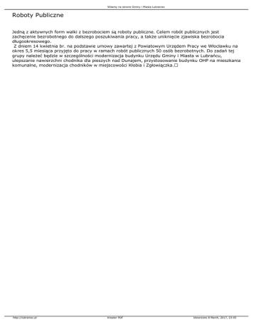 Witamy na stronie Gminy i Miasta Lubraniec Roboty Publiczne Jedną z aktywnych form walki z bezrobociem są roboty publiczne. Celem robót publicznych jest zachęcenie bezrobotnego do dalszego poszukiwania pracy, a także uniknięcie zjawiska bezrobocia długookresowego. Z dniem 14 kwietnia br. na podstawie umowy zawartej z Powiatowym Urzędem Pracy we Włocławku na okres 5,5 miesiąca przyjęto do pracy w ramach robót publicznych 50 osób bezrobotnych. Do zadań tej grupy należeć będzie w szczególności modernizacja budynku Urzędu Gminy i Miasta w Lubrańcu, ulepszanie nawierzchni chodnika dla pieszych nad Dunajem, przystosowanie budynku OHP na mieszkania komunalne, modernizacja chodników w miejscowości Kłobia i Zgłowiączka. http://lubraniec.pl Kreator PDF Utworzono 8 March, 2017, 23:05