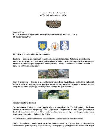 Kurkowe Bractwo Strzeleckie w Tucholi założone w 1547 r. Zaprasza na XVII Europejskie Spotkanie Historycznych Strzelców Tuchola – 2012 24-26 sierpnia 2012 TUCHOLA – stolica Borów Tucholskich Tuchola – jedno z najstarszych miast na Pomorzu Gdańskim. Założone przez księcia Mściwoja II w XIII w. Prawa miejskie nadane w 1346 r. Siedziba Powiatu Tucholskiego. Tuchola od wieków jest nazywana stolicą krainy – Bory Tucholskie. Miasto Tuchola – liczy ok. 15 tys. mieszkańców. Bory Tucholskie – kraina o niepowtarzalnym pięknie krajobrazu, królestwo zielonych borów i lasów urzekających swą potęgą i majestatem, błękitnych jezior i wartkich rzek. Bory Tucholskie obejmują obszar ponad 250 tys. ha powierzchni. Bracia Strzelcy z Tucholi Do najstarszych stowarzyszeń, zrzeszających mieszkańców Tucholi należy Kurkowe Bractwo Strzeleckie. Przywilej króla Zygmunta I Jagiellona z 1547 roku powołuje w Tucholi Strzeleckie Bractwo Piwowarów nadając mu statut i prawa korporacyjne oraz prawo warzenia piwa. Działało do 1939 r. W 1995 roku Kurkowe Bractwo Strzeleckie w Tucholi zostało reaktywowane. Celem działalności Kurkowego Bractwa Strzeleckiego w Tucholi jest – rozbudzanie świadomości patriotycznej, obywatelskiej i europejskiej, pielęgnowanie wielowiekowych tradycji i obyczajów brackich, organizowanie zawodów strzeleckich oraz udzielanie sobie wzajemnie pomocy i utrzymywanie życia towarzyskiego. Najważniejszym świętem Bractwa jest strzelanie o tytuł Króla Kurkowego. Bractwo tucholskie od 1996 r. brało udział we wszystkich Spotkaniach Europejskich Strzelców. Utrzymuje od wielu lat braterskie kontakty z bractwami z Niemiec, Austrii, Czech, Chorwacji i Ukrainy. Las was powita a ludzie ugoszczą XVII ESHS TUCHOLA 2012 EUROPEJSKIE SPOTKANIA HISTORYCZNYCH STRZELCÓW Europejska Wspólnota Historycznych Strzelców - EGS, stara się realizować wytyczone przez siebie cele między innymi poprzez organizowanie Europejskich Spotkań Strzelców Historycznych. Generalnie Spotkania odbywają sie obecnie w cyklu trzyletnim. Podczas tego spotkania uczestniczące związki strzeleckie oraz bractwa rywalizują o najwyższe honory w różnych zawodach. Zawody strzeleckie o tytuł Europejskiego Króla Strzelców Historycznych , zawody tzw. "chorągwiarzy", werblistów, rywalizacja muzyczna, zawody łucznicze. Chronologicznie Europejskie Spotkania Strzelców Historycznych odbywały się w nastepujących miejscowościach : 1975 - Aachen (Niemcy) 1977 - Nijmengen ( Holandia ) 1979 - Peer ( Belgia ) 1981 - Koblenz ( Niemcy ) 1982 - Eindhoven ( Holandia ) 1985 - Eupen ( Belgia ) 1987 - Lippstadt ( Niemcy ) 1989 - Valkenburg ( Holandia ) 1992 - Genk ( Belgia ) 1994 - Medebach ( Niemcy ) 1996 - Haaksbergen ( Holandia ) 1998 - Kraków ( Polska ) 2000 - Garell ( Niemcy ) 2003 - Vocklabruck ( Austria ) 2006 - Heeswijk ( Holandia ) 2009 - Kinrooi ( Belgia ) Następne Europejskie Spotkania odbędą się w: 2012 - w Tucholi ( Polska )2015 - w Peine (Niemcy) Strzelanie o tytuł Europejskiego Króla Strzelców Historycznych zajmuje podczas Europejskich Spotkań szczególne, najważniejsze miejsce. W czasie XIV Europejskiego Spotkania Towarzystw Strzeleckich które odbywało się w dniach 29 - 31 sierpnia 2003 r. w finałowym strzelaniu o Tytuł Europejskiego Króla Strzelców Historycznych zwyciężył brat Roman Rybacki z Kurkowego Bractwa Strzeleckiego z Rawicza. A w trakcie XV Spotkań tytuł Europejskiego Króla Strzelców zdobył również Polak br. Tadeusz Żyła z Pszczyny. Poniżej znajdują się miniaturki zdjęć terenu, na którym odbywać się będzie Europejskie Spotkanie Historycznych Strzelców Tuchola 2012. LOKALIZACJA