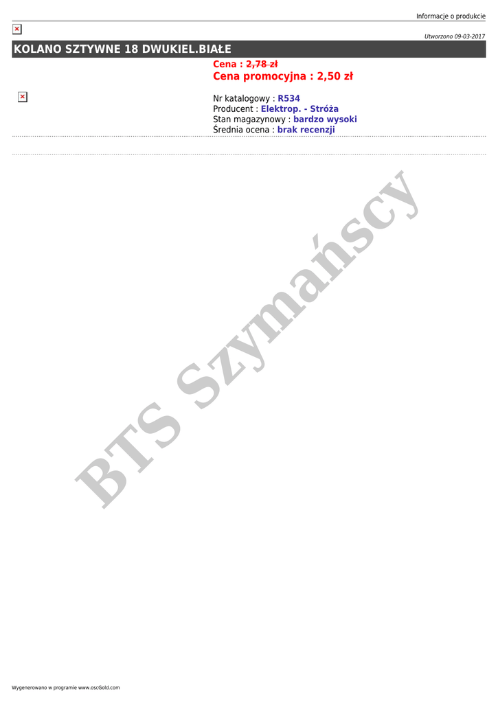 Informacje o produkcie Utworzono 09-03-2017 KOLANO SZTYWNE 18 DWUKIEL.BIAŁE Cena : 2,78 zł Cena promocyjna : 2,50 zł B TS Sz ym ań sc y Nr katalogowy : R534 Producent : Elektrop. - Stróża Stan magazynowy : bardzo wysoki Średnia ocena : brak recenzji Wygenerowano w programie www.oscGold.com