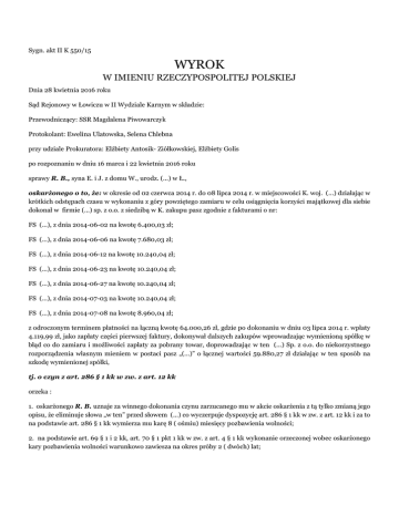 Sygn. akt II K 550/15 WYROK W IMIENIU RZECZYPOSPOLITEJ POLSKIEJ Dnia 28 kwietnia 2016 roku Sąd Rejonowy w Łowiczu w II Wydziale Karnym w składzie: Przewodniczący: SSR Magdalena Piwowarczyk Protokolant: Ewelina Ulatowska, Selena Chlebna przy udziale Prokuratora: Elżbiety Antosik- Ziółkowskiej, Elżbiety Golis po rozpoznaniu w dniu 16 marca i 22 kwietnia 2016 roku sprawy R. B., syna E. i J. z domu W., urodz. (...) w Ł., oskarżonego o to, że: w okresie od 02 czerwca 2014 r. do 08 lipca 2014 r. w miejscowości K. woj. (...) działając w krótkich odstępach czasu w wykonaniu z góry powziętego zamiaru w celu osiągnięcia korzyści majątkowej dla siebie dokonał w firmie (...) sp. z o.o. z siedzibą w K. zakupu pasz zgodnie z fakturami o nr: FS (...), z dnia 2014-06-02 na kwotę 6.400,03 zł; FS (...), z dnia 2014-06-06 na kwotę 7.680,03 zł; FS (...), z dnia 2014-06-12 na kwotę 10.240,04 zł; FS (...), z dnia 2014-06-23 na kwotę 10.240,04 zł; FS (...), z dnia 2014-06-27 na kwotę 10.240,04 zł; FS (...), z dnia 2014-07-03 na kwotę 10.240,04 zł; FS (...), z dnia 2014-07-08 na kwotę 8.960,04 zł; z odroczonym terminem płatności na łączną kwotę 64.000,26 zł, gdzie po dokonaniu w dniu 03 lipca 2014 r. wpłaty 4.119,99 zł, jako zapłaty części pierwszej faktury, dokonywał dalszych zakupów wprowadzając wymienioną spółkę w błąd co do zamiaru i możliwości zapłaty za pobrany towar, doprowadzając w ten (...) Sp. z o.o. do niekorzystnego rozporządzenia własnym mieniem w postaci pasz „(...)” o łącznej wartości 59.880,27 zł działając w ten sposób na szkodę wymienionej spółki, tj. o czyn z art. 286 § 1 kk w zw. z art. 12 kk orzeka : 1. oskarżonego R. B. uznaje za winnego dokonania czynu zarzucanego mu w akcie oskarżenia z tą tylko zmianą jego opisu, że eliminuje słowa „w ten” przed słowem (...) co wyczerpuje dyspozycję art. 286 § 1 kk w zw. z art. 12 kk i za to na podstawie art. 286 § 1 kk wymierza mu karę 8 ( ośmiu) miesięcy pozbawienia wolności; 2. na podstawie art. 69 § 1 i 2 kk, art. 70 § 1 pkt 1 kk w zw. z art. 4 § 1 kk wykonanie orzeczonej wobec oskarżonego kary pozbawienia wolności warunkowo zawiesza na okres próby 2 ( dwóch) lat; 3. na podstawie art. 46 § 1 kk w zw. z art. 4 § 1 kk orzeka wobec oskarżonego obowiązek naprawienia szkody w całości poprzez zapłatę na rzecz (...) Sp. z o.o. z siedzibą w K. kwoty 59.880,27 (pięćdziesiąt dziewięć tysięcy osiemset osiemdziesiąt 27/100) złotych; 4. zasadza od oskarżonego na rzecz oskarżyciela posiłkowego (...) Spółki z o. o. z siedzibą w K. kwotę 504 ( pięćset cztery) złotych z tytułu zwrotu kosztów zastępstwa procesowego; 5. zasądza od oskarżonego na rzecz Skarbu Państwa kwotę 250 (dwieście pięćdziesiąt) złotych z tytułu kosztów sądowych. Sygn. akt II K 550/15 UZASADNIENIE Na przełomie maja i czerwca 2014 roku R. B. przyjechał do magazynu Spółki (...) z siedzibą w K. zgłaszając zainteresowanie paszą dla świń. Została mu przedstawiona oferta. Oskarżony zakupił na próbę paszę o wartości około 1.300 złotych. W okresie pomiędzy 2 a 6 czerwca 2014 roku oskarżony podpisał z przedstawicielem Spółki (...) umowę o współpracy w zakresie dostarczania paszy dla świń. R. B. zajmował się wówczas hodowlą tuczników. W gospodarstwie prowadził hodowlę około 500 sztuk trzody chlewnej w wadze około 50 kg. Świnie były w trakcie tuczu. (zeznania M. D. k. 58 – k. 111, k. 116 zeznania R. K. k. 47v.- 107v. k. 114v. -115, zeznania Ł. B. k. 50-51 – k. 109 , k. 114) W dniu 2 czerwca 2014 roku R. B. złożył w firmie (...) pierwsze zamówienie na zakup paszy dla tuczników. Na powyższy zakup została wystawiona faktura na łączną kwotę 6.400,03 złotych ( termin płatności został określony na 9 czerwca 2014 roku). Kolejny zakup paszy przez oskarżonego miał miejsce w dniu 6 czerwca 2014 roku i opiewał na kwotę 7.680, 03 złotych (termin płatności określono na 20 czerwca 2014 roku). Kolejne zamówienia miały miejsce w dniach 12 czerwca 2014 roku na kwotę 10.240,04 złotych (termin płatności 12 lipca 2014 roku), 23 czerwca 2014 roku na kwotę 10.240,04 złotych (termin płatności 7 sierpnia 2014 roku, 27 czerwca 2014 roku na kwotę 10,240, 04 złotych (termin płatności 11 sierpnia 2014 roku), w dniu 3 lipca 2014 roku na kwotę 10.240, 04 złotych ( termin płatności 17 sierpnia 2014 roku) oraz w dniu 8 lipca 2014 roku na kwotę 8.960, 04 złotych (termin płatności 22 sierpnia 2014 roku). W dniu 3 lipca 2014 roku R. B. zapłacił część należności określonej w pierwszej fakturze w wysokości 4.119,99 złotych. Do zapłaty z pierwszej faktury pozostała kwota 2.280,04 złotych. Wszystkie faktury były z odroczonym terminem płatności, odpowiednio na 7, 14, 30 oraz 45 dni. (zeznania M. J. k. 40v.-41 – k. 126v.-127, k.128v.-129 , kopie faktur k. 18-24, R. B. przy każdym zamówieniu obiecywał, że ureguluje płatności po sprzedaży tuczników. Oskarżony zapewniał, że będzie spłacał zobowiązania. Oskarżony nie powiadomił pracowników Spółki (...) o kłopotach finansowych Do zapłaty nie doszło pomimo upływu okresu na tuczenie prosiaków. R. B. chciał złożyć kolejne zamówienie na paszę, ale z uwagi na nieuregulowanie wcześniejszych zobowiązań firma (...) odmówiła kolejnych transportów paszy. W zakresie ostatniego zamówienia początkowo w Spółce (...) zapadła decyzja odmowna. Jednak po interwencji ojca oskarżonego, który zapewniał, że należność zostanie uiszczona oraz przekazanej informacji, że świnie głodują zarząd firmy podjął decyzję o wykonaniu ostatniej dostawy. Oskarżonemu zaproponowano kredytowanie zakupów przez Bank, z którym firma (...) posiada umowę o współpracy, co miało gwarantować wznowienie dostaw. Oskarżony z tej możliwości nie skorzystał. Nigdy nie informował o kłopotach finansowych i niewypłacalności. (zeznania R.
