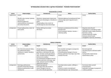 WYMAGANIA EDUKACYJNE Z JĘZYKA POLSKIEGO - POZIOM PODSTAWOWY ocena wiadomości umiejętności dopuszczający WIADOMOŚCI O EPOCE dostateczny Uczeń: dobry Uczeń: Uczeń: Określa ramy czasowe i genezę nazwy epoki. Wymienia głównych reprezentantów omawianych kierunków literackich. Wymienia najważniejsze wydarzenia historyczne decydujące o charakterze epoki. Przyporządkuje dany utwór do określonego kierunku literackiego. Wymienia głównych przedstawicieli życia artystycznego epoki (zagranicznych i polskich) . Przyporządkuje dany utwór do danej epoki. Podaje definicję kierunków literackich. Wymienia przedstawicieli kierunków filozoficznych; Potrafi powiązać motywy i tematy z właściwą epoką. bardzo dobry Uczeń: Wyjaśnia istotę filozofii decydujących o charakterze epoki. Wykazuje związki między filozofią a literaturą i sztuką; Omawia zależności między literaturą różnych epok: (uwzględnia inspiracje, konteksty). DZIEŁO LITERACKIE ocena wiadomości dopuszczający Uczeń: Zna treść przeczytanych lektur; Zna podstawowe figury stylistyczne (epitet, metafora porównanie). umiejętności Dostrzega podstawowe elementy konstrukcji wiersza; Wskazuje podstawowe środki stylistyczne; dostateczny dobry bardzo dobry Uczeń: Uczeń: Uczeń: Zna genezę utworu; Podaje definicje poszczególnych gatunków w odniesieniu do epiki, liryki i dramatu (cechy gatunkowe, typy, charakterystyczne kategorie konieczne do analizy); Zna podstawowe kategorie liryczne (kreacje podmiotu lirycznego, typy liryki, sytuacje liryczne) według załączonych pomocy: Rozpoznaje gatunki; Dostrzega ważne dla struktury utworu kategorie liryczne; Zna cechy różnych gatunków Zna wszystkie wymagane w programie figury stylistyczne; Zna podstawowe kategorie liryczne (kreacje podmiotu lirycznego, typy liryki, sytuacje liryczne). Rozróżnia gatunki charakterystyczne dla danej epoki i twórcy; Funkcjonalnie wykorzystuje najważniejsze cytaty: Formułuje własne opinie, refleksje o tekście; Umieszcza utwór w kontekstach interpretacyjnych; (np. historycznym, Formułuje trafne wnioski interpretacyjne; Swobodnie posługuje się pojęciami z zakresu poetyki; 1 Odczytuje tekst na poziomie znaczeń dosłownych. Omawia elementy świata przedstawionego w tekście (czas, miejsce, akcję, fabułę); Streszcza główne wątki utworu; Charakteryzuje najważniejszych bohaterów. ocena wiadomości umiejętności literackich Dostrzega najprostsze konteksty interpretacyjne; Dostrzega w czytanych utworach cechy charakterystyczne określonej epoki; Interpretuje tytuł; Charakteryzuje kompozycję utworu; Ocenia postępowanie bohaterów, wartościuje ich postawę moralną; Znajduje w tekście potrzebne do danego tematu fragmenty; Określa ideę ( wymowę ) utworu. dopuszczający filozoficznym, literackim); Odczytuje tekst na poziomie znaczeń metaforycznych; Określa ideę, przesłanie utworu; Wskazuje elementy świata przedstawionego i określa ich funkcję w utworze; Stosuje cytaty; Rozpoznaje cechy języka, stylu, stylizacji; Uzasadnia związek danego tekstu z kierunkiem artystycznym epoki. ŚWIADOMOŚĆ JĘZYKOWA dostateczny Uczeń: Uczeń: Uczeń: Zna pojęcia znaku i systemu znaków; Rozróżnia znaki werbalne i niewerbalne Zna pojęcie aktu komunikacji językowej i wskazuje jego składowe; Zna pojecie błędu i innowacji językowej Analizuje i definiuje (w razie potrzeby z pomocą słowników) znaczenia słów; Uzasadnia, że język jest systemem znaków; Rozpoznaje i nazywa funkcje tekstu; Rozróżnia pojęcia błędu językowego i zamierzonej innowacji językowej, Rozróżnia pojęcia poprawności i stosowności wypowiedzi Ma świadomość różnych funkcji i sposobów interpretacji; Określa funkcje środków stylistycznych w utworze; Określa funkcję języka w tekście; Komentuje znaczenie tytułu, motta, incipitu; Analizuje strukturę wiersza w związku z jego treścią; Formułuje wnioski interpretacyjne; Porównuje utwory literackie lub ich fragmenty (dostrzega cechy wspólne i różne). porównuje funkcjonowanie tych samych motywów w różnych utworach literackich; dobry bardzo dobry Uczeń: Dostrzega i omawia współczesne zmiany modelu komunikacji językowej Określa funkcje stylizacji w konkretnej wypowiedzi; Rozpoznaje manipulację językową w tekstach; Objaśnia mechanizm i funkcję ironii w określonym tekście; 2 ocena wiadomości umiejętności dopuszczający TEKST KULTURY (DZIEŁO ARTYSTYCZNE) Dostateczny Uczeń: Uczeń: Uczeń: Zna (przybliżony) czas powstania dzieła (np. obrazu, spektaklu teatralnego lub kinowego, instalacji itp.); Określa przynależność dzieła do epoki; Zna genezę dzieła; Podaje definicje gatunków dramatycznych Zna cechy różnych typów dramatu lub filmu; Zna elementy strukturalne spektaklu teatralnego lub filmowego; Interpretuje tytuł; Charakteryzuje kompozycję utworu; Ocenia postępowanie bohaterów, wartościuje ich postawę moralną; Znajduje w tekście potrzebne do danego tematu fragmenty; Charakteryzuje strony konfliktów; Ocenia strony konfliktu; Posługuje się terminami z zakresu malarstwa Rozumie funkcję didaskaliów; Określa ideę (wymowę) utworu Omawia elementy świata przedstawionego w spektaklu lub filmie (czas, miejsce, akcję); Streszcza główne wątki dzieła; Charakteryzuje najważniejszych bohaterów: dobry bardzo dobry Uczeń: Zna wyznaczniki dzieła jako tworu sztuki Rozróżnia gatunki charakterystyczne dla danej epoki i twórcy; Wskazuje elementy świata przedstawionego i określa ich funkcję w utworze; Wskazuje wyznaczniki dramatu zgodne z tendencjami epoki; Stosuje cytaty; Rozpoznaje cechy języka, stylu, stylizacji; Uzasadnia związek danego tekstu z kierunkiem artystycznym; Określa funkcję tła, (np. przyrody), kostiumu historycznego w dziele; Komentuje zastosowane cytaty; Określa stosunek autora do zawartego w dziele problemu (idei); Określa funkcję utworu w epoce; Wskazuje na podobieństwo motywów w różnych dziełach, 