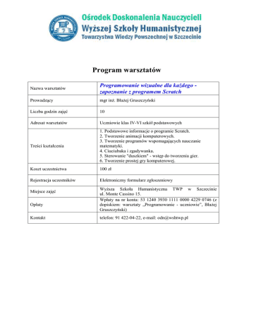 Program warsztatów Nazwa warsztatów Programowanie wizualne dla każdego zapoznanie z programem Scratch Prowadzący mgr inż. Błażej Gruszczyński Liczba godzin zajęć 10 Adresat warsztatów Uczniowie klas IV-VI szkół podstawowych Treści kształcenia 1. Podstawowe informacje o programie Scratch. 2. Tworzenie animacji komputerowych. 3. Tworzenie programów wspomagających nauczanie matematyki. 4. Ciuciubaka i zgadywanka. 5. Sterowanie "duszkiem" - wstęp do tworzenia gier. 6. Tworzenie prostej gry komputerowej. Koszt uczestnictwa 100 zł Rejestracja uczestników Elektroniczny formularz zgłoszeniowy Miejsce zajęć Opłaty Kontakt Wyższa Szkoła Humanistyczna TWP w Szczecinie ul. Monte Cassino 15. Wpłaty na nr konta: 53 1240 3930 1111 0000 4229 0746 (z dopiskiem: warsztaty „Programowanie - uczniowie”, Błażej Gruszczyński) telefon: 91 422-04-22, e-mail: [email protected]