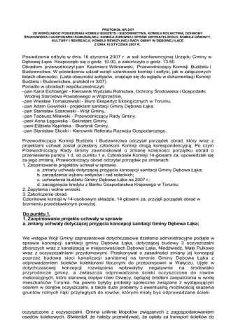 PROTOKÓŁ NR 2/07 ZE WSPÓLNEGO POSIEDZENIA KOMISJI BUDśETU l BUDOWNICTWA, KOMISJI ROLNICTWA, OCHRONY ŚRODOWISKA l GOSPODARKI KOMUNALNEJ, KOMISJI ZDROWIA l SPRAW OBYWATELSKICH, KOMISJI OŚWIATY, KULTURY l REKREACJI, KOMISJI REWIZYJNEJ RADY GMINY W DĘBOWEJ ŁĄCE Z DNIA 16 STYCZNIA 2007 R. Posiedzenie odbyło w dniu 16 stycznia 2007 r. w sali konferencyjnej Urzędu Gminy w Dębowej Łące. Rozpoczęło się o godz. 10.00, a zakończyło o godz. 13.50 Obradom przewodniczył pan Kazimierz Wiśniewski, Przewodniczący Komisji BudŜetu i Budownictwa. W posiedzeniu udział wzięli członkowie komisji i sołtysi, jak w załączonych listach obecności. (Lista obecności sołtysów, znajduje się do wglądu w dokumentacji Komisji BudŜetu i Budownictwa, protokół nr 3/07). Ponadto w obradach współuczestniczyli: - pan Karol Eichberger - Kierownik Wydziału Rolnictwa, Ochrony Środowiska i Gospodarki Wodnej Starostwa Powiatowego w Wąbrzeźnie, - pan Wiesław Tomaszewski - Biuro Ekspertyz Ekologicznych w Toruniu, - pan Adam Gowiński - projektant sanitacji Gminy Dębowa Łąka. - pan Stanisław Szarowski - Wójt Gminy, - pan Tadeusz Milewski - Przewodniczący Rady Gminy. - pani Anna Łęgowska - Sekretarz Gminy, - pani ElŜbieta Kępińska - Skarbnik Gminy, - pan Stanisław Skocki - Kierownik Referatu Rozwoju Gospodarczego, Przewodniczący Komisji BudŜetu i Budownictwa odczytał porządek obrad, który wraz z projektami uchwał został przesłany członkom Komisji drogą korespondencyjną. Po czym Przewodniczący Rady Gminy zawnioskował o zmianę kolejności porządku obrad o przeniesienie punktu 1 d. do punktu 1 a. Członkowie Komisji 14-głosami za, opowiedzieli się za jego zmianą. Przewodniczący obrad odczytał porządek po zmianach: 1. Zaopiniowanie projektów uchwał w sprawie: a. zmiany uchwały dotyczącej przyjęcia koncepcji sanitacji Gminy Dębowa Łąka; b. zarządzenia wyboru sołtysów i rad sołeckich; c. uchwalenia budŜetu Gminy Dębowa Łąka na 2007 r.; d. zaciągnięcia kredytu z Banku Gospodarstwa Krajowego w Toruniu; 2. Zapytania i wolne wnioski. 3. Zakończenie obrad. Członkowie komisji w 14-osobowym składzie, 14 głosami za, przyjęli porządek obrad w brzmieniu przedstawionym powyŜej. Do punktu 1. 1. Zaopiniowanie projektu uchwały w sprawie a. zmiany uchwały dotyczącej przyjęcia koncepcji sanitacji Gminy Dębowa Łąka; We wstępie Wójt Gminy zaprezentował dotychczasowe działania administracyjne podjęte w sprawie koncepcji sanitacji gminy Dębowa Łąka, dotyczącej budowy 3 oczyszczalni zbiorczych wraz z kanalizacją w miejscowościach Dębowa Łąka, Niedźwiedź, Małe Pułkowo wraz z oczyszczalniami przydomowymi. Przekonywał o zasadności zmiany jej koncepcji poprzez budowę sieci kanalizacji sanitarnej na terenie Gminy Dębowa Łąka z odprowadzeniem ścieków kolektorami tłocznymi do przepompowni w Wałyczu. Ujęte w dotychczasowej koncepcji rozwiązania wpływałyby negatywnie na środowisko przyrodnicze gminy, a zwłaszcza odprowadzane ścieki oczyszczone do rowów melioracyjnych, które stanowią dopływ rzeki Drwęcy, będącej źródłem zaopatrzenia w wodę mieszkańców Torunia. Na pewno byłyby protesty społeczne związane z występującym odorem w obrębie oczyszczalni, a takŜe duŜe problemy z ewentualną moŜliwością skaŜenia gruntów rolnych /łąk/ przyległych do rowów, którymi miały być odprowadzane ścieki oczyszczone z oczyszczalni. Gmina uniknie kłopotów związanych z zagospodarowaniem osadów ściekowych. Stwierdził, Ŝe naleŜy przewidywać, Ŝe opłaty za transport ścieków do Wąbrzeźna, będą do zaakceptowania przez mieszkańców i na pewno będą one niŜsze, niŜ ewentualne koszty, które mogłyby powstać na lokalnej oczyszczalni. Starostwo Powiatowe na budowę oczyszczalni ścieków wydało pozwolenie warunkowe, a warunki w nim ujęte, są niemoŜliwe do osiągnięcia przy tak małej oczyszczalni. Uznał, Ŝe w pełni uzasadniona jest koncepcja dotycząca odprowadzania ścieków kolektorami tłocznymi do Wałycza, a przyjęta dotychczasowa koncepcja sanitacji jest skazana na niepowodzenie, poniewaŜ nigdy nie udałoby się uzyskać wymaganych parametrów oczyszczania ścieków, które są kontrolowane przez Wojewódzki Inspektorat Ochrony Środowiska. Poinformował, Ŝe w ramach Regionalnego Programu Operacyjnego, oczywiście po zakwalifikowaniu projektu programu, moŜna pozyskać dofinansowanie do wysokości 75% kosztów kwalifikowanych. Przekazał do wiadomości, Ŝe Ekosystem zadeklarował udział w kosztach budowy kolektora z Niedźwiedzia do Wałycza, gdyŜ jest on zainteresowany odbiorem ścieków z wysypiska nieczystości w Niedźwiedziu. Ponadto przekazał do wiadomości, Ŝe Starostwo Powiatowe złoŜyło równieŜ deklarację partycypacji w kosztach. Poinformował, Ŝe takowa koncepcja sanitacji gminy ujęta jest w Strategii Rozwoju Powiatu Wąbrzeskiego. W dalszej ciągłości obrad pan Karol Eichberger - Kierownik Wydziału Rolnictwa, Ochrony Środowiska i Gospodarki Wodnej, Starostwa Powiatowego w Wąbrzeźnie poinformował, Ŝe koncepcja odprowadzania ścieków kolektorami tłocznymi do Miejskiego Zakładu Energetyki Cieplnej, Wodociągów i Kanalizacji w Wąbrzeźnie jest uwzględniona w Strategii Rozwoju Powiatu Wąbrzeskiego. Poinformował, Ŝe Starostwo Powiatowe partycypowałoby w kosztach tego przedsięwzięcia w wysokości 10%. Oznajmił, Ŝe jest to najoptymalniejsza koncepcja sanitacji, a ta dotychczas preferowana, była z góry skazana na niepowodzenie, gdyŜ tak małe oczyszczalnie, nie są w stanie uzyskać wymaganych parametrów oczyszczania ścieków komunalnych, które są kontrolowane przez WIOŚ. Skonstatował, iŜ na pewno w krótkim czasie, po jej uruchomieniu, groziłoby jej zamknięcie. Oznajmił, Ŝe ścieki, które pochodzą z tak małych oczyszczalni wykazują bardzo duŜą zmienność, często mieszane są z gnojowicą, co powoduje zabicie osadu czynnego w oczyszc