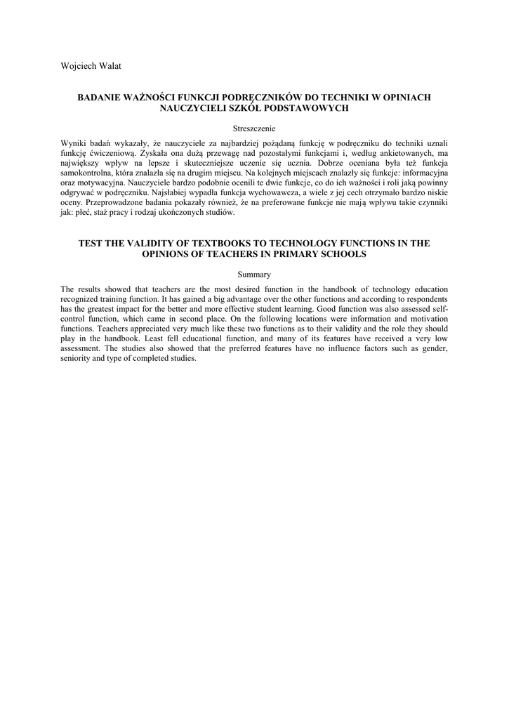 Wojciech Walat BADANIE WAŻNOŚCI FUNKCJI PODRĘCZNIKÓW DO TECHNIKI W OPINIACH NAUCZYCIELI SZKÓŁ PODSTAWOWYCH Streszczenie Wyniki badań wykazały, że nauczyciele za najbardziej pożądaną funkcję w podręczniku do techniki uznali funkcję ćwiczeniową. Zyskała ona dużą przewagę nad pozostałymi funkcjami i, według ankietowanych, ma największy wpływ na lepsze i skuteczniejsze uczenie się ucznia. Dobrze oceniana była też funkcja samokontrolna, która znalazła się na drugim miejscu. Na kolejnych miejscach znalazły się funkcje: informacyjna oraz motywacyjna. Nauczyciele bardzo podobnie ocenili te dwie funkcje, co do ich ważności i roli jaką powinny odgrywać w podręczniku. Najsłabiej wypadła funkcja wychowawcza, a wiele z jej cech otrzymało bardzo niskie oceny. Przeprowadzone badania pokazały również, że na preferowane funkcje nie mają wpływu takie czynniki jak: płeć, staż pracy i rodzaj ukończonych studiów. TEST THE VALIDITY OF TEXTBOOKS TO TECHNOLOGY FUNCTIONS IN THE OPINIONS OF TEACHERS IN PRIMARY SCHOOLS Summary The results showed that teachers are the most desired function in the handbook of technology education recognized training function. It has gained a big advantage over the other functions and according to respondents has the greatest impact for the better and more effective student learning. Good function was also assessed selfcontrol function, which came in second place. On the following locations were information and motivation functions. Teachers appreciated very much like these two functions as to their validity and the role they should play in the handbook. Least fell educational function, and many of its features have received a very low assessment. The studies also showed that the preferred features have no influence factors such as gender, seniority and type of completed studies.