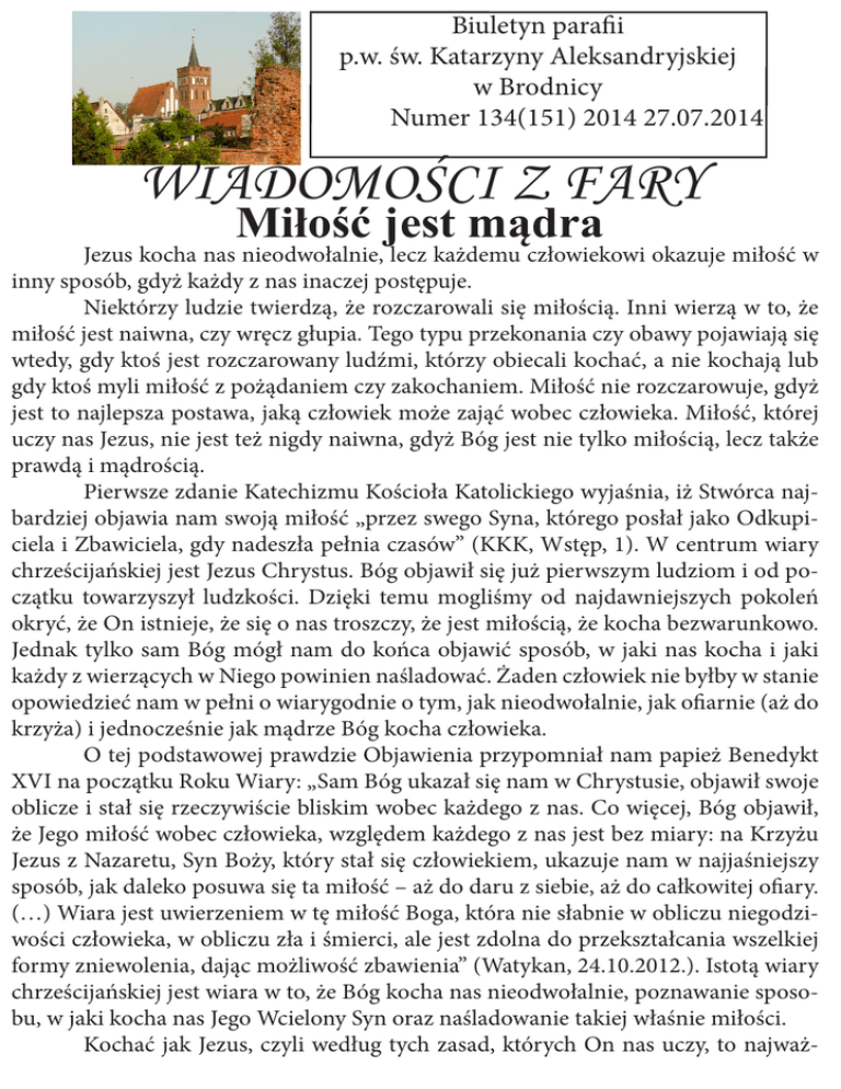 Biuletyn parafii p.w. św. Katarzyny Aleksandryjskiej w Brodnicy Numer 134(151) 2014 27.07.2014 WIADOMOŚCI Z FARY Miłość jest mądra Jezus kocha nas nieodwołalnie, lecz każdemu człowiekowi okazuje miłość w inny sposób, gdyż każdy z nas inaczej postępuje. Niektórzy ludzie twierdzą, że rozczarowali się miłością. Inni wierzą w to, że miłość jest naiwna, czy wręcz głupia. Tego typu przekonania czy obawy pojawiają się wtedy, gdy ktoś jest rozczarowany ludźmi, którzy obiecali kochać, a nie kochają lub gdy ktoś myli miłość z pożądaniem czy zakochaniem. Miłość nie rozczarowuje, gdyż jest to najlepsza postawa, jaką człowiek może zająć wobec człowieka. Miłość, której uczy nas Jezus, nie jest też nigdy naiwna, gdyż Bóg jest nie tylko miłością, lecz także prawdą i mądrością. Pierwsze zdanie Katechizmu Kościoła Katolickiego wyjaśnia, iż Stwórca najbardziej objawia nam swoją miłość „przez swego Syna, którego posłał jako Odkupiciela i Zbawiciela, gdy nadeszła pełnia czasów” (KKK, Wstęp, 1). W centrum wiary chrześcijańskiej jest Jezus Chrystus. Bóg objawił się już pierwszym ludziom i od początku towarzyszył ludzkości. Dzięki temu mogliśmy od najdawniejszych pokoleń okryć, że On istnieje, że się o nas troszczy, że jest miłością, że kocha bezwarunkowo. Jednak tylko sam Bóg mógł nam do końca objawić sposób, w jaki nas kocha i jaki każdy z wierzących w Niego powinien naśladować. Żaden człowiek nie byłby w stanie opowiedzieć nam w pełni o wiarygodnie o tym, jak nieodwołalnie, jak ofiarnie (aż do krzyża) i jednocześnie jak mądrze Bóg kocha człowieka. O tej podstawowej prawdzie Objawienia przypomniał nam papież Benedykt XVI na początku Roku Wiary: „Sam Bóg ukazał się nam w Chrystusie, objawił swoje oblicze i stał się rzeczywiście bliskim wobec każdego z nas. Co więcej, Bóg objawił, że Jego miłość wobec człowieka, względem każdego z nas jest bez miary: na Krzyżu Jezus z Nazaretu, Syn Boży, który stał się człowiekiem, ukazuje nam w najjaśniejszy sposób, jak daleko posuwa się ta miłość – aż do daru z siebie, aż do całkowitej ofiary. (…) Wiara jest uwierzeniem w tę miłość Boga, która nie słabnie w obliczu niegodziwości człowieka, w obliczu zła i śmierci, ale jest zdolna do przekształcania wszelkiej formy zniewolenia, dając możliwość zbawienia” (Watykan, 24.10.2012.). Istotą wiary chrześcijańskiej jest wiara w to, że Bóg kocha nas nieodwołalnie, poznawanie sposobu, w jaki kocha nas Jego Wcielony Syn oraz naśladowanie takiej właśnie miłości. Kochać jak Jezus, czyli według tych zasad, których On nas uczy, to najważ- niejszy sprawdzian oraz najdojrzalszy owoc wiary przyjętej i praktykowanej. Miłość, którą Jezus nas pierwszy pokochał i której nas uczy, nie jest popędem, pożądaniem, uczuciem, zakochaniem, tolerancją, akceptacją, „wolnym związkiem” czy naiwnością. Jego miłość to jednocześnie szczyt dobroci i mądrości. To najlepszy ze wszystkich możliwych sposobów odnoszenia się człowieka do człowieka. Najbardziej upewniają nas o miłości ci, którzy potrafią cierpieć z nami i ze względu na nas. Bóg o tym wie i dlatego postanowił upewnić nas o swojej miłości przez to, że pozwolił się przybić do krzyża. Naturę miłości Boga do człowieka wyjaśnia Jezus w przypowieści o synu marnotrawnym. Mądrze kochający ojciec – który jest symbolem Boga – nie wycofuje miłości, nie zsyła błądzącemu synowi żadnych kar ani cierpień, ale też nie przeszkadza mu ponosić bolesnych konsekwencji błędów, które tenże syn popełnia. Ojciec wie, że na skutek cierpienia błądzący ma szansę zastanowić się i powrócić. Kto popada w głęboki kryzys, zaczyna lekceważyć cierpienia innych ludzi, ale na własne cierpienie pozostaje jeszcze wrażliwy . To właśnie dlatego osobiste cierpienie błądzącego jest dla niego zwykle ostatnią deską ratunku. Ewangelie opisują, że Jezus wszystkich kocha dosłownie nad życie, ale każdemu spotkanemu człowiekowi okazuje i komunikuje swoją miłość w inny, niepowtarzalny sposób - dostosowany do sytuacji i zachowania danej osoby. Gdy Jezus spotykał ludzi szlachetnych, wtedy komunikował im miłość przez to, że ich na rożne sposoby wspierał: uzdrawiał, rozgrzeszał, przytulał, stawiał za wzór, chronił, spełniał ich prośby, potwierdzał, że są błogosławieni. Takim ludziom okazywał miłość z radością i w sposób, który zwykle uznajemy za jedyną formę komunikowania miłości. Tymczasem gdy Jezus spotykał ludzi błądzących, wtedy okazywał im miłość w zupełnie inny sposób niż ludziom postępującym szlachetnie. Błądzących nie tolerował, ani nie akceptował, lecz twardo upominał i stanowczo wzywał do nawrócenia: „Jeśli się nie nawrócicie, wszyscy podobnie zginiecie”. Gdy Jezus spotykał ludzi faryzejskich i przewrotnych, którzy z premedytacją usiłowali żyć kosztem innych ludzi, wtedy ich publicznie demaskował. Wyjaśniał tłumom ludzi dobrej woli, że uczeni w Piśmie i faryzeusze to plemię żmijowe i ślepi przewodnicy, których trzeba się strzec. Gdy natomiast spotykał ludzi, którzy kochali bardziej niż inni, to komunikował im miłość przez to, że ich wyróżniał, że okazywał im niezwykłe zaufanie i że zawierzał im losy Kościoła, czyli losy ludzi, których kocha nieodwołalnie (zob. J 21, 15-17). Gdy Jezus spotykał krzywdzicieli, wtedy się przed nimi bronił. Nie pozwolił, by strącili Go ze skały tam, gdzie nauczał (zob. Łk 4, 28-30). Innym razem ukrył się w świątyni przed tymi, którzy chcieli Go zabić (zob. J 8, 59; J 11, 54). Bronił się przed Annaszem i Kajfaszem (zob. Mk 14, 62; J 18, 19-21), a także przed Piłatem (zob. J 18, 33-38); J 19, 11-12). Stanowczo bronił się przed żołnierzem, który Go uderzył (zob. J 11, 23). Obrona przed krzywdzi