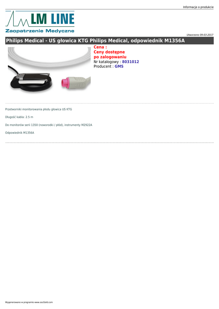 Informacje o produkcie Utworzono 09-03-2017 Philips Medical - US głowica KTG Philips Medical, odpowiednik M1356A Cena : Ceny dostępne po zalogowaniu Nr katalogowy : 8031012 Producent : GMS Przetworniki monitorowania płodu głowica US KTG Długość kabla: 2.5 m Do monitorów serii 1350 (noworodki / płód), instrumenty M2922A Odpowiednik M1356A Wygenerowano w programie www.oscGold.com