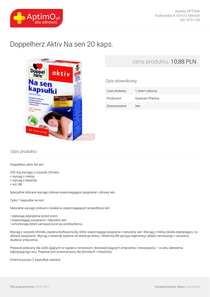 Apteka OPTIMA Krakowska 4, 63-510 Mikstat 531-470-109 Doppelherz Aktiv Na sen 20 kaps. cena produktu: 10,88 PLN Opis słownikowy Czas dostawy 1 dzień roboczy Producent Queisser Pharma Zastosowanie Sen Opis produktu Doppelherz aktiv Na sen 200 mg wyciągu z szyszek chmielu + wyciąg z melisy + wyciąg z lawendy + wit. B6 Specjalnie dobrane wyciągi ziołowe wspomagające zasypianie i zdrowy sen. Tylko 1 kapsułka na noc! Naturalne wyciągi ziołowe o działaniu wspomagającym prawidłowy sen: • ułatwiają odprężenie przed snem • wspomagają zasypianie i naturalny sen • umożliwiają dobre samopoczucie po przebudzeniu. Wyciąg z szyszek chmielu zawiera bioflawonoidy, które wspomagają zasypianie i naturalny sen. Wyciąg z melisy działa odprężająco, co ułatwia zasypianie. Wyciąg z lawendy wpływa na redukcję stresu. Witamina B6 sprzyja regeneracji układu nerwowego i usuwaniu skutków zmęczenia. Preparat polecany dla osób żyjących w napięciu nerwowym, doświadczających zmęczenia i niewyspania – w celu ułatwienia odprężającego snu. Preparat jest przeznaczony dla dorosłych i młodzieży. Dzienna porcja (1 kapsułka) zawiera: Plik wygenerowano: 09-03-2017 Oprogramowanie sklepu: AptusShop Apteka OPTIMA Krakowska 4, 63-510 Mikstat 531-470-109 Ilość % ZDS* Wyciąg z szyszek chmielu (5:1) 200 mg Wyciąg z liści melisy (5:1) 100 mg Wyciąg z ziela lawendy (4:1) 20 mg Witamina B6 0,7 mg 50% * % zalecanego dziennego spożycia (dotyczy witamin) Informacja dla chorych na cukrzycę: 1 kapsułka odpowiada 0,01 ww (wymiennika węglowodanowego). Sposób użycia: Stosować 1 kapsułkę na około godzinę przed snem. Plik wygenerowano: 09-03-2017 Powered by TCPDF (www.tcpdf.org) Oprogramowanie sklepu: AptusShop