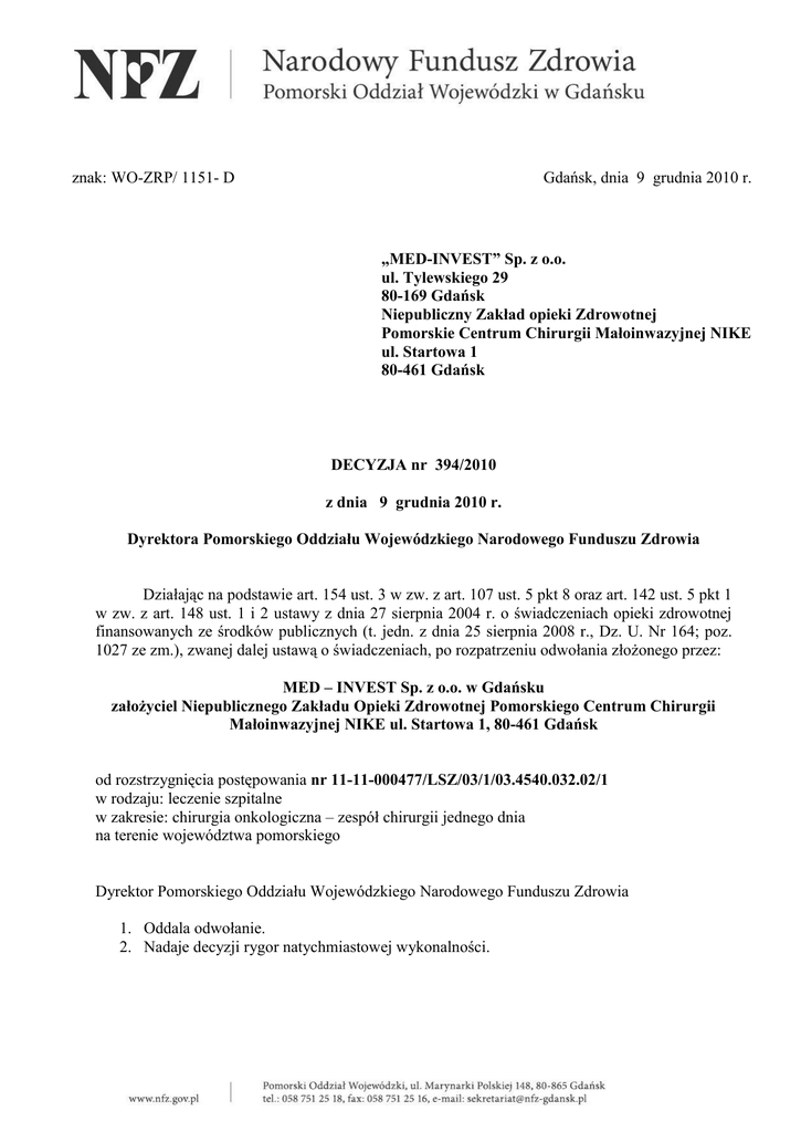 Gdańsk, dnia 9 grudnia 2010 r. znak: WO-ZRP/ 1151- D „MED-INVEST” Sp. z o.o. ul. Tylewskiego 29 80-169 Gdańsk Niepubliczny Zakład opieki Zdrowotnej Pomorskie Centrum Chirurgii Małoinwazyjnej NIKE ul. Startowa 1 80-461 Gdańsk DECYZJA nr 394/2010 z dnia 9 grudnia 2010 r. Dyrektora Pomorskiego Oddziału Wojewódzkiego Narodowego Funduszu Zdrowia Działając na podstawie art. 154 ust. 3 w zw. z art. 107 ust. 5 pkt 8 oraz art. 142 ust. 5 pkt 1 w zw. z art. 148 ust. 1 i 2 ustawy z dnia 27 sierpnia 2004 r. o świadczeniach opieki zdrowotnej finansowanych ze środków publicznych (t. jedn. z dnia 25 sierpnia 2008 r., Dz. U. Nr 164; poz. 1027 ze zm.), zwanej dalej ustawą o świadczeniach, po rozpatrzeniu odwołania złożonego przez: MED – INVEST Sp. z o.o. w Gdańsku założyciel Niepublicznego Zakładu Opieki Zdrowotnej Pomorskiego Centrum Chirurgii Małoinwazyjnej NIKE ul. Startowa 1, 80-461 Gdańsk od rozstrzygnięcia postępowania nr 11-11-000477/LSZ/03/1/03.4540.032.02/1 w rodzaju: leczenie szpitalne w zakresie: chirurgia onkologiczna – zespół chirurgii jednego dnia na terenie województwa pomorskiego Dyrektor Pomorskiego Oddziału Wojewódzkiego Narodowego Funduszu Zdrowia 1. Oddala odwołanie. 2. Nadaje decyzji rygor natychmiastowej wykonalności. Uzasadnienie W dniu 20 września 2010 r. Dyrektor Pomorskiego Oddziału Wojewódzkiego NFZ ogłosił konkurs ofert poprzedzający zawarcie umów o udzielanie świadczeń opieki zdrowotnej na rok 2011 w rodzaju leczenie szpitalne, w zakresie: chirurgia onkologiczna – zespół chirurgii jednego dnia. Postępowanie zostało ogłoszone na kwotę 2.100.384,00 zł. W ogłoszeniu wskazano obowiązujące przepisy dotyczące wymogów jakie muszą być spełnione przez podmioty składające oferty, jak i przepisy dotyczące kryteriów oceny ofert w postępowaniu w sprawie zawarcia umowy o udzielanie świadczeń opieki zdrowotnej. Oferent do złożonej oferty załączył oświadczenie z dnia 5.10.2010 r., że zapoznał się z warunkami postępowania oraz warunkami zawierania umów i nie zgłasza do nich zastrzeżeń oraz, że przyjmuje je do wykonania. Komisja konkursowa dnia 14.10.2010 r. wezwała Odwołującego się do usunięcia braków formalnych złożonej oferty. Braki formalne zostały uzupełnione w dniu 18.10.2010 r. tj. w wyznaczonym przez POW NFZ terminie. Po sprawdzeniu oferty pod względem spełnienia warunków formalno-prawnych oraz analizie oferty w aspekcie spełnienia wymagań określonych w przepisach, oferta została przyjęta do dalszego postępowania. Oferent został zaproszony do negocjacji i dnia 24.11.2010 r. podpisał protokół końcowy z negocjacji. Strony doszły do porozumienia, co do ilości punków i ceny za punkt. W podpisanym przez Strony protokole końcowym z negocjacji znajdują się uwagi, że podpisanie protokołu negocjacyjnego nie jest gwarancją wybrania oferty oraz że wynegocjowane warunki zostaną wzięte pod uwagę przy tworzeniu rankingu końcowego (...). W rankingu końcowym konkursu ofert, oferta Odwołującego się uzyskała w sumie 71,650 pkt, w tym za kryteria cenowe 23,824 pkt, a za niecenowe 47,826 pkt. Dnia 30.11.2010 r. komisja konkursowa rozstrzygnęła postępowanie nie dokonując wyboru Odwołującego. W terminie wynikającym z art. 154 ustawy o świadczeniach, oferent wniósł odwołanie od rozstrzygnięcia postępowania nr 11-11-000477/LSZ/03/1/03.4540.032.02/1 Zgodnie z art. 10 § 1 kodeksu postępowania administracyjnego oferent został poinformowany o tym, że posiada prawo do czynnego udziału na każdym etapie postępowania, a przed wydaniem decyzji przez Dyrektora Oddziału w przedmiotowej sprawie, istnieje możliwość wypowiedzenia się co do zebranych w Oddziale dowodów i materiałów oraz zgłoszonych żądań. Odwołanie złożone przez oferenta nie zasługuje na uwzględnienie. W złożonym odwołaniu Oferent wnosi o ponowne rozpatrzenie oferty lub o ponowne negocjacje złożonej oferty. Odwołujący wskazuje, iż jest jednostką wysoko wykwalifikowaną, badania kompleksowe, nie wskazując przy tym żadnego zarzutu względem warunków przeprowadzonego konkursu. Dyrektor POW NFZ ustosunkowując się do podniesionych zarzutów wskazuje co następuje: Zgodnie z treścią art. 152 ust. 1 ustawy o świadczeniach, świadczeniodawcom, których interes prawny doznał uszczerbku w wyniku naruszenia przez Fundusz zasad przeprowadzania postępowania w sprawie zawarcia umowy o udzielanie świadczeń opieki zdrowotnej przysługują środki odwoławcze i skarga (...).Jednym z nich jest zgodnie z art. 154 ust.1 ustawy odwołanie wnoszone do dyrektora oddziału wojewódzkiego Funduszu, a dotyczące rozstrzygnięcia postępowania. W odwołaniu wniesionym przez Uniwersyteckie Centrum Kliniczne, brak jest zarzutów dotyczących rozstrzygnięcia postępowania a Odwołujący nie wykazał, w jaki sposób naruszony został w tym postępowaniu jego interes prawny. Zgodnie z treścią art. 134 ustawy Fundusz jest zobowiązany zapewnić równe traktowanie wszystkich świadczeniodawców ubiegających się o zawarcie umowy o udzielanie świadczeń opieki zdrowotnej i prowadzić postępowanie w sposób gwarantujący zachowanie uczciwej konkurencji. Wskazać należy, iż Odwołujący był jednym z czterech oferentów ubiegających się o zawarcie umowy w tym postępowaniu konkursowym. Oferta została przyjęta do postępowania konkursowego, a jej ocena została dokonana według jednolitych dla wszystkich świadczeniodawców kryteriów oceny określonych w Zarządzeniu Nr 73/2009/DSOZ Prezesa Narodowego Funduszu Zdrowia z dnia 13 listopada 2009 r. w sprawie określenia kryteriów oceny ofert w postępowaniu w sprawie zawarcia umowy o udzielenie świadczeń opieki zdrowotnej ze zm. oraz Zarządzeniu Nr 69/2009/DSOZ Prezesa Narodowego Funduszu Zdrowia z dnia 13 listopada 2009 r. w sprawie określenia warunków zawierania umów w rodzaju leczenie szpitalne ze zm. Należy przy tym podkreślić, iż Pre