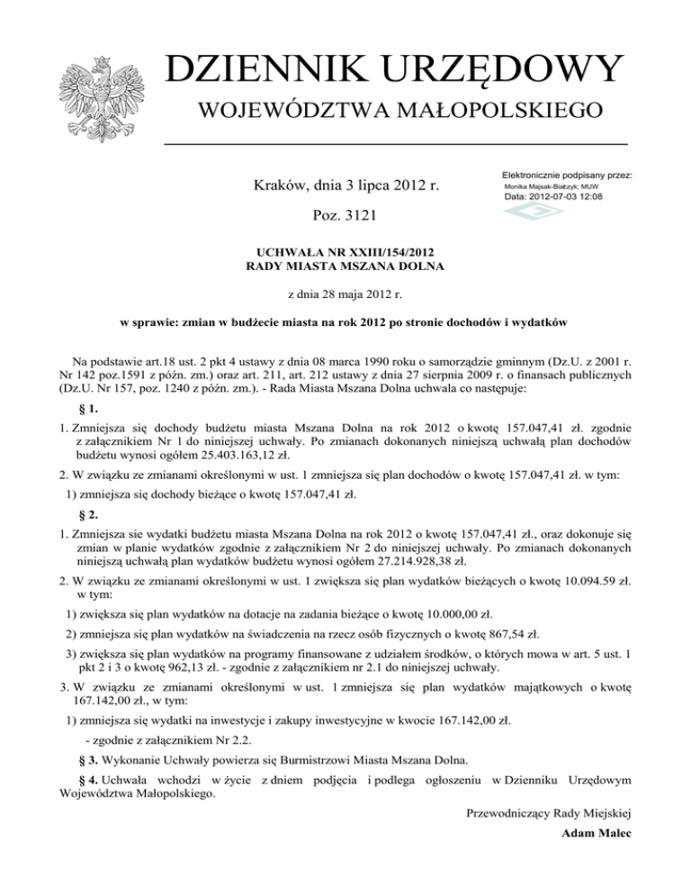 DZIENNIK URZĘDOWY WOJEWÓDZTWA MAŁOPOLSKIEGO Elektronicznie podpisany przez: Kraków, dnia 3 lipca 2012 r. Monika Majsak-Białczyk; MUW Data: 2012-07-03 12:08 Poz. 3121 UCHWAŁA NR XXIII/154/2012 RADY MIASTA MSZANA DOLNA z dnia 28 maja 2012 r. w sprawie: zmian w budżecie miasta na rok 2012 po stronie dochodów i wydatków Na podstawie art.18 ust. 2 pkt 4 ustawy z dnia 08 marca 1990 roku o samorządzie gminnym (Dz.U. z 2001 r. Nr 142 poz.1591 z późn. zm.) oraz art. 211, art. 212 ustawy z dnia 27 sierpnia 2009 r. o finansach publicznych (Dz.U. Nr 157, poz. 1240 z późn. zm.). - Rada Miasta Mszana Dolna uchwala co następuje: § 1. 1. Zmniejsza się dochody budżetu miasta Mszana Dolna na rok 2012 o kwotę 157.047,41 zł. zgodnie z załącznikiem Nr 1 do niniejszej uchwały. Po zmianach dokonanych niniejszą uchwałą plan dochodów budżetu wynosi ogółem 25.403.163,12 zł. 2. W związku ze zmianami określonymi w ust. 1 zmniejsza się plan dochodów o kwotę 157.047,41 zł. w tym: 1) zmniejsza się dochody bieżące o kwotę 157.047,41 zł. § 2. 1. Zmniejsza sie wydatki budżetu miasta Mszana Dolna na rok 2012 o kwotę 157.047,41 zł., oraz dokonuje się zmian w planie wydatków zgodnie z załącznikiem Nr 2 do niniejszej uchwały. Po zmianach dokonanych niniejszą uchwałą plan wydatków budżetu wynosi ogółem 27.214.928,38 zł. 2. W związku ze zmianami określonymi w ust. 1 zwiększa się plan wydatków bieżących o kwotę 10.094.59 zł. w tym: 1) zwiększa się plan wydatków na dotacje na zadania bieżące o kwotę 10.000,00 zł. 2) zmniejsza się plan wydatków na świadczenia na rzecz osób fizycznych o kwotę 867,54 zł. 3) zwiększa się plan wydatków na programy finansowane z udziałem środków, o których mowa w art. 5 ust. 1 pkt 2 i 3 o kwotę 962,13 zł. - zgodnie z załącznikiem nr 2.1 do niniejszej uchwały. 3. W związku ze zmianami określonymi w ust. 1 zmniejsza się plan wydatków majątkowych o kwotę 167.142,00 zł., w tym: 1) zmniejsza się wydatki na inwestycje i zakupy inwestycyjne w kwocie 167.142,00 zł. - zgodnie z załącznikiem Nr 2.2. § 3. Wykonanie Uchwały powierza się Burmistrzowi Miasta Mszana Dolna. § 4. Uchwała wchodzi w życie z dniem podjęcia i podlega ogłoszeniu w Dzienniku Urzędowym Województwa Małopolskiego. Przewodniczący Rady Miejskiej Adam Malec Dziennik Urzędowy Województwa Małopolskiego –2– Poz. 3121 Załącznik Nr 1 do Uchwały Nr XXIII/154/2012 Rady Miasta Mszana Dolna z dnia 28 maja 2012 r. ZMIANY W PLANIE DOCHODÓW BUDŻETU MIASTA MSZANA DOLNA NA ROK 2012 Lp. Dział Treść Dochody Zmniejszenie Zwiększenie 1. 2. 3. 756 758 853 Dochody od osób prawnych, od osób fizycznych i od innych jednostek nieposiadających osobowości prawnej oraz wydatki związane z ich poborem 138.829,00 - Dochody bieżące 138.829,00 - Podatek dochodowy od osób fizycznych (§ 0010) 138.829,00 - Różne rozliczenia 18.313,00 - Dochody bieżące 18.313,00 - Subwencje ogólne z budżetu państwa (§ 2920) 18.313,00 - Pozostałe zadania w zakresie polityki społecznej - 94,59 Dochody bieżące - 94,59 Dotacje celowe w ramach programów finansowanych z udziałem środków europejskich oraz środków o których mowa w art. 5 ust. 1 pkt 3 oraz ust. 3 pkt 5 i 6 ustawy, lub płatności w ramach budżetu środków europejskich(§ 2007) - 30,63 Dotacje celowe w ramach programów finansowanych z udziałem środków europejskich oraz środków o których mowa w art. 5 ust. 1 pkt 3 oraz ust. 3 pkt 5 i 6 ustawy, lub płatności w ramach budżetu środków europejskich(§ 2009) - 63,96 157.142,00 94,59 Razem: Przewodniczący Rady Miejskiej Adam Malec Załącznik Nr 2 do Uchwały Nr XXIII/154/2012 Rady Miasta Mszana Dolna z dnia 28 maja 2012 r. ZMIANY W PLANIE WYDATKÓW BUDŻETU MIASTA MSZANA DOLNA NA ROK 2012 Lp. Dział Rozdział Treść 1. 600 Transport i łączność Wydatki Zwiększenie Zmniejszenia 167.142,00 - 167.142,00 - 167.142,00 - Bezpieczeństwo publiczne i ochrona przeciwpożarowa - 10.000,00 Komendy powiatowe Policji - 10.000,00 a) wydatki bieżące - 10.000,00 Pomoc społeczna 867,54 - 867,54 - 60016 Drogi publiczne gminne w tym: b) wydatki majątkowe 2. 754 w tym: 3. 852 85214 Zasiłki i pomoc w naturze oraz składki na ubezpieczenia emerytalne Dziennik Urzędowy Województwa Małopolskiego –3– Poz. 3121 i rentowe w tym: a) wydatki bieżące 4. 867,54 - - 962,13 - 962,13 - 962,13 Pozostałe zadania w zakresie polityki społecznej 853 85395 Pozostała działalność w tym: a) wydatki bieżące Razem: 168.009,54 10.962,13 Przewodniczący Rady Miejskiej Adam Malec Załącznik Nr 2.1 do Uchwały Nr XXIII/154/2012 Rady Miasta Mszana Dolna z dnia 28 maja 2012 r. ZMIANY W PLANIE WYDATKÓW BIEŻĄCYCH BUDŻETU MIASTA MSZANA DOLNA NA ROK 2012 Dział Lp. Rozdział Treść Wydatki Zmniejszenie Zwiększenie 1. 754 75405 Bezpieczeństwo publiczne i ochrona przeciwpożarowa - 10.000,00 Komendy powiatowe Policji - 10.000,00 - 10.000,00 Pomoc społeczna 867,54 - Zasiłki i pomoc w naturze oraz składki na ubezpieczenia emerytalne i rentowe 867,54 - 867,54 - Pozostałe zadania w zakresie polityki społecznej - 962,13 Pozostała działalność - 962,13 - 962,13 867,54 10.962,13 w tym: (2) dotacje na zadania bieżące 2. 852 85214 w tym: (3) świadczenia na rzecz osób fizycznych 3. 853 85395 w tym: (4) wydatki na programy finansowane z udziałem środków, o których mowa w art. 5 ust. 1 pkt 2 i 3 Razem: Przewodniczący Rady Miejskiej Adam Malec Dziennik Urzędowy Województwa Małopolskiego –4– Poz. 3121 Załącznik Nr 2.2 do Uchwały Nr XXIII/154/2012 Rady Miasta Mszana Dolna z dnia 28 maja 2012 r. ZMIANY W PLANIE WYDATKÓW MAJĄTKOWYCH BUDŻETU MIASTA MSZANA DOLNA NA 2012 ROK Lp. Dział Rozdział Treść 1. Wytwarzanie i zaopatrywanie w energię elektryczną, gaz i wodę 400 Plan przed zmianą Plan po zmianach Zmniejszenie Zwiększenie na 2012r. na 2012r. 120.000,00 - - 120.000,00 120.000,00 - - 120.000,00 120.000,00 - - 120.000,00 1.716.