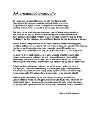 Jak zrozumieć ewangelię To jest pismo święte Boga słowo dla nas tajemnicze Początkiem każdego człowieka jest miłością poczęcie A by powstało życie trzeba tchnięcie ducha wiecznego Dziecię z łona matki się rodzi z dumą ojca szczęśliwego Tak tworzy się rodzina sakramentem małżeństwa błogosławiona Jak bardzo ważne są imiona darem świętych patronów nadane Tym sakramentem jest chrzest ciałem i duszą należymy już do Boga Podążamy za Chrystusem synem Maryi dawcą ducha świętego w opiece Pismo święte jest podobne do szczytu wielkiej nieskończonej góry Na którą człowiek się wspina raz to z wiarą a czasami upadkowi znużony Każdy na swój sposób odczytuje rozważa nauki Chrystusowe Tą przyczyną powstają podziały gdzie każdy szuka, co mu wygodne Na samym dole jest szatan, co w górę wysyła aniołów ciemności Którzy mają siać w ludziach strach niepokój kłótnią nienawiści Aby nigdy nie doszli do szczytu gdzie światłość Boża ich oczekuje Także są anioły z nieba, które wspierają człowieka by odkrył szczęście Od początku świata jest dobro i zło, które walczy o każdą duszę A w tym jest człowiek bezbronny, co wolną decyzją musi wybierać Pokonując czasami wielkie trudy biedy upokorzenia i z bólu trwogę Iść za ewangelią Chrystusa to w samotności jego prawdę głosić Nikt nie jest stworzony by na ten szczyt iść drogą samolubną Lecz dobrocią miłością wciągnąć rękę ku upodlającemu człowiekowi Niech duch święty i aniołowie prowadzą nas do celu wiarą zbawczą By strzegli od złych aniołów i szatana jego zasadzek darem mądrości Hieronim Borkowski