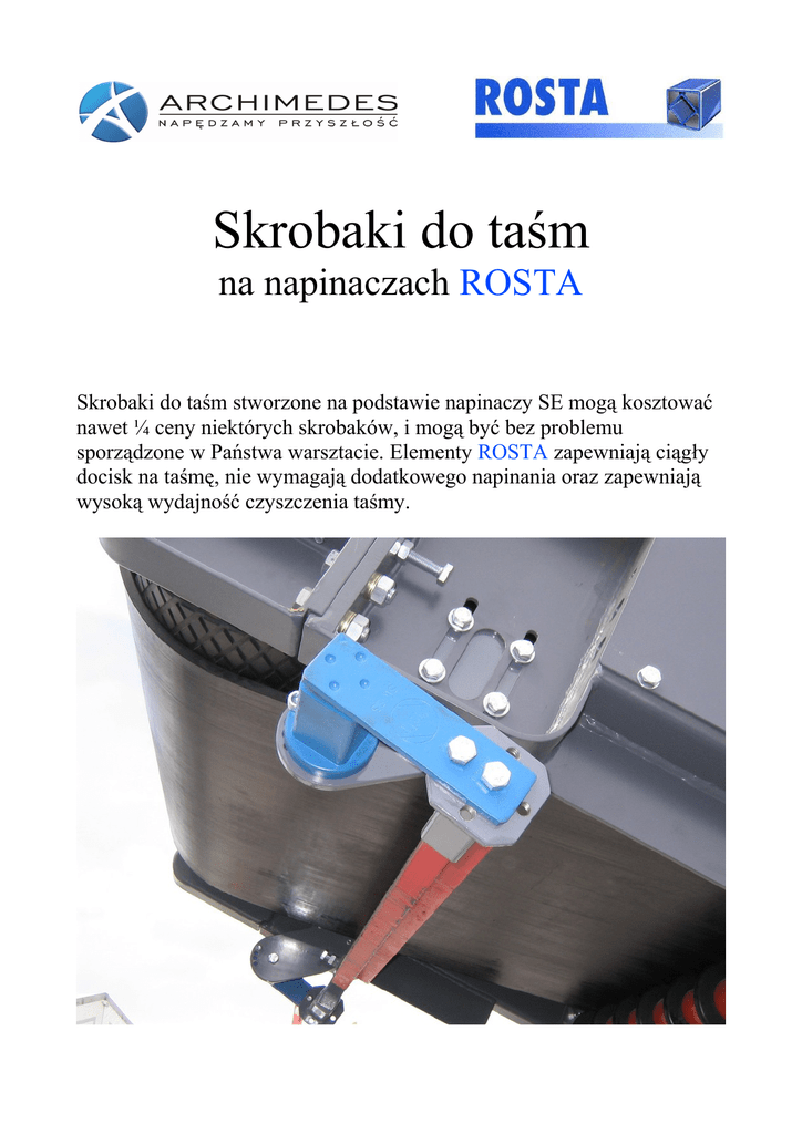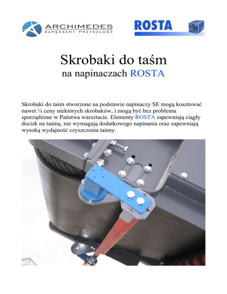 Skrobaki do taśm na napinaczach ROSTA Skrobaki do taśm stworzone na podstawie napinaczy SE mogą kosztować nawet ¼ ceny niektórych skrobaków, i mogą być bez problemu sporządzone w Państwa warsztacie. Elementy ROSTA zapewniają ciągły docisk na taśmę, nie wymagają dodatkowego napinania oraz zapewniają wysoką wydajność czyszczenia taśmy. Co więcej, skrobaki ROSTA nie wymagają drogich piór skrobaka, które wymagają ciągłej wymiany. Samonapinające elementy SE pozwalają większości aplikacji współpracować jedynie ze zwykłą gumą. Standardowe elementy ROSTA mogą pracować w brudzie czy zapyleniu, oraz w temperaturze od -40 do +40o C. Dostępne są również napinacze w wersji olejo- oraz temperaturoodpornej (do 120o C) Dobór uzależniony jest od szerokości taśmy: Szerokość taśmy: 450 mm 600 mm 750 mm 900 mm 1050 mm 1200 mm Rodzaj napinacza: 2 x SE 18 2 x SE 27 2 x SE 27 2 x SE 38 2 x SE 45 2 x SE 45 W razie jakichkolwiek pytań, prosimy o kontakt. Udzielimy wszelkich możliwych informacji Archimedes Sp. z o.o. ul. Polna 133 87-100 Toruń tel. (0-56) 657 73 00 fax. (0-56) 653 94 55 [email protected] www.archimedes.pl