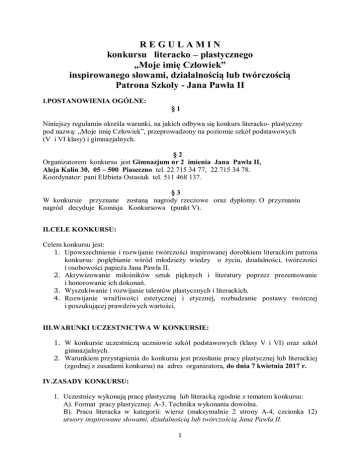 REGULAMIN konkursu literacko – plastycznego „Moje imię Człowiek” inspirowanego słowami, działalnością lub twórczością Patrona Szkoły - Jana Pawła II I.POSTANOWIENIA OGÓLNE: §1 Niniejszy regulamin określa warunki, na jakich odbywa się konkurs literacko- plastyczny pod nazwą: „Moje imię Człowiek”, przeprowadzony na poziomie szkół podstawowych (V i VI klasy) i gimnazjalnych. §2 Organizatorem konkursu jest Gimnazjum nr 2 imienia Jana Pawła II, Aleja Kalin 30, 05 – 500 Piaseczno tel. 22 715 34 77, 22 715 34 78. Koordynator: pani Elżbieta Ostasiuk tel. 511 468 137. §3 W konkursie przyznane zostaną nagrody rzeczowe oraz dyplomy. O przyznaniu nagród decyduje Komisja Konkursowa (punkt V). II.CELE KONKURSU: Celem konkursu jest: 1. Upowszechnienie i rozwijanie twórczości inspirowanej dorobkiem literackim patrona konkursu: pogłębianie wśród młodzieży wiedzy o życiu, działalności, twórczości i osobowości papieża Jana Pawła II. 2. Aktywizowanie miłośników sztuk pięknych i literatury poprzez prezentowanie i honorowanie ich dokonań. 3. Wyszukiwanie i rozwijanie talentów plastycznych i literackich. 4. Rozwijanie wrażliwości estetycznej i etycznej, rozbudzanie postawy twórczej i poszukującej prawdziwych wartości. III.WARUNKI UCZESTNICTWA W KONKURSIE: 1. W konkursie uczestniczą uczniowie szkół podstawowych (klasy V i VI) oraz szkół gimnazjalnych. 2. Warunkiem przystąpienia do konkursu jest przesłanie pracy plastycznej lub literackiej (zgodnej z zasadami konkursu) na adres organizatora, do dnia 7 kwietnia 2017 r. IV.ZASADY KONKURSU: 1. Uczestnicy wykonują pracę plastyczną lub literacką zgodnie z tematem konkursu: A). Format pracy plastycznej: A-3. Technika wykonania dowolna. B). Praca literacka w kategorii: wiersz (maksymalnie 2 strony A-4, czcionka 12) utwory inspirowane słowami, działalnością lub twórczością Jana Pawła II. 1 2. Hasło konkursowe „Moje imię Człowiek” powinno zostać zrealizowane w jednej z poniższych kategorii: 1) Naród istnieje z kultury i dla kultury. 2) Twarze dialogu. 3) Bądź jak Jan Paweł II. 4) Wolność i odpowiedzialność. 3. Organizator konkursu przyjmuje prace z kategorii plastycznej lub literackiej, wykonane przez uczestników danej szkoły, wybrane w etapie szkolnym. Tytuł pracy (zgodny z mottem konkursu) może być uzupełniony o podtytuł. Ilość prac nie jest ograniczona. 4. Realizacja zadania następuje w terminie do 7 kwietnia 2017 r. i liczy się data nadesłania pracy na adres szkoły lub na adres e-mailowy [email protected] 5. Konkurs zostanie rozstrzygnięty 15 maja 2017 roku, nagrody zostaną rozdane w Gimnazjum nr 2 im. Jana Pawła II w Piasecznie, a zwycięzcy zostaną wcześniej powiadomieni telefonicznie lub listownie. 6. Przesłane prace nie będą zwracane autorom. Organizator konkursu zastrzega sobie prawo nieodpłatnych publikacji w prasie i innych wydawnictwach. V.SPOSÓB I KRYTERIA OCENY PRAC: 1. Nadesłane oferty będą podlegać ocenie Komisji Konkursowej powołanej przez dyrektora szkoły panią Wiolettę Grochowicz, która będzie czuwała nad prawidłowym przebiegiem konkursu. 3. Do Komisji Konkursowej zostaną powołani nauczyciele oraz uczniowie różnych szkół. 4. Komisja Konkursowa będzie zwracała uwagę na szczególne walory prac: estetykę, przesłanie etyczne, oryginalność, pomysłowość, nowatorstwo. VI.POSTANOWIENIA KOŃCOWE: 1. Każda praca powinna być podpisana: imię i nazwisko uczestnika wiek oraz klasa adres szkoły imię i nazwisko nauczyciela lub dorosłego opiekuna/rodzica telefon kontaktowy lub e-mail osoby dorosłej Prace nieopisane w ten sposób nie podlegają ocenie. Ponadto warunkiem uczestnictwa w konkursie jest wypełnienie 2 załączników. 2 ZAŁĄCZNIK NR 1 ………………………………….., dnia…………….…… ………………………………………………………………………. (imię i nazwisko rodzica/opiekuna) ZGODA NA PRZETWARZANIE DANYCH OSOBOWYCH OSOBY NIEPEŁNOLETNIEJ Oświadczam, że wyrażam zgodę na przetwarzanie danych osobowych mojego dziecka/podopiecznego zgodnie z ustawą z dnia 29 sierpnia 1997 roku o ochronie danych osobowych (Dz. U. z 2002 r. nr 101, poz. 926 ze zm.). Imię i nazwisko dziecka………………………………………………wiek………………lat Zgoda udzielona jest do przetwarzania danych osobowych oraz ich udostępniania w zakresie realizacji Konkursu Papieskiego „Nie bój się, wypłyń na głębię” oraz umieszczenia imienia i nazwiska dziecka, jego pracy na stronie Internetowej Gimnazjum nr 2 im. Jana Pawła II w Piasecznie, na stronie Sponsorów Konkursu oraz w publikacji książkowej w przypadku wyróżnienia/nagrodzenia pracy uczennicy/ucznia. ………………………………….…………………….. (podpis rodzica/opiekuna) 3 ZAŁĄCZNIK NR 2 ………………………………….., dnia……….………… ………………………………………………………………………. (imię i nazwisko uczestnika konkursu) OŚWIADCZENIE RODZICA Oświadczam, że wyrażam zgodę na uczestnictwo w Konkursie Papieskim „Moje imię Czlowiek” mojego dziecka/ podopiecznego i zapoznałam/łem się z regulaminem konkursu. ………………………………….…………………….. (podpis rodzica/opiekuna) OŚWIADCZENIE UCZESTNIKA KONKURSU O WŁASNEJ PRACY KONKURSOWEJ Ja niżej podpisana/ny oświadczam, że praca, która uczestniczy w Konkursie Papieskim „Moje imię Człowiek” jest moim samodzielnym wytworem i nie zawiera znamion plagiatu. ……………………………………….…………………….. (podpis uczennicy/ucznia autorki/autora pracy konkursowej 4