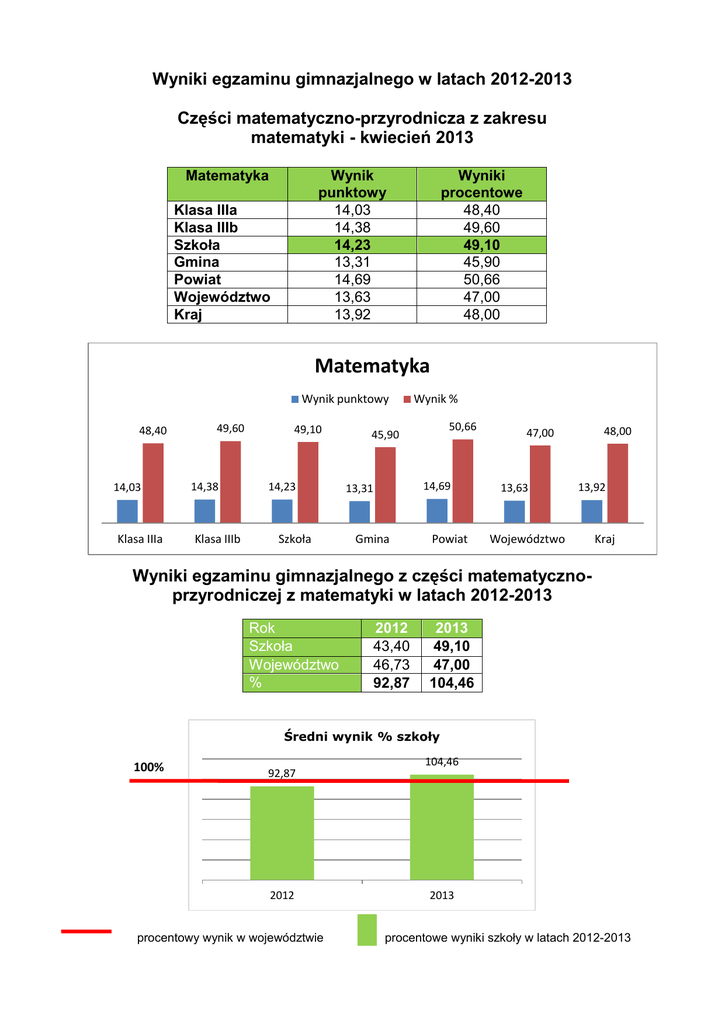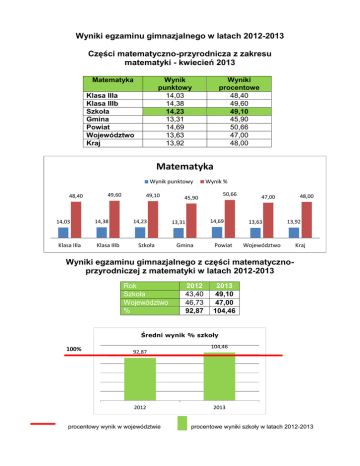Wyniki egzaminu gimnazjalnego w latach 2012-2013 Części matematyczno-przyrodnicza z zakresu matematyki - kwiecień 2013 Matematyka Wynik punktowy 14,03 14,38 14,23 13,31 14,69 13,63 13,92 Klasa IIIa Klasa IIIb Szkoła Gmina Powiat Województwo Kraj Wyniki procentowe 48,40 49,60 49,10 45,90 50,66 47,00 48,00 Matematyka Wynik punktowy 48,40 14,03 Klasa IIIa 49,60 14,38 Klasa IIIb 49,10 14,23 Szkoła Wynik % 50,66 45,90 14,69 13,31 Gmina Powiat 48,00 47,00 13,63 13,92 Województwo Kraj Wyniki egzaminu gimnazjalnego z części matematycznoprzyrodniczej z matematyki w latach 2012-2013 Rok Szkoła Województwo % 2012 43,40 46,73 92,87 2013 49,10 47,00 104,46 Średni wynik % szkoły 100% 92,87 2012 procentowy wynik w województwie 104,46 2013 procentowe wyniki szkoły w latach 2012-2013 Wyniki punktowe egzaminu gimnazjalnego z części matematycznoprzyrodniczej z matematyki w skali staninowej w latach 2012-2013 Skala staninowa w% 1.najniższy 2.bardzo niski 3.niski 4.niżej średni 5.średni 6.wyżej średni 7.wysoki 8.bardzo wysoki 9.najwyższy Wyniki egzaminu gimnazjalnego część matematyczno-przyrodnicza – matematyka 2012 2013 17,0–24,6 14,4–24,5 24,7–34,7 24,6–34,8 34,8–39,6 34,9–40,3 39,7–43,4 40,4–44,3 43,5–47,6 44,4–48,3 47,7–52,2 48,4–53,0 52,3–58,6 53,1–59,4 58,7–70,8 59,5–72,2 70,9–96,4 72,3–98,9 Staniny Wyniki w skali staninowej 9 8 7 6 5 4 3 2 1 0 6 4 2012 2013 Części matematyczno-przyrodnicza z zakresu przedmiotów przyrodniczych - kwiecień 2013 Przedmioty przyrodnicze Klasa IIIa Klasa IIIb Szkoła Gmina Powiat Województwo Kraj Wyniki punktowe 16,26 17,69 17,08 16,57 16,64 16,24 16,52 Wyniki procentowe 58,10 63,20 61,00 59,20 59,44 58,00 59,00 Przedmioty przyrodnicze Wynik punktowy 58,10 16,26 Klasa IIIa 63,20 17,69 Klasa IIIb 61,00 17,08 Szkoła Wynik % 59,44 59,20 16,64 16,57 Gmina Powiat 58,00 16,24 Województwo 59,00 16,52 Kraj Wyniki egzaminu gimnazjalnego z części matematycznoprzyrodniczej z przedmiotów przyrodniczych w latach 2012-2013 Rok Szkoła Województwo % 2012 47,60 48,92 97,30 2013 61,00 58,00 105,17 Średni wynik % szkoły 100% 97,3 2012 procentowy wynik w województwie 105,17 2013 procentowe wyniki szkoły w latach 2012-2013 Wyniki punktowe egzaminu gimnazjalnego z części matematycznoprzyrodniczej z przedmiotów przyrodniczych w skali staninowej w latach 2012-2013 Skala staninowa w% 1.najniższy 2.bardzo niski 3.niski 4.niżej średni 5.średni 6.wyżej średni 7.wysoki 8.bardzo wysoki 9.najwyższy Wyniki egzaminu gimnazjalnego część matematyczno-przyrodnicza – przedmioty przyrodnicze 2012 2013 22,1–34,4 22,6–39,6 34,5–41,8 39,7–49,4 41,9–45,0 49,5–53,5 45,1–47,5 53,6–56,5 47,6–50,1 56,6–59,7 50,2–53,0 59,8–63,0 53,1–57,1 63,1–67,4 57,2–65,2 67,5–75,6 65,3–91,0 75,7–97,7 Staniny Wyniki w skali staninowej 9 8 7 6 5 4 3 2 1 0 5 2012 6 2013