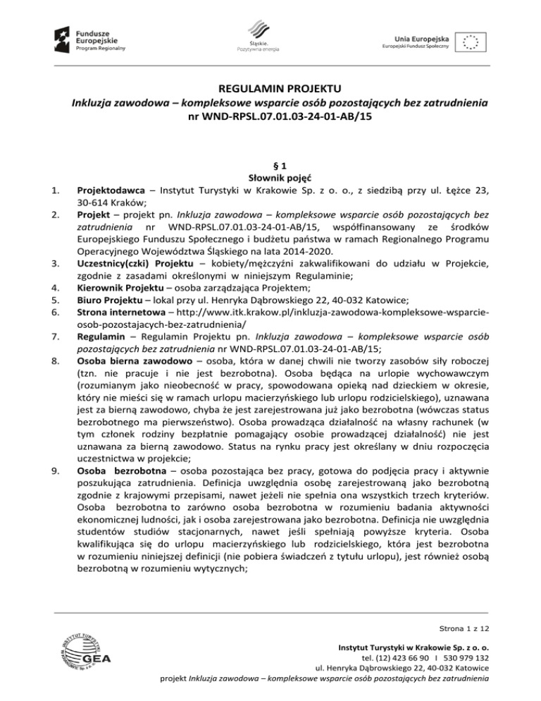 REGULAMIN PROJEKTU Inkluzja zawodowa – kompleksowe wsparcie osób pozostających bez zatrudnienia nr WND-RPSL.07.01.03-24-01-AB/15 1. 2. 3. 4. 5. 6. 7. 8. 9. §1 Słownik pojęć Projektodawca – Instytut Turystyki w Krakowie Sp. z o. o., z siedzibą przy ul. Łężce 23, 30-614 Kraków; Projekt – projekt pn. Inkluzja zawodowa – kompleksowe wsparcie osób pozostających bez zatrudnienia nr WND-RPSL.07.01.03-24-01-AB/15, współfinansowany ze środków Europejskiego Funduszu Społecznego i budżetu państwa w ramach Regionalnego Programu Operacyjnego Województwa Śląskiego na lata 2014-2020. Uczestnicy(czki) Projektu – kobiety/mężczyźni zakwalifikowani do udziału w Projekcie, zgodnie z zasadami określonymi w niniejszym Regulaminie; Kierownik Projektu – osoba zarządzająca Projektem; Biuro Projektu – lokal przy ul. Henryka Dąbrowskiego 22, 40-032 Katowice; Strona internetowa – http://www.itk.krakow.pl/inkluzja-zawodowa-kompleksowe-wsparcieosob-pozostajacych-bez-zatrudnienia/ Regulamin – Regulamin Projektu pn. Inkluzja zawodowa – kompleksowe wsparcie osób pozostających bez zatrudnienia nr WND-RPSL.07.01.03-24-01-AB/15; Osoba bierna zawodowo – osoba, która w danej chwili nie tworzy zasobów siły roboczej (tzn. nie pracuje i nie jest bezrobotna). Osoba będąca na urlopie wychowawczym (rozumianym jako nieobecność w pracy, spowodowana opieką nad dzieckiem w okresie, który nie mieści się w ramach urlopu macierzyńskiego lub urlopu rodzicielskiego), uznawana jest za bierną zawodowo, chyba że jest zarejestrowana już jako bezrobotna (wówczas status bezrobotnego ma pierwszeństwo). Osoba prowadząca działalność na własny rachunek (w tym członek rodziny bezpłatnie pomagający osobie prowadzącej działalność) nie jest uznawana za bierną zawodowo. Status na rynku pracy jest określany w dniu rozpoczęcia uczestnictwa w projekcie; Osoba bezrobotna – osoba pozostająca bez pracy, gotowa do podjęcia pracy i aktywnie poszukująca zatrudnienia. Definicja uwzględnia osobę zarejestrowaną jako bezrobotną zgodnie z krajowymi przepisami, nawet jeżeli nie spełnia ona wszystkich trzech kryteriów. Osoba bezrobotna to zarówno osoba bezrobotna w rozumieniu badania aktywności ekonomicznej ludności, jak i osoba zarejestrowana jako bezrobotna. Definicja nie uwzględnia studentów studiów stacjonarnych, nawet jeśli spełniają powyższe kryteria. Osoba kwalifikująca się do urlopu macierzyńskiego lub rodzicielskiego, która jest bezrobotna w rozumieniu niniejszej definicji (nie pobiera świadczeń z tytułu urlopu), jest również osobą bezrobotną w rozumieniu wytycznych; Strona 1 z 12 Instytut Turystyki w Krakowie Sp. z o. o. tel. (12) 423 66 90 I 530 979 132 ul. Henryka Dąbrowskiego 22, 40-032 Katowice projekt Inkluzja zawodowa – kompleksowe wsparcie osób pozostających bez zatrudnienia 10. 11. 12. 13. 1. 2. Osoba bezrobotna niezarejestrowana w ewidencji urzędów pracy – osoba bezrobotna (tj. pozostająca bez pracy, gotowa do podjęcia pracy i aktywnie poszukująca zatrudnienia) jednak niepozostająca w rejestrach urzędów pracy. Osoba kwalifikująca się do urlopu macierzyńskiego lub rodzicielskiego, która jest bezrobotna w rozumieniu niniejszej definicji (nie pobiera świadczeń z tytułu urlopu), jest również osobą bezrobotną w rozumieniu wytycznych; Osoba długotrwale bezrobotna – definicja pojęcia „długotrwale bezrobotny” różni się w zależności od wieku: a) młodzież (osoba w wieku do 25 lat) – osoba bezrobotna nieprzerwanie przez okres ponad 6 miesięcy, b) dorośli (osoba w wieku 25 lat lub więcej) – osoba bezrobotna nieprzerwanie przez okres ponad 12 miesięcy; Wiek Uczestników(czek) Projektu jest określany na podstawie daty urodzenia i ustalany w dniu rozpoczęcia udziału w projekcie; Osoba o niskich kwalifikacjach – osoba posiadająca wykształcenie na poziomie do ISCED 3 włącznie: wykształcenie podstawowe, gimnazjalne, ponadgimnazjalne: liceum ogólnokształcące, technikum, zasadnicza szkoła zawodowa. Stopień uzyskanego wykształcenia jest określany w dniu rozpoczęcia uczestnictwa w projekcie; Osoba niepełnosprawna – osoba niepełnosprawna w rozumieniu ustawy z dnia 27 sierpnia 1997 r. o rehabilitacji zawodowej i społecznej oraz zatrudnieniu osób niepełnosprawnych (tj. Dz. U. z 2011 r. Nr 127 poz. 721, z późn. zm.), a także osoby z zaburzeniami psychicznymi, w rozumieniu ustawy z dnia 19 sierpnia 1994 r. o ochronie zdrowia psychicznego (tj. Dz. U. z. 2011 r. Nr 231 poz. 1375, z późn. zm.), tj. osoby z odpowiednim orzeczeniem lub innym dokumentem poświadczającym stan zdrowia. Przynależność do grupy osób niepełnosprawnych określana jest w momencie rozpoczęcia udziału w projekcie. §2 Postanowienia ogólne Projekt Inkluzja zawodowa – kompleksowe wsparcie osób pozostających bez zatrudnienia nr WND-RPSL.07.01.03-24-01-AB/15 jest realizowany przez Instytut Turystyki w Krakowie Sp. z o. o., z siedzibą główną przy ul. Łężce 23, 30-614 Kraków, na podstawie umowy o dofinansowanie nr RPSL.07.01.03-24-01AB/15-00, zawartej w dniu 01.09.2016 r. z Wojewódzkim Urzędem Pracy w Katowicach, w ramach Regionalnego Programu Operacyjnego Województwa Śląskiego na lata 2014-2020, Oś Priorytetowa VII Regionalny Rynek Pracy, Działanie 7.1. Aktywne formy przeciwdziałania bezrobociu, Poddziałanie 7.1.3 Poprawa zdolności do zatrudnienia osób poszukujących pracy i pozostających bez zatrudnienia. Niniejszy Regulamin określa: – formy wsparcia; – kryteria i warunki uczestnictwa w Projekcie; – procedury rekrutacji Uczestników(czek) Projektu; Strona 2 z 12 Instytut Turystyki w Krakowie Sp. z o. o. tel. (12) 423 66 90 I 530 979 132 ul. Henryka Dąbrowskiego 22, 40-032 Katowice projekt Inkluzja zawodowa – kompleksowe wsparcie osób pozostających bez zatrudnienia 3. 4. 5. 6. – zasady organizacji poszczególnych działań w ramach Projektu; – uprawnienia i obowiązki Uc