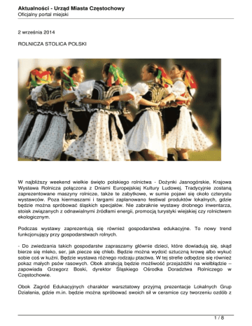 Aktualności - Urząd Miasta Częstochowy Oficjalny portal miejski 2 września 2014 ROLNICZA STOLICA POLSKI W najbliższy weekend wielkie święto polskiego rolnictwa - Dożynki Jasnogórskie, Krajowa Wystawa Rolnicza połączona z Dniami Europejskiej Kultury Ludowej. Tradycyjnie zostaną zaprezentowane maszyny rolnicze, także te zabytkowe, w sumie pojawi się około czterystu wystawców. Poza kiermaszami i targami zaplanowano festiwal produktów lokalnych, gdzie będzie można spróbować śląskich specjałów. Nie zabraknie wystawy drobnego inwentarza, stoisk związanych z odnawialnymi źródłami energii, promocją turystyki wiejskiej czy rolnictwem ekologicznym. Podczas wystawy zaprezentują się również gospodarstwa edukacyjne. To nowy trend funkcjonujący przy gospodarstwach rolnych. - Do zwiedzania takich gospodarstw zapraszamy głównie dzieci, które dowiadują się, skąd bierze się mleko, ser, jak piecze się chleb. Będzie można wydoić sztuczną krowę albo wykuć sobie coś w kuźni. Będzie wystawa różnego rodzaju ptactwa. W tej strefie odbędzie się również pokaz małych psów rasowych. Obok atrakcją będzie możliwość przejażdżki na wielbłądzie – zapowiada Grzegorz Boski, dyrektor Śląskiego Ośrodka Doradztwa Rolniczego w Częstochowie. Obok Zagród Edukacyjnych charakter warsztatowy przyjmą prezentacje Lokalnych Grup Działania, gdzie m.in. będzie można spróbować swoich sił w ceramice czy tworzeniu ozdób z 1/8 Aktualności - Urząd Miasta Częstochowy Oficjalny portal miejski wiórków drewna osikowego. Inauguracja Krajowej Wystawy Rolniczej i Dni Europejskiej Kultury Ludowej odbędzie się w sobotę o godz. 10 w Akademii Polonijnej. Podczas otwarcia rozstrzygnięte zostaną konkursy regionalne i wojewódzkie. W konkursie "AgroLiga 2014" nagrody otrzymają najlepsze firmy związane z sektorem rolniczym w naszym województwie. Nagrodzone zostanie najlepsze gospodarstwo ekologiczne i agroturystyczne. Rozstrzygnięty zostanie również konkurs na najlepszy zakład przetwórstwa rolno-spożywczego oraz najlepsze gospodarstwo rolne regionu częstochowskiego. Zaproszeni goście w towarzystwie Orkiestry Dętej z OSP Miedźno przewędrują z Akademii Polonijnej w Aleje Najświętszej Maryi Panny na miejsce Krajowej Wystawy Rolniczej. O godz. 14 w Starostwie Powiatowym w Częstochowie przewidziane jest spotkanie wszystkich instytucji rolniczych województwa śląskiego. Dzień domknie występ Zespołu Pieśni i Tańca "Śląsk" w Filharmonii Częstochowskiej z programem "A to Polska właśnie". Tuż przed koncertem będą wręczane statuetki dyrektora Ośrodka Doradztwa Rolniczego dla najlepszych trzech rolników z naszego województwa i puchary ministra rolnictwa dla najlepszych maszyn zaprezentowanych na Krajowej Wystawie Rolniczej. W niedzielę odbędzie się msza święta na błoniach jasnogórskich. Wystawie sekundują Dni Europejskiej Kultury Ludowej organizowane po raz piętnasty. Targi Sztuki Ludowej rozpoczną się już w piątek o godz. 10 i potrwają do niedzielnego popołudnia. - W tym roku mamy 14 wystawców w zakresie sztuki ludowej - opowiada Tadeusz Piersiak, dyrektor Ośrodka Promocji Kultury Gaude Mater. - Sięgniemy po formy tak szlachetne jak koniakowskie koronki. Przyjedzie do nas pani Danuta Krasowska, posiadaczka rekordu Guinnessa z sierpnia ubiegłego roku, która wspólnie z koleżankami zrobiła rekordową koronkę koniakowską. Ważnym elementem DEKL będzie piątkowa wystawa w Regionalnym Ośrodku Kultury poświęcona Oskarowi Kolbergowi, kompozytorowi, folkloryście, etnografowi. - Wernisażowi będzie towarzyszył prawdziwie wiejski stół – zaprasza Lidia Koj z ROK-u. W sobotę i niedzielę funkcjonować będzie estrada folkloru, na której wystąpi w sumie 12 zespołów, z czego trzy zagraniczne. TJ 5-7 września Dni Europejskiej Kultury Ludowej Miejsce: Regionalny Ośrodek Kultury, Plac Biegańskiego 6 i 7 września Krajowa Wystawa Rolnicza - godz. 10-18 Miejsce: Aleje Najświętszej Maryi Panny (III i II Aleja – więcej na mapce) 2/8 Aktualności - Urząd Miasta Częstochowy Oficjalny portal miejski PROGRAM XXIII Krajowej Wystawy Rolniczej Ogólnopolskie Dożynki Jasnogórskie w Częstochowie XV Dni Europejskiej Kultury Ludowej 5 września (piątek) 11.00 - 17.30 - Park Staszica: wystawa „W domu tkaczki” Zagroda Włościańska Wystawa „Hoczki, szczytki i orpanty” – strój i biżuteria cieszy1ńska Pawilon Wystawowy. Muzeum Częstochowskie 18.00 - otwarcie wystawy „OSKAR” KOLBERG ze zbiorów Muzeum Wsi Radomskiej Regionalny Ośrodek Kultury w Częstochowie, ul. Ogińskiego 13 a 6 września (sobota) 9.45 - 10.00 - przyjazd zaproszonych Gości (Akademia Polonijna ul. Gen. Kazimierza Pułaskiego 4/6) - otwarcie Krajowej Wystawy Rolniczej i Dni Europejskiej Kultury Ludowej - powitanie Gości - wystąpienia zaproszonych Gości - podsumowanie finału wojewódzkiego konkursu AGROLIGA 2014 w woj. śląskim - podsumowanie finału wojewódzkiego konkursu „Najlepsze gospodarstwo agroturystyczne” w woj. śląskim - podsumowanie finału wojewódzkiego konkursu „Najlepsze gospodarstwo ekologiczne” w woj. śląskim - podsumowanie konkursu „Najlepszy zakład przetwórstwa rolno- spożywczego oraz najlepsze gospodarstwo rolne Regionu Częstochowskiego” 11.30 - 12.30 - Przemarsz w korowodzie orkiestry dętej, zwiedzanie wystawy 10.00 - 21.00 - Targi Sztuki Ludowej – (Plac Biegańskiego) 11.00 - 18.00 - Park Staszica: wystawa „W domu tkaczki” Zagroda Włościańska wystawa „Hoczki, szczytki i orpanty” – strój i biżuteria cieszyńska Pawilon Wystawowy. Muzeum Częstochowskie 14.00 - spotkanie przedstawicieli instytucji rolniczych woj. Śląskiego Starostwo Powiatowe w Częstochowie 15.00 - 20.00 - koncerty zespołów pieśni i tańca, kapel ludowych z kraju i zagranicy (Plac Władysława Biegańskiego w Częstochowie) 18.00 - 20.00 - koncert Galowy Zespołu Pieśni i Tańca „ Śląsk” Filha