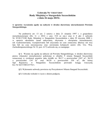 Uchwała Nr VIII/67/2015 Rady Miejskiej w Stargardzie Szczecińskim z dnia 26 maja 2015r. w sprawie: wyrażenia zgody na nabycie w drodze darowizny nieruchomości Powiatu Stargardzkiego. Na podstawie art. 13 ust. 2 ustawy z dnia 21 sierpnia 1997 r. o gospodarce nieruchomościami (Dz. U. z 2014 r. poz. 518 ze zm.) oraz § 4 pkt 2 uchwały Nr XVII/173/08 Rady Miejskiej w Stargardzie Szczecińskim z dnia 29 stycznia 2008 r. w sprawie określenia zasad nabywania, zbywania i obciążania nieruchomości, ich wydzierżawiania, wynajmowania lub użyczania na czas oznaczony dłuższy niż trzy lata lub na czas nieoznaczony oraz zawierania kolejnych umów (Dz. Urz. Woj. Zachodniopomorskiego Nr 32, poz. 617) uchwala się, co następuje: § 1. Wyraża się zgodę na nabycie od Powiatu Stargardzkiego, w drodze darowizny prawa własności nieruchomości położonej w obrębie 9 miasta Stargard Szczeciński oznaczonej w ewidencji gruntów jako działki nr: 96/17 o powierzchni 1947 m2, 96/19 o powierzchni 134 m2 oraz 96/20 o powierzchni 356 m2, dla której Sąd Rejonowy w Stargardzie Szczecińskim prowadzi księgę wieczystą Kw Nr SZ1T/00123776/1. § 2. Wykonanie uchwały powierza się Prezydentowi Miasta Stargard Szczeciński. § 3. Uchwała wchodzi w życie z dniem podjęcia. UZASADNIENIE Nieruchomość gruntowa położona w obrębie 9 miasta Stargard Szczeciński oznaczona w ewidencji gruntów jako działki nr: 96/17 o powierzchni 1947 m2, 96/19 o powierzchni 134 m2 oraz 96/20 o powierzchni 356 m2, dla której Sąd Rejonowy w Stargardzie Szczecińskim prowadzi księgę wieczystą Kw Nr SZ1T/00123776/1, której użytkownikiem wieczystym jest Gmina - Miasto Stargard Szczeciński, stanowi własność Powiatu Stargardzkiego. Prawo użytkowania wieczystego przedmiotowych działek Gmina – Miasto Stargard Szczeciński nabyła aktem notarialnym Rep. „A” Nr 6306/2014 z dnia 05.11.2014 r. w drodze zamiany. Zamiana nieruchomości realizowana była w celu kompleksowego zagospodarowania terenu w rejonie ulic: Tadeusza Kościuszki i Szczecińskiej oraz rozliczenia wynagrodzenia za teren przeznaczony pod drogę lokalną. Zgodnie z obowiązującym miejscowym planem zagospodarowania przestrzennego miasta Stargardu Szczecińskiego dotyczącym terenu w rejonie ulic: T. Kościuszki, Szczecińskiej, Słonecznej przyjętym uchwałą Rady Miejskiej Nr XXI/235/2012 z dnia 25 września 2012 r. działka nr 96/20 stanowi część pasa drogowego oznaczonego w planie symbolem 04.KD.L., działka nr 96/17 stanowi część pasa drogowego oznaczonego w planie symbolem 04.1.KD.L., natomiast działka nr 96/19 stanowi część pasa drogowego oznaczonego w planie symbolem 02.KD.Z. Rada Powiatu w Stargardzie Szczecińskim uchwałą Nr V/73/15 z dnia 25 marca 2015 r. wyraziła zgodę na darowiznę nieruchomości położonej w obrębie 9 miasta Stargard Szczeciński oznaczonej w ewidencji gruntów jako działki nr: 96/17 o powierzchni 1947 m2, 96/19 o powierzchni 134 m2 oraz 96/20 o powierzchni 356 m2. Wartość prawa własności nieruchomości o łącznej powierzchni 2 437 m² według wyceny sporządzonej w sierpniu 2014 r. wynosi 395 769 zł. Wartość prawa użytkowania wieczystego wynosi 271 497 zł . Wartość przedmiotu darowizny wynosi 124 272 zł. Darowizna prawa własności Powiatu Stargardzkiego nieruchomości położonej w obrębie 9 miasta Stargard Szczeciński oznaczonej w ewidencji gruntów jako działki nr: 96/17, 96/19 oraz 96/20 na rzecz Gminy - Miasta Stargard Szczeciński realizowana jest w celu regulacji stanu prawnego i uporządkowania charakteru władania ww. nieruchomości. Zgodnie z uchwałą Rady Miejskiej, o której mowa w podstawie prawnej wymaga zgody Rady Miejskiej nabycie nieruchomości w przypadkach, o których mowa w art.13 ust. 2, tj. nieruchomość może być, z zastrzeżeniem art. 59 ust. 1, przedmiotem darowizny na cele publiczne, a także przedmiotem darowizny dokonywanej między Skarbem Państwa a jednostką samorządu terytorialnego, a także między tymi jednostkami. W umowie darowizny określa się cel, na który nieruchomość jest darowana. W przypadku niewykorzystania nieruchomości na ten cel darowizna podlega odwołaniu, z zastrzeżeniem ust. 2a. W związku z powyższym podjęcie uchwały jest zasadne.