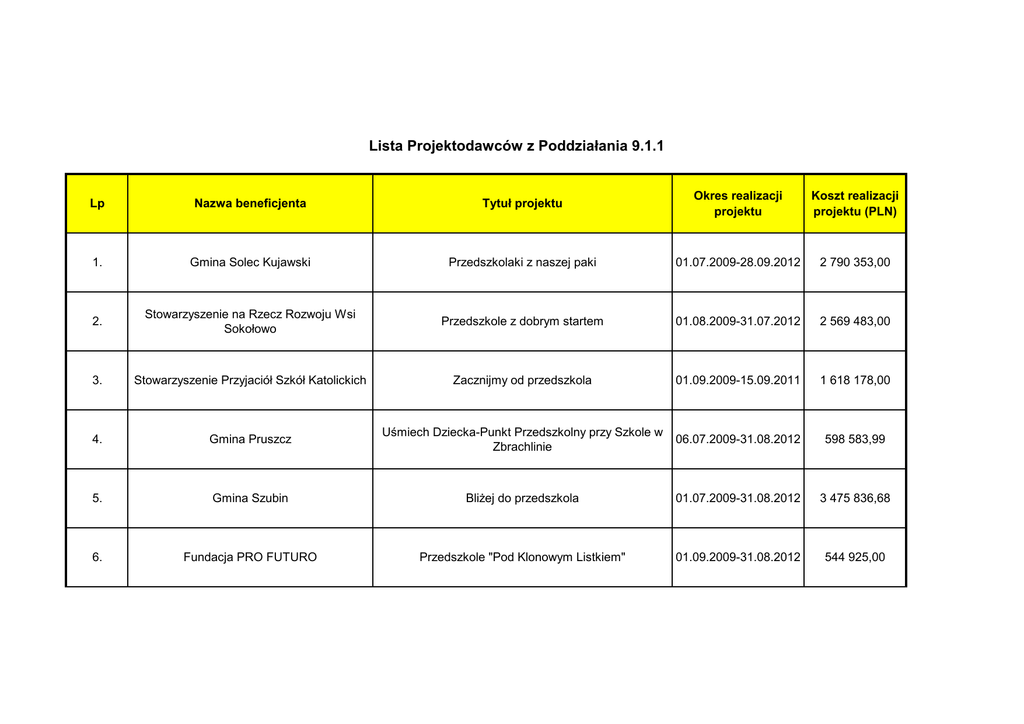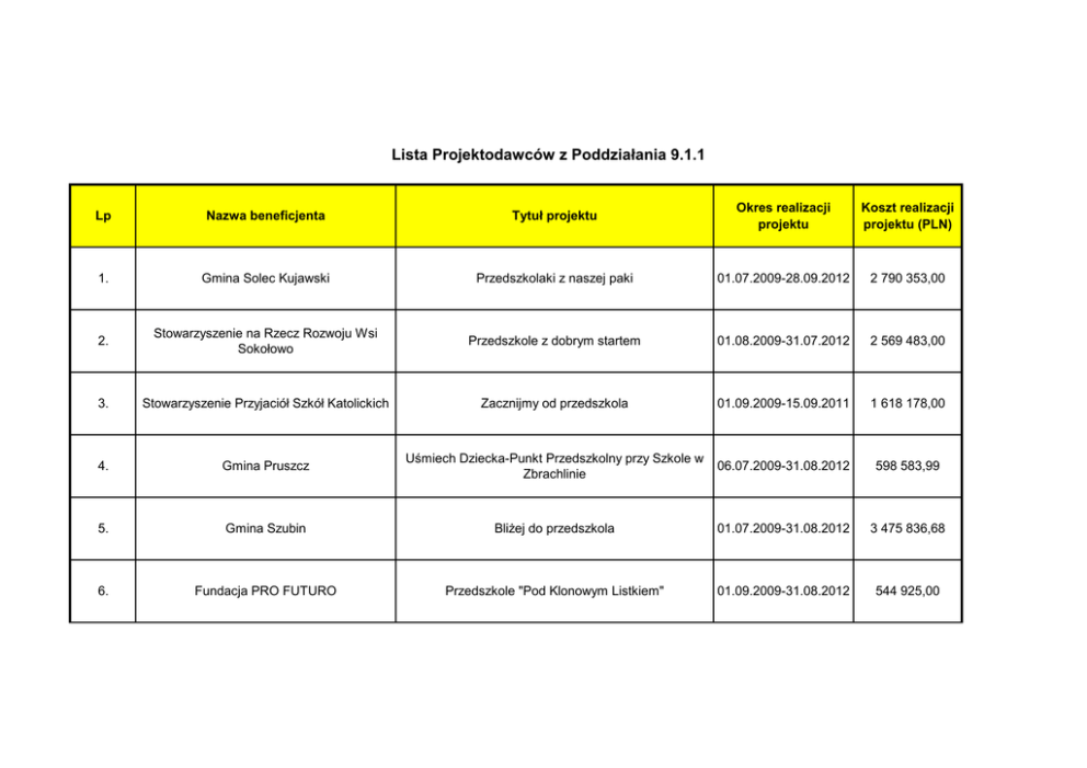 Lista Projektodawców z Poddziałania 9.1.1 Lp Nazwa beneficjenta Tytuł projektu Okres realizacji projektu Koszt realizacji projektu (PLN) 1. Gmina Solec Kujawski Przedszkolaki z naszej paki 01.07.2009-28.09.2012 2 790 353,00 2. Stowarzyszenie na Rzecz Rozwoju Wsi Sokołowo Przedszkole z dobrym startem 01.08.2009-31.07.2012 2 569 483,00 3. Stowarzyszenie Przyjaciół Szkół Katolickich Zacznijmy od przedszkola 01.09.2009-15.09.2011 1 618 178,00 4. Gmina Pruszcz Uśmiech Dziecka-Punkt Przedszkolny przy Szkole w Zbrachlinie 06.07.2009-31.08.2012 598 583,99 5. Gmina Szubin BliŜej do przedszkola 01.07.2009-31.08.2012 3 475 836,68 6. Fundacja PRO FUTURO Przedszkole "Pod Klonowym Listkiem" 01.09.2009-31.08.2012 544 925,00 Upowszechnianie edukacji przedszkolnej na terenie Włocławka i jego okolic przez St. FORMA 7. FORMA 01.07.2009-30.06.2012 2 026 800,40 8. Fundacja "Edukacyjne Drogi Polek i Polaków" Przedszkole na wsi szansą na dobry rozwój dzieci - II 01.08.2009-30.09.2011 edycja 3 656 141,00 9. Stowarzyszenie Rozwoju Gminy Łysomice Przedszkole marzeń 01.07.2009-31.08.2011 715 895,00 10. FHU Apteka Panaceum Maria Jolanta Wyborska FHU OMEGA - Firma Szkoleniowa Edukacja przedszkolna w gminach Bobrowniki, Czernikowo, Wielgie i Zbójno 01.09.2009-31.07.2012 988 539,63 11. Gmina Złotniki Kujawskie Przedszkole - Rodzina to jedna rodzina. Wspólnie bawi, uczy, integruje - szansę dzieci wyrównuje 01.09.2009-12.09.2011 103 544,00 12. Przedszkole Niepubliczne BimbamBino S.C. Mały artysta na wsi i w mieście 01.07.2009-31.07.2012 2 999 699,00 13. Urząd Gminy Jeziora Wielkie Przedszkolaki z Nadgoplańskiej Paki 01.07.2009-30.06.2012 813 236,49 14. Demokratyczna Unia Kobiet - Rada Krajowa Dołącz do nas przedszkolaku 01.08.2009-31.08.2011 1 663 330,00 15. Ośrodek Rewalidacyjno Wychowawczy "Tęcza" dla Dzieci i MłodzieŜy z Autyzmem Poprawa dostępu do wczesnej edukacji dzieci z autyzmem poprzez utworzenie specjalistycznego przedszkola "Tęcza" 01.07.2009-31.08.2011 1 334 962,46 16. Powiat Chełmiński Wyrównywanie szans edukacyjnych dzieci niepełnosprawnych poprzez rozwój przedszkola specjalnego w powiecie chełmińskim 17. Szkoły- Toruń Artur Wojciechowski "Maja i Gucio pomagają przedszkolakom" 01.01.2010-31.08.2012 728 197,52 18. Stowarzyszenie kulturalno-oświatowe na rzecz rozwoju wsi Święte i okolic Mini przedszkole w Świętem 01.06.2009-31.08.2011 547 559,50 19. Gmina Miejska Wąbrzeźno- Urząd Miejski Przyjazne przedszkole 19.07.2009-14.08.2011 660 747,50 20. Gmina Aleksandrów Kujawski Lepszy START-lepsza przyszłość 01.07.2009-31.07.2011 2 090 608,87 21. Gmina Miasto Grudziądz Dajmy szansę dzieciom 01.09.2009-31.08.2011 3 074 849,96 22. Parafia Św. R. Kalinowskiego w Murowańcu Parafialny Punkt Przedszkolny w Murowańcu 29.06.2009-31.08.2011 609 658,60 01.08.2009-31.08.2012 170 355,00