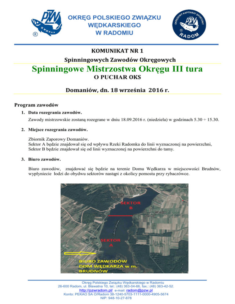 OKRĘG POLSKIEGO ZWIĄZKU WĘDKARSKIEGO W RADOMIU KOMUNIKAT NR 1 Spinningowych Zawodów Okręgowych Spinningowe Mistrzostwa Okręgu III tura O PUCHAR OKS Domaniów, dn. 18 września 2016 r. Program zawodów 1. Data rozegrania zawodów. Zawody mistrzowskie zostaną rozegrane w dniu 18.09.2016 r. (niedziela) w godzinach 5.30 ÷ 15.30. 2. Miejsce rozegrania zawodów. Zbiornik Zaporowy Domaniów. Sektor A będzie znajdował się od wpływu Rzeki Radomka do linii wyznaczonej na powierzchni, Sektor B będzie znajdował się od linii wyznaczonej na powierzchni do tamy. 3. Biuro zawodów. Biuro zawodów, znajdować się będzie na terenie Domu Wędkarza w miejscowości Brudnów, wypłyniecie łodzi do obydwu sektorów nastąpi z okolicy pomostu przy rybaczówce. Okręg Polskiego Związku Wędkarskiego w Radomiu 26-600 Radom, ul. Bławatna 10, tel.: (48) 363-04-66, fax.: (48) 363-42-52. http://pzwradom.pl/ e-mail: [email protected] Konto: PEKAO SA O/Radom 38-1240-5703-1111-0000-4905-5674 NIP: 948-10-27-878 OKRĘG POLSKIEGO ZWIĄZKU WĘDKARSKIEGO W RADOMIU 4. Zgłoszenie i prawo startu. Prawo startu w zawodach mają: Mistrz Okręgu w dyscyplinie spinningowej z 2015 r., Mistrzowie Kół wyłonieni na zawodach o mistrzostwo Kół oraz członkowie Okręgu PZW w Radomiu, którzy zostali zgłoszeni przez macierzyste Koła i Kluby. Warunkiem startu w zawodach jest pisemne (na obowiązującym formularzu) zgłoszenie udziału do dnia 15.09.2016 r. (czwartek) do godziny 16.00 w formie: - e-maila wysłanego na adres [email protected] - listu bądź faksu złożonego lub wysłanego na adres Biura Zarządu okręgu PZW w Radomiu. Zgłoszenie musi zawierać Nazwę Koła lub Klubu, w przypadku Seniorów zgłoszeniu podlegają zawodnicy i łodzie na zasadzie zgłaszania drużyny składającej się z: - łodzi, - dysponenta łodzi, - zawodnika drużyny, który zostanie rozlosowany do innej łodzi w innym sektorze niż dysponent. Nie ma ograniczeń w ilości zawodników zgłaszanych w kategorii Junior w wieku od 14 do 18 lat z zastrzeżeniem, ze do 16 lat obowiązuje pisemna zgoda prawnego opiekuna dołączona do zgłoszenia oraz wymagana jest obecność opiekuna w czasie trwania zawodów. Przy dolnej granicy wieku decyduje rok urodzenia. Zawodnicy i drużyny, które nie zostały zgłoszone w ww. sposób lub po terminie nie mają prawa startu w zawodach. 5. Zasady finansowania. Opłata startowa wynosi 30 zł. za zawodnika (60 zł. za drużynę) i jest pokrywana przez macierzyste Koła i Kluby. Za zawodników zgłoszonych, a nieobecnych opłatą startową zostają obciążone Koła lub Kluby. 6. Organizator zawodów. Organizatorem Zawodów jest Okręgowy Kapitanat Sportowy działający przy wsparciu pracowników Biura ZO. Organizatorem technicznym jest Koło PZW nr 20 Przysucha 7. Komisja sędziowska zawodów. W skład Komisji Sędziowskiej zawodów wchodzą: Kol. Beata OLEJARZ – Sędzia Główny, Kol. Daniel KOWALSKI – Sędzia Sekretarz. Pozostali członkowie Komisji Sędziowskiej przedstawieni zostaną podczas odprawy w dniu zawodów. Okręg Polskiego Związku Wędkarskiego w Radomiu 26-600 Radom, ul. Bławatna 10, tel.: (48) 363-04-66, fax.: (48) 363-42-52. http://pzwradom.pl/ e-mail: [email protected] Konto: PEKAO SA O/Radom 38-1240-5703-1111-0000-4905-5674 NIP: 948-10-27-878 OKRĘG POLSKIEGO ZWIĄZKU WĘDKARSKIEGO W RADOMIU 8. Szczegółowy program zawodów. Niedziela 18.09.2016 r. 5.30 – przyjmowanie zgłoszeń, sprawdzanie listy obecności, 5.45 – uroczyste otwarcie zawodów, losowanie sektorów i łodzi, 6.00 – przygotowanie do zawodów, 6.30 – I sygnał – wypłynięcie, czas do dopłyniecie do sektorów, 7.00 – II sygnał – początek II tury zawodów, 14.00 – III sygnał – koniec II tury zawodów, 14.30 – czas na dopłynięcie i zdanie sędziemu karty zawodnika, 15.00 – 15.30 – ogłoszenie wyników i uroczyste zakończenie zawodów. 9. Regulamin zawodów. Zawody zostaną rozegrane z poszanowaniem zasad Regulaminu Amatorskiego Połowu Ryb w oparciu o Regulamin zawodów spinningowych na żywej rybie ,zgodnie z zasadami sportu kwalifikowanego. http://www.pzw.org.pl/gks/wiadomosci/29812/67/zasady_organizacji_wedkarskiego_sportu_kwalifi kowanego_pzw 10. Nagrody w zawodach. W zawodach organizatorzy przewidzieli następujące nagrody: w klasyfikacji indywidualnej (kat. Senior i Junior): - puchary za miejsca 1-3, - medale za miejsca 1-3 - dyplomy za miejsca 1-6, - start Mistrza Okręgu w Mistrzostwach Polski z uwzględnieniem pokrycia kosztów przez Okręgowy Kapitanat Sportowy, na zasadach obowiązujących wg regulaminu OKS. w klasyfikacji drużynowej: - puchary za miejsca 1-3, - medale dla zawodników za miejsca 1-3, - medale dla koła/klubu za miejsca 1/3, - dyplomy dla zawodników za miejsca 1-6, - dyplomy dla Koła/Klubu za miejsca 1-6. 11. Uwagi końcowe. - Zawody są III turą Mistrzostw Okręgu. Zgłoszone łodzie przez zawodników muszą posiadać dokumenty rejestracyjne, oraz komplet wyposażenia ratunkowego zgodnie z Rozporządzenia Ministra infrastruktury z dnia 5 listopada 2010 roku DZU nr.216 poz. 1423 dotyczącego wyposażenia łodzi , każdy z zawodników powinien się z nim zapoznać, niedostosowanie się może skutkować mandatem w razie kontroli policji . http://isap.sejm.gov.pl/DetailsServlet?id=WDU20102161423 Okręg Polskiego Związku Wędkarskiego w Radomiu 26-600 Radom, ul. Bławatna 10, tel.: (48) 363-04-66, fax.: (48) 363-42-52. http://pzwradom.pl/ e-mail: [email protected] Konto: PEKAO SA O/Radom 38-1240-5703-1111-0000-4905-5674 NIP: 948-10-27-878 OKRĘG POLSKIEGO ZWIĄZKU WĘDKARSKIEGO W RADOMIU - Zawody zaliczane są klasyfikacji rocznej GPx Okręgu. Zawodnik ma obowiązek posiadania siatki lub pojemnika do przechowywania ryb. Organizator zapewnia dla uczestników gorący posiłek po zawodach i napoje. Przypominamy, że zawodnicy do lat 16-tu uczestniczący w zawodach muszą znajdować się pod opieką osoby dorosłej, biorącej za nią odpowiedzialność. Wg 