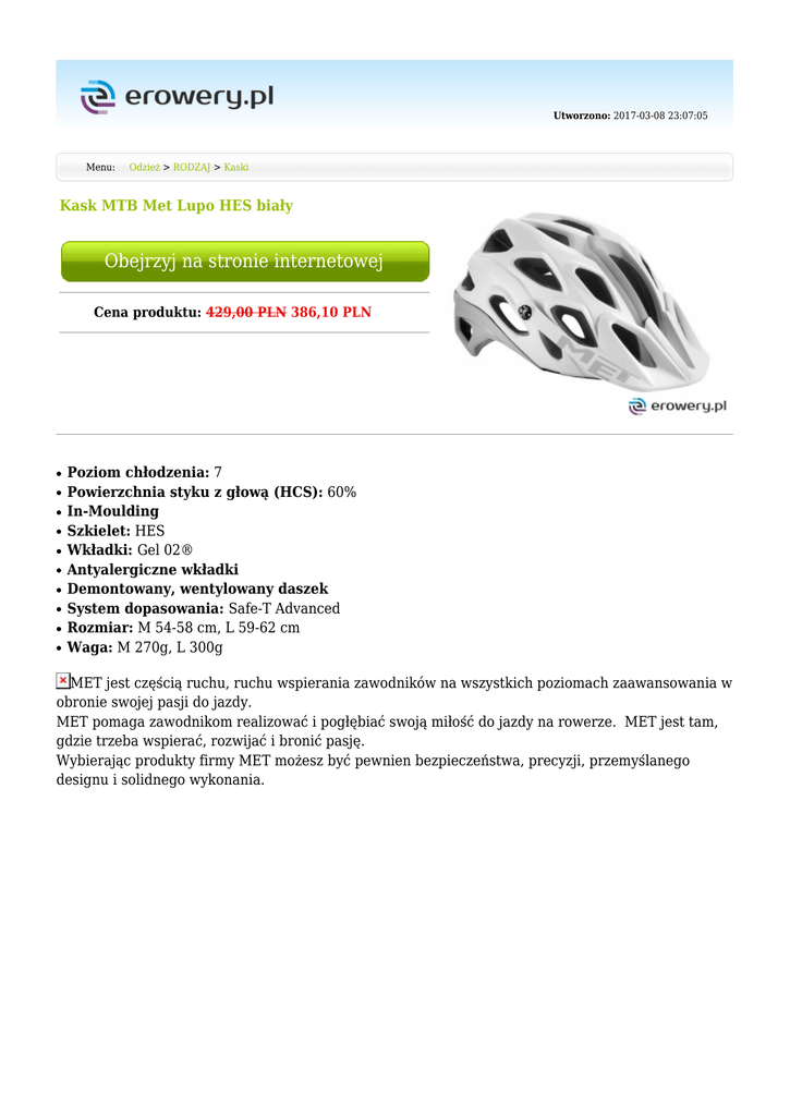 Utworzono: 2017-03-08 23:07:05 Menu: Odzież > RODZAJ > Kaski Kask MTB Met Lupo HES biały Obejrzyj na stronie internetowej Cena produktu: 429,00 PLN 386,10 PLN ● ● ● ● ● ● ● ● ● ● Poziom chłodzenia: 7 Powierzchnia styku z głową (HCS): 60% In-Moulding Szkielet: HES Wkładki: Gel 02® Antyalergiczne wkładki Demontowany, wentylowany daszek System dopasowania: Safe-T Advanced Rozmiar: M 54-58 cm, L 59-62 cm Waga: M 270g, L 300g MET jest częścią ruchu, ruchu wspierania zawodników na wszystkich poziomach zaawansowania w obronie swojej pasji do jazdy. MET pomaga zawodnikom realizować i pogłębiać swoją miłość do jazdy na rowerze. MET jest tam, gdzie trzeba wspierać, rozwijać i bronić pasję. Wybierając produkty firmy MET możesz być pewnien bezpieczeństwa, precyzji, przemyślanego designu i solidnego wykonania. Producent Met Cechy Regulacja obwodu, Daszek Przeznaczenie Kolor MTB Biały_#FFFFFF Mimo dołożenia wszelkich starań nie gwarantujemy, że publikowane opisy i specyfikacje techniczne niezawierają uchybień lub błędów, które nie mogą jednak być podstawą do roszczeń. W przypadku jakichkolwiek wątpliwości, przed podjęciem decyzji prosimy o kontakt. Adres: www.erowery.pl Telefon: 605 515 185, 34 361 16 71 Email: [email protected]