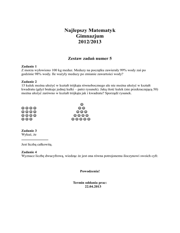 Najlepszy Matematyk Gimnazjum 2012/2013 Zestaw zadań numer 5 Zadanie 1 Z morza wyłowiono 100 kg meduz. Meduzy na początku zawierały 99% wody zaś po godzinie 98% wody. Ile ważyły meduzy po zmianie zawartości wody? Zadanie 2 15 kulek można ułożyć w kształt trójkąta równobocznego ale nie można ułożyć w kształt kwadratu (gdyż brakuje jednej kulki – patrz rysunek). Jaką ilość kulek (nie przekraczającą 50) można ułożyć zarówno w kształt trójkąta jak i kwadratu? Sporządź rysunek. Zadanie 3 Wykaż, że Jest liczbą całkowitą. Zadanie 4 Wyznacz liczbę dwucyfrową, wiedząc że jest ona równa potrojonemu iloczynowi swoich cyfr. Powodzenia! Termin oddania prac: 22.04.2013