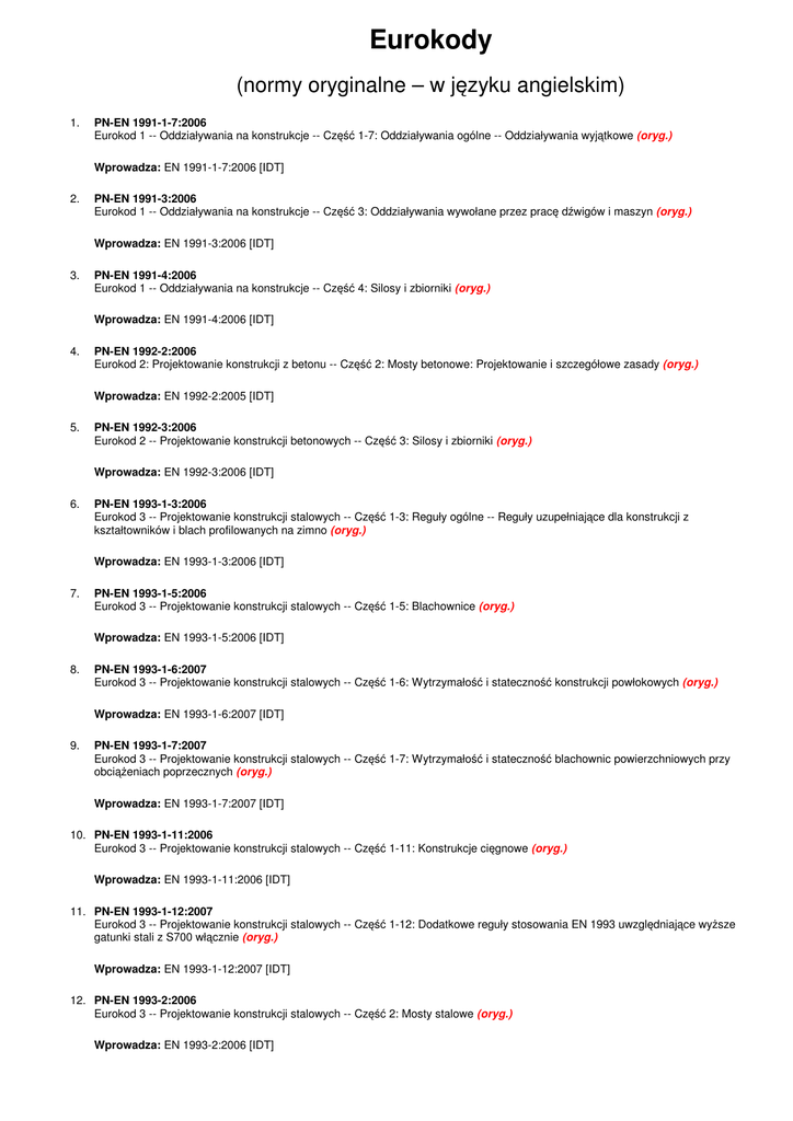 Eurokody (normy oryginalne – w języku angielskim) 1. PN-EN 1991-1-7:2006 Eurokod 1 -- Oddziaływania na konstrukcje -- Część 1-7: Oddziaływania ogólne -- Oddziaływania wyjątkowe (oryg.) Wprowadza: EN 1991-1-7:2006 [IDT] 2. PN-EN 1991-3:2006 Eurokod 1 -- Oddziaływania na konstrukcje -- Część 3: Oddziaływania wywołane przez pracę dźwigów i maszyn (oryg.) Wprowadza: EN 1991-3:2006 [IDT] 3. PN-EN 1991-4:2006 Eurokod 1 -- Oddziaływania na konstrukcje -- Część 4: Silosy i zbiorniki (oryg.) Wprowadza: EN 1991-4:2006 [IDT] 4. PN-EN 1992-2:2006 Eurokod 2: Projektowanie konstrukcji z betonu -- Część 2: Mosty betonowe: Projektowanie i szczegółowe zasady (oryg.) Wprowadza: EN 1992-2:2005 [IDT] 5. PN-EN 1992-3:2006 Eurokod 2 -- Projektowanie konstrukcji betonowych -- Część 3: Silosy i zbiorniki (oryg.) Wprowadza: EN 1992-3:2006 [IDT] 6. PN-EN 1993-1-3:2006 Eurokod 3 -- Projektowanie konstrukcji stalowych -- Część 1-3: Reguły ogólne -- Reguły uzupełniające dla konstrukcji z kształtowników i blach profilowanych na zimno (oryg.) Wprowadza: EN 1993-1-3:2006 [IDT] 7. PN-EN 1993-1-5:2006 Eurokod 3 -- Projektowanie konstrukcji stalowych -- Część 1-5: Blachownice (oryg.) Wprowadza: EN 1993-1-5:2006 [IDT] 8. PN-EN 1993-1-6:2007 Eurokod 3 -- Projektowanie konstrukcji stalowych -- Część 1-6: Wytrzymałość i stateczność konstrukcji powłokowych (oryg.) Wprowadza: EN 1993-1-6:2007 [IDT] 9. PN-EN 1993-1-7:2007 Eurokod 3 -- Projektowanie konstrukcji stalowych -- Część 1-7: Wytrzymałość i stateczność blachownic powierzchniowych przy obciążeniach poprzecznych (oryg.) Wprowadza: EN 1993-1-7:2007 [IDT] 10. PN-EN 1993-1-11:2006 Eurokod 3 -- Projektowanie konstrukcji stalowych -- Część 1-11: Konstrukcje cięgnowe (oryg.) Wprowadza: EN 1993-1-11:2006 [IDT] 11. PN-EN 1993-1-12:2007 Eurokod 3 -- Projektowanie konstrukcji stalowych -- Część 1-12: Dodatkowe reguły stosowania EN 1993 uwzględniające wyższe gatunki stali z S700 włącznie (oryg.) Wprowadza: EN 1993-1-12:2007 [IDT] 12. PN-EN 1993-2:2006 Eurokod 3 -- Projektowanie konstrukcji stalowych -- Część 2: Mosty stalowe (oryg.) Wprowadza: EN 1993-2:2006 [IDT] 13. PN-EN 1993-3-1:2006 Eurokod 3 -- Projektowanie konstrukcji stalowych -- Część 3 -1: Wieże, maszty i kominy -- Wieże i maszty (oryg.) Wprowadza: EN 1993-3-1:2006 [IDT] 14. PN-EN 1993-3-2:2006 Eurokod 3 -- Projektowanie konstrukcji stalowych -- Część 3 -2: Wieże, maszty i kominy -- Kominy (oryg.) Wprowadza: EN 1993-3-2:2006 [IDT] 15. PN-EN 1993-4-1:2007 Eurokod 3 -- Projektowanie konstrukcji stalowych -- Część 4-1: Silosy (oryg.) Wprowadza: EN 1993-4-1:2007 [IDT] 16. PN-EN 1993-4-2:2007 Eurokod 3 -- Projektowanie konstrukcji stalowych -- Część 4-2: Zbiorniki (oryg.) Wprowadza: EN 1993-4-2:2007 [IDT] 17. PN-EN 1993-4-3:2007 Eurokod 3 -- Projektowanie konstrukcji stalowych -- Część 4-3: Rurociągi (oryg.) Wprowadza: EN 1993-4-3:2007 [IDT] 18. PN-EN 1993-5:2007 Eurokod 3 -- Projektowanie konstrukcji stalowych -- Część 5: Palowanie i grodze (oryg.) Wprowadza: EN 1993-5:2007 [IDT] 19. PN-EN 1993-6:2007 Eurokod 3 -- Projektowanie konstrukcji stalowych -- Część 6: Konstrukcje wsporcze suwnic (oryg.) Wprowadza: EN 1993-6:2007 [IDT] 20. PN-EN 1994-1-2:2005 Eurokod 4 -- Projektowanie konstrukcji stalowo-betonowych -- Część 1-2: Reguły ogólne -- Projektowanie na warunki pożarowe (oryg.) Wprowadza: EN 1994-1-2:2005 [IDT] 21. PN-EN 1994-2:2006 Eurokod 4 -- Projektowanie konstrukcji zespolonych stalowo-betonowych -- Część 2: Reguły ogólne i reguły dla mostów (oryg.) Wprowadza: EN 1994-2:2005 [IDT] 22. PN-EN 1995-1-1:2005 Eurokod 5: Projektowanie konstrukcji drewnianych -- Część 1-1: Zasady ogólne i zasady dla budynków (oryg.) Wprowadza: EN 1995-1-1:2004 [IDT] 23. PN-EN 1996-1-1:2006 Eurokod 6 -- Projektowanie konstrukcji murowych -- Część 1-1: Reguły ogólne dla zbrojonych i niezbrojonych konstrukcji murowych (oryg.) Wprowadza: EN 1996-1-1:2005 [IDT] 24. PN-EN 1996-1-2:2005 Eurokod 6: Projektowanie konstrukcji murowych -- Część 1-2: Reguły ogólne -- Projektowanie konstrukcji na wypadek pożaru (oryg.) Wprowadza: EN 1996-1-2:2005 [IDT] 25. PN-EN 1996-2:2006 Eurokod 6 -- Projektowanie konstrukcji murowych -- Część 2: Uwarunkowania projektowe, dobór materiałów i wykonawstwo konstrukcji murowych (oryg.) Wprowadza: EN 1996-2:2006 [IDT] 26. PN-EN 1996-3:2006 Eurokod 6 -- Projektowanie konstrukcji murowych -- Część 3: Uproszczone metody obliczania niezbrojonych konstrukcji murowych (oryg.) Wprowadza: EN 1996-3:2006 [IDT] 27. PN-EN 1997-1:2005 Eurokod 7: Projektowanie geotechniczne -- Część 1: Zasady ogólne (oryg.) Wprowadza: EN 1997-1:2004 [IDT] 28. PN-EN 1997-2:2007 Eurokod 7 -- Projektowanie geotechniczne -- Część 2: Badania podłoża gruntowego (oryg.) Wprowadza: EN 1997-2:2007 [IDT] 29. PN-EN 1998-1:2005 Eurokod 8: Projektowanie konstrukcji poddanych oddziaływaniom sejsmicznym -- Część 1: Reguły ogólne, oddziaływania sejsmiczne i reguły dla budynków (oryg.) Wprowadza: EN 1998-1:2004 [IDT] 30. PN-EN 1998-2:2006 Eurokod 8 -- Projektowanie konstrukcji poddanych oddziaływaniom sejsmicznym -- Część 2: Mosty (oryg.) Wprowadza: EN 1998-2:2005 [IDT] 31. PN-EN 1998-3:2005 Eurokod 8: Projektowanie konstrukcji poddanych oddziaływaniom sejsmicznym -- Część 3: Ocena i rewaloryzacja budynków (oryg.) Wprowadza: EN 1998-3:2005 [IDT] 32. PN-EN 1998-4:2006 Eurokod 8: Projektowanie konstrukcji poddanych oddziaływaniom sejsmicznym -- Część 4: Silosy, zbiorniki i rurociągi (oryg.) Wprowadza: EN 1998-4:2006 [IDT] 33. PN-EN 1998-5:2005 Eurokod 8: Projektowanie konstrukcji poddanych oddziaływaniom sejsmicznym -- Część 5: Fundamenty, konstrukcje oporowe i inne zagadnienia geotechniczne (oryg.) Wprowadza: EN 1998-5:2004 [IDT] 34. PN-EN 1998-6:2005 Eurokod 8: Projektowanie konstrukcji poddanych oddziaływaniom sejsmicznym -- Część 6: Wieże, maszty i kominy (oryg.) Wprowadza: EN 1998-6:2005 