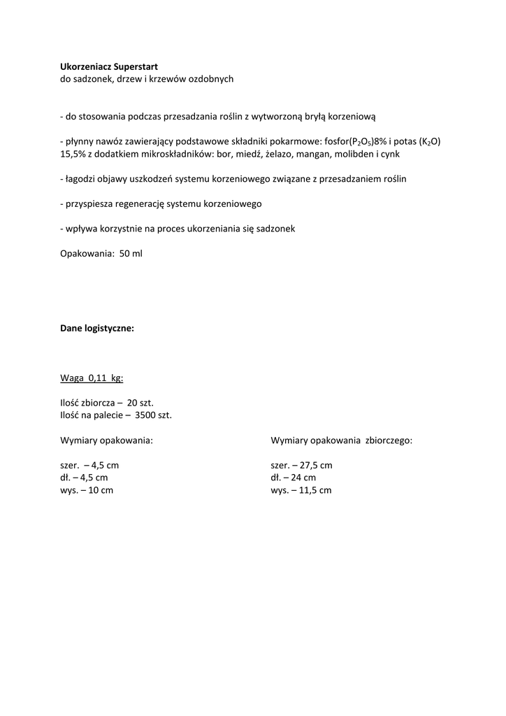 Ukorzeniacz Superstart do sadzonek, drzew i krzewów ozdobnych - do stosowania podczas przesadzania roślin z wytworzoną bryłą korzeniową - płynny nawóz zawierający podstawowe składniki pokarmowe: fosfor(P2O5)8% i potas (K2O) 15,5% z dodatkiem mikroskładników: bor, miedź, żelazo, mangan, molibden i cynk - łagodzi objawy uszkodzeń systemu korzeniowego związane z przesadzaniem roślin - przyspiesza regenerację systemu korzeniowego - wpływa korzystnie na proces ukorzeniania się sadzonek Opakowania: 50 ml Dane logistyczne: Waga 0,11 kg: Ilość zbiorcza – 20 szt. Ilość na palecie – 3500 szt. Wymiary opakowania: Wymiary opakowania zbiorczego: szer. – 4,5 cm dł. – 4,5 cm wys. – 10 cm szer. – 27,5 cm dł. – 24 cm wys. – 11,5 cm